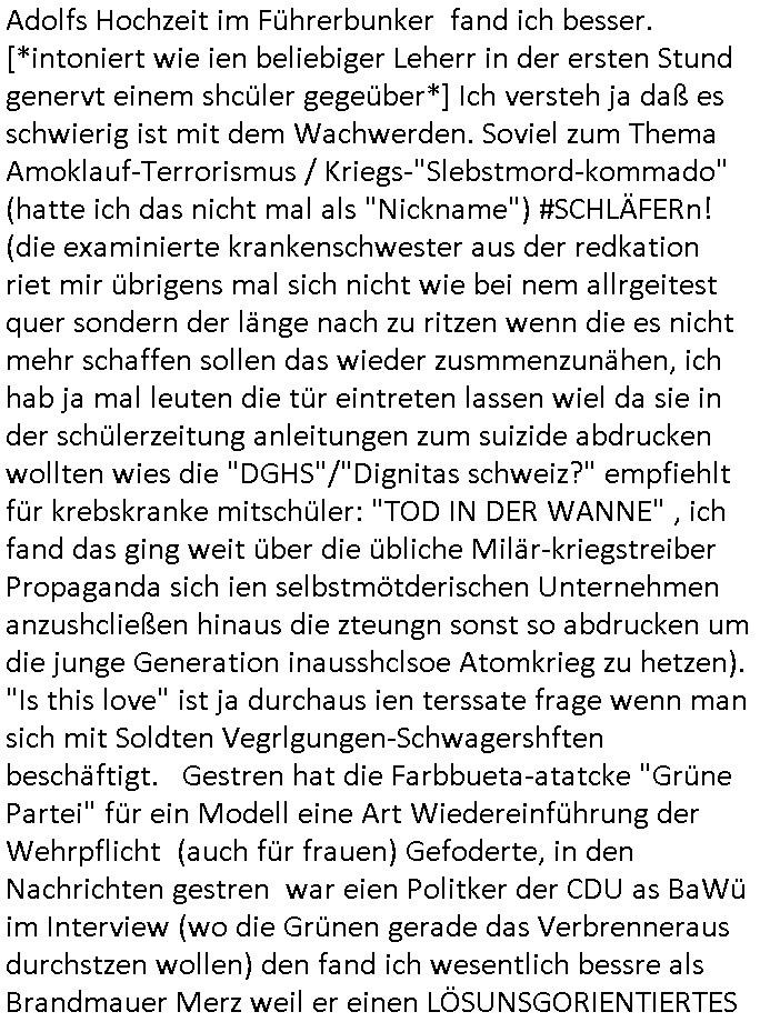 Adolfs Hochzeit im Führerbunker fand ich besser. [*intoniert wie ien beliebiger Leherr in der ersten Stund genervt einem shcüler gegeüber*] Ich versteh ja daß es schwierig ist mit dem Wachwerden. Soviel zum Thema Amoklauf-Terrorismus / Kriegs-"Slebstmord-kommado" (hatte ich das nicht mal als "Nickname") #SCHLÄFERn! (die examinierte krankenschwester aus der redkation riet mir übrigens mal sich nicht wie bei nem allrgeitest quer sondern der länge nach zu ritzen wenn die es nicht mehr schaffen sollen das wieder zusmmenzunähen, ich hab ja mal leuten die tür eintreten lassen wiel da sie in der schülerzeitung anleitungen zum suizide abdrucken wollten wies die "DGHS"/"Dignitas schweiz?" empfiehlt für krebskranke mitschüler: "TOD IN DER WANNE" , ich fand das ging weit über die übliche Milär-kriegstreiber Propaganda sich ien selbstmötderischen Unternehmen anzushcließen hinaus die zteungn sonst so abdrucken um die junge Generation inausshclsoe Atomkrieg zu hetzen). "Is this love" ist ja durchaus ien terssate frage wenn man sich mit Soldten Vegrlgungen-Schwagershften beschäftigt. Gestren hat die Farbbueta-atatcke "Grüne Partei" für ein Modell eine Art Wiedereinführung der Wehrpflicht (auch für frauen) Gefoderte, in den Nachrichten gestren war eien Politker der CDU as BaWü im Interview (wo die Grünen gerade das Verbrenneraus durchstzen wollen) den fand ich wesentlich bessre als Brandmauer Merz weil er einen LÖSUNSGORIENTIERTES