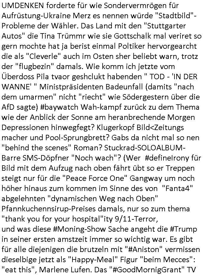 UMDENKEN forderte für wie Sondervermrögen für Aufrüstung-Ukraine Merz es nennen würde "Stadtbild"-Probleme der Wähler. Das Land mit den "Stuttgarter Autos" die Tina Trümmr wie sie Gottschalk mal veriret so gern mochte hat ja berist einmal Poltiker hervorgearcht die als "Cleverle" auch im Osten sher beliebt warn, trotz der "flugbezin" damals. Wie komm ich jetzte vom Überdoss Pila tvaor geshclukt habenden " TOD - 'IN DER WANNE' " Ministpräsidenten Badeunfall (damits "nach dem umarmen" nicht "riecht" wie Södergestern über die AfD sagte) #baywatch Wah-kampf zurück zu dem Thema wie der Anblick der Sonne am heranbrechende Morgen Depressionen hinwegfegt? Klugerkopf Bild<Zeitungs macher und Pool-Sprungbrett? Gabs da nicht mal so nen "behind the scenes" Roman? Stuckrad-SOLOALBUM-Barre SMS-Döpfner "Noch wach"? (Wer #defineIrony für Bild mit dem Aufzug nach oben fährt übt so er Treppen steigt nur für die "Peace Force One" Gangway um noch höher hinaus zum kommen im Sinne des von "Fanta4" abgelehnten "dynamischen Weg nach Oben" Pfannkuchennsirup-Preises damals, nur so zum thema "thank you for your hospital"ity 9/11-Terror, und was diese #Moning-Show Sache angeht die #Trump in seiner ersten amstzeit immer so wichtig war. Es gibt für alle diejenigen die brutzeln mit "#Aniston" vermissen dieselbige jetzt als "Happy-Meal" Figur "beim Mecces": "eat this", Marlene Lufen. Das "#GoodMornigGrant" TV