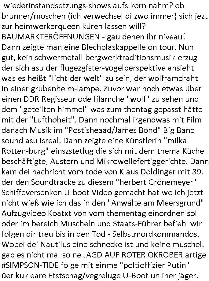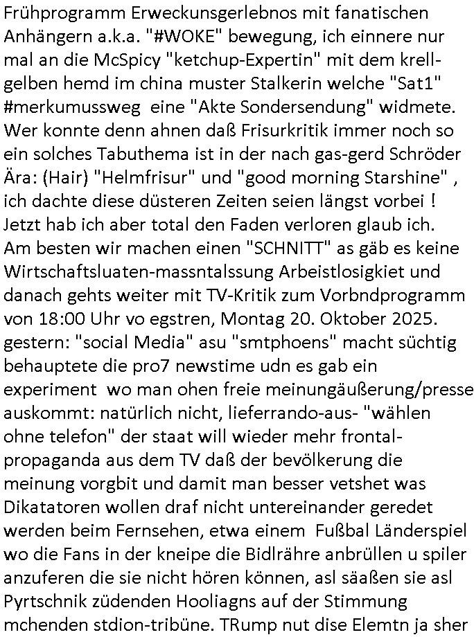 Frühprogramm Erweckunsgerlebnos mit fanatischen Anhängern a.k.a. "#WOKE" bewegung, ich einnere nur mal an die McSpicy "ketchup-Expertin" mit dem krell- gelben hemd im china muster Stalkerin welche "Sat1" #merkumussweg eine "Akte Sondersendung" widmete. Wer konnte denn ahnen daß Frisurkritik immer noch so ein solches Tabuthema ist in der nach gas-gerd Schröder Ära: (Hair) "Helmfrisur" und "good morning Starshine" , ich dachte diese düsteren Zeiten seien längst vorbei ! Jetzt hab ich aber total den Faden verloren glaub ich. Am besten wir machen einen "SCHNITT" as gäb es keine Wirtschaftsluaten-massntalssung Arbeistlosigkiet und danach gehts weiter mit TV-Kritik zum Vorbndprogramm von 18:00 Uhr vo egstren, Montag 20. Oktober 2025. gestern: "social Media" asu "smtphoens" macht süchtig behauptete die pro7 newstime udn es gab ein experiment wo man ohen freie meinungäußerung/presse auskommt: natürlich nicht, lieferrando-aus- "wählen ohne telefon" der staat will wieder mehr frontal-propaganda aus dem TV daß der bevölkerung die meinung vorgbit und damit man besser vetshet was Dikatatoren wollen draf nicht untereinander geredet werden beim Fernsehen, etwa einem Fußbal Länderspiel wo die Fans in der kneipe die Bidlrähre anbrüllen u spiler anzuferen die sie nicht hören können, asl säaßen sie asl Pyrtschnik züdenden Hooliagns auf der Stimmung mchenden stdion-tribüne. TRump nut dise Elemtn ja sher