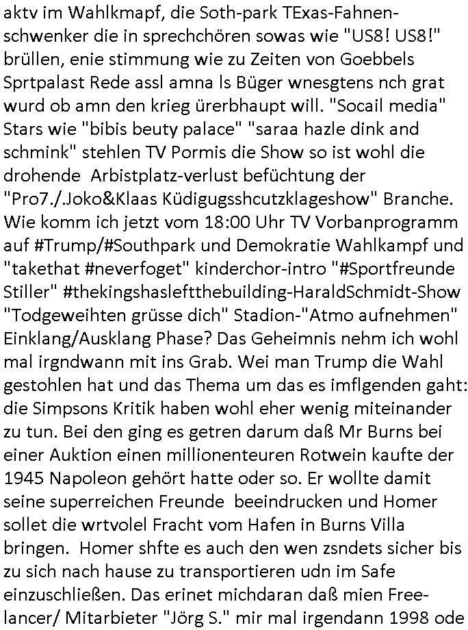 aktv im Wahlkmapf, die Soth-park TExas-Fahnen-schwenker die in sprechchören sowas wie "US8! US8!" brüllen, enie stimmung wie zu Zeiten von Goebbels Sprtpalast Rede assl amna ls Büger wnesgtens nch grat wurd ob amn den krieg ürerbhaupt will. "Socail media" Stars wie "bibis beuty palace" "saraa hazle dink and schmink" stehlen TV Pormis die Show so ist wohl die drohende Arbistplatz-verlust befüchtung der "Pro7./.Joko&Klaas Küdigugsshcutzklageshow" Branche. Wie komm ich jetzt vom 18:00 Uhr TV Vorbanprogramm auf #Trump/#Southpark und Demokratie Wahlkampf und "takethat #neverfoget" kinderchor-intro "#Sportfreunde Stiller" #thekingshasleftthebuilding-HaraldSchmidt-Show "Todgeweihten grüsse dich" Stadion-"Atmo aufnehmen" Einklang/Ausklang Phase? Das Geheimnis nehm ich wohl mal irgndwann mit ins Grab. Wei man Trump die Wahl gestohlen hat und das Thema um das es imflgenden gaht: die Simpsons Kritik haben wohl eher wenig miteinander zu tun. Bei den ging es getren darum daß Mr Burns bei einer Auktion einen millionenteuren Rotwein kaufte der 1945 Napoleon gehört hatte oder so. Er wollte damit seine superreichen Freunde beeindrucken und Homer sollet die wrtvolel Fracht vom Hafen in Burns Villa bringen. Homer shfte es auch den wen zsndets sicher bis zu sich nach hause zu transportieren udn im Safe einzuschließen. Das erinet michdaran daß mien Free-lancer/ Mitarbieter "Jörg S." mir mal irgendann 1998 ode