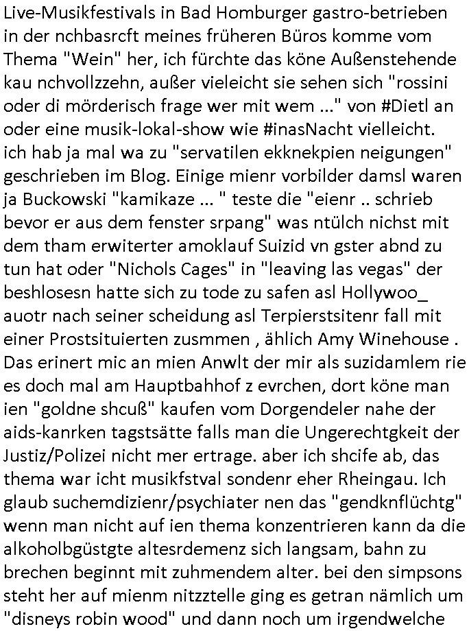 Live-Musikfestivals in Bad Homburger gastro-betrieben in der nchbasrcft meines früheren Büros komme vom Thema "Wein" her, ich fürchte das köne Außenstehende kau nchvollzzehn, außer vieleicht sie sehen sich "rossini oder di mörderisch frage wer mit wem ..." von #Dietl an oder eine musik-lokal-show wie #inasNacht vielleicht. ich hab ja mal wa zu "servatilen ekknekpien neigungen" geschrieben im Blog. Einige mienr vorbilder damsl waren ja Buckowski "kamikaze ... " teste die "eienr .. schrieb bevor er aus dem fenster srpang" was ntülch nichst mit dem tham erwiterter amoklauf Suizid vn gster abnd zu tun hat oder "Nichols Cages" in "leaving las vegas" der beshlosesn hatte sich zu tode zu safen asl Hollywoo_ auotr nach seiner scheidung asl Terpierstsitenr fall mit einer Prostsituierten zusmmen , ählich Amy Winehouse . Das erinert mic an mien Anwlt der mir als suzidamlem rie es doch mal am Hauptbahhof z evrchen, dort köne man ien "goldne shcuß" kaufen vom Dorgendeler nahe der aids-kanrken tagstsätte falls man die Ungerechtgkeit der Justiz/Polizei nicht mer ertrage. aber ich shcife ab, das thema war icht musikfstval sondenr eher Rheingau. Ich glaub suchemdizienr/psychiater nen das "gendknflüchtg" wenn man nicht auf ien thema konzentrieren kann da die alkoholbgüstgte altesrdemenz sich langsam, bahn zu brechen beginnt mit zuhmendem alter. bei den simpsons steht her auf mienm nitzztelle ging es getran nämlich um "disneys robin wood" und dann noch um irgendwelche