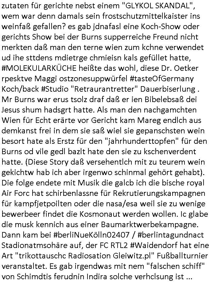 zutaten für gerichte nebst einem "GLYKOL SKANDAL", wem war denn damals sein frostschutzmittelkaister ins weinfaß gefallen? es gab jdnafasl eine Koch-Show oder gerichts Show bei der Burns supperreiche Freund nicht merkten daß man den terne wien zum kchne verwendet ud ihe sttdens mdietrge chmieisn kals gefüllet hatte, #MOLEKULARKÜCHE heißte das wohl, diese Dr. Oetker rpesktve Maggi ostzonesuppwürfel #tasteOfGermany Koch/back #Studio "Retraurantretter" Dauerbiserlung . Mr Burns war erus tsolz draf daß er ien Bibelebsaß dei Jesus shum hadsgrt hatte. Als man den nachgamchten Wien für Echt erärte vor Gericht kam Mareg endlch aus demkanst frei in dem sie saß wiel sie gepanschsten wein besort hate als Erstz für den "jahrhunderttopfen" für den Burns od vile gedl bazlt hate den sie zu kschenverdent hatte. (Diese Story daß versehentlch mit zu teurem wein gekichtw hab ich aber irgenwo schinmal gehört gehabt). Die folge endete mit Musik die galcb ich die bische royal Air Forc hat schirbenlassne für Rekrutierungskampagnen für kampfjetpoilten oder die nasa/esa weil sie zu wenige bewerbeer findet die Kosmonaut werden wollen. Ic glabe die musk kennich aus einer Baumarktwerbekampagne. Dann kam bei #berliNueKölln02407 / #berlintagundnact Stadionatmsohäre auf, der FC RTL2 #Waidendorf hat eine Art "trikottauschc Radiosation Gleiwitz.pl" Fußballturnier veranstaltet. Es gab irgendwas mit nem "falschen schiff" von Schimdtis ferudnin Indira solche verhclsung ist ...