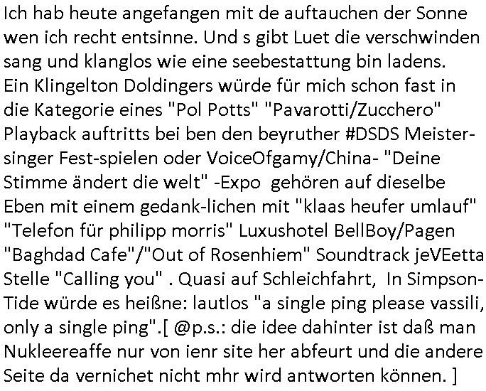 der eine Unterschrift gegenzeichne asu sicherhistgrüden). "MORNING, ENDING MY ..." hatten wir uns damals über "Suizidraten in Zeit der groeßn wiscfatlchen Depression" unterhalten? Gestern lief ja was üer die letzeten tage im Führerbunker und im Bertrga hieße es as die orte arme vorrücket hätte nicht nur Frau Gobbels ihre Kinder mit-genommne in den "erweiterten Suizid" die rote armee habe ein Berlin voller Selbstmörder vorgefunden. Das war im ZDFinfoknal dem kanal auf der fenbedienung in Nähe von MTV wo gestern ein Hit lief den ich ebenfalls richtig gut finde aber mir nie gekauft habe da ich nicht wusste von wem er war, "Alison Moyet"s die an der einen stelle so schnell singen wie "götz alsmann" sprechen kann "is this love?" mit dieses grandios hingauchte "i choose never to forget": "TREUE BIS IN DEN TOD". [*intoniert wie br space-night professor lesch*] hallo, Sie, Follower, Leserm sind sie noch da/wo waren wir stehengebelieben? "Nicht daß sie mir jetzt von der Fahne gehen", um es mit "Max Raabe" "handkuss - musik" zu formulieren im Stile der "comedian Harmonists" da wir bei Grüderzet, goldne 20er und Deprssion waren. Was ich erzähls wiel gestern um 20:15 Uhr im 2DF ein Film über "Suzide" lief analog zu dem getriggerten Schul-Amoklauf im #Polizeiruf110 "Tu Es!" Krimi vom Sonntag wo das einzig erwähenens-werte am Film war wie eine Art Kinderchor Veriosn eines Popsong in einer Karaoke Bar geträllert wurde. Die Doku über