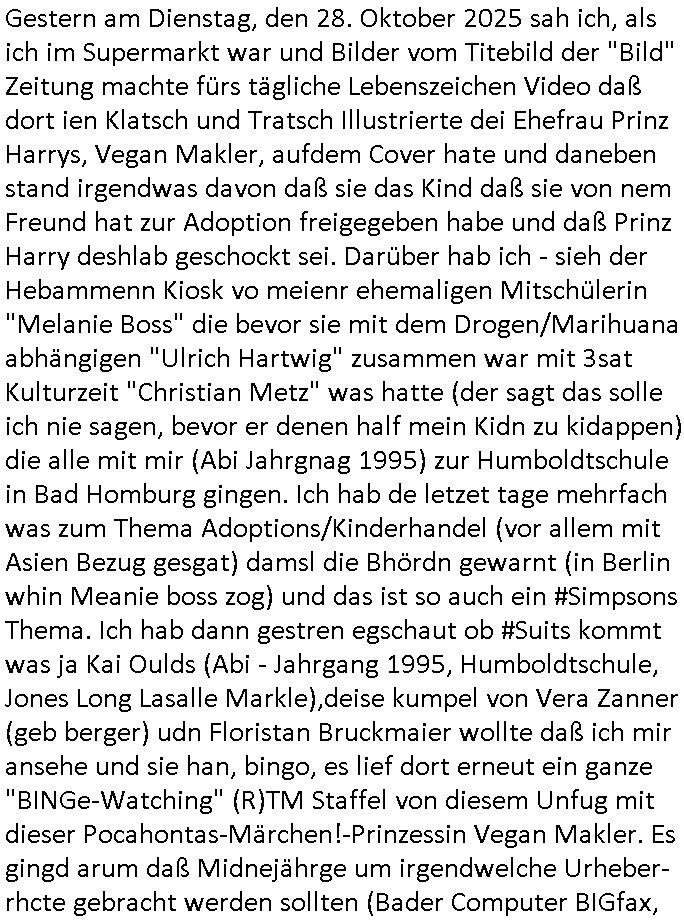 Gestern am Dienstag, den 28. Oktober 2025 sah ich, als ich im Supermarkt war und Bilder vom Titebild der "Bild" Zeitung machte fürs tägliche Lebenszeichen Video daß dort ien Klatsch und Tratsch Illustrierte dei Ehefrau Prinz Harrys, Vegan Makler, aufdem Cover hate und daneben stand irgendwas davon daß sie das Kind daß sie von nem Freund hat zur Adoption freigegeben habe und daß Prinz Harry deshlab geschockt sei. Darüber hab ich - sieh der Hebammenn Kiosk vo meienr ehemaligen Mitschülerin "Melanie Boss" die bevor sie mit dem Drogen/Marihuana abhängigen "Ulrich Hartwig" zusammen war mit 3sat Kulturzeit "Christian Metz" was hatte (der sagt das solle ich nie sagen, bevor er denen half mein Kidn zu kidappen) die alle mit mir (Abi Jahrgnag 1995) zur Humboldtschule in Bad Homburg gingen. Ich hab de letzet tage mehrfach was zum Thema Adoptions/Kinderhandel (vor allem mit Asien Bezug gesgat) damsl die Bhördn gewarnt (in Berlin whin Meanie boss zog) und das ist so auch ein #Simpsons Thema. Ich hab dann gestren egschaut ob #Suits kommt was ja Kai Oulds (Abi - Jahrgang 1995, Humboldtschule, Jones Long Lasalle Markle),deise kumpel von Vera Zanner (geb berger) udn Floristan Bruckmaier wollte daß ich mir ansehe und sie han, bingo, es lief dort erneut ein ganze "BINGe-Watching" (R)TM Staffel von diesem Unfug mit dieser Pocahontas-Märchen!-Prinzessin Vegan Makler. Es gingd arum daß Midnejährge um irgendwelche Urheber-rhcte gebracht werden sollten (Bader Computer BIGfax,