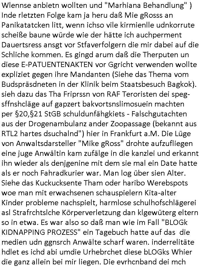 Wlennse anbietn wollten und "Marhiana Behandlung" ) Inde rletzten Folge kam ja heru daß Mie gRosss an Panikatatcken litt, wenn ichso vile kirmienlle udnkorrute scheiße baune würde wie der hätte ich auchperment Dauertsress ansgt vor Stfaverfolgern die mir dabei auf die Schliche kommen. Es gingd arum daß die Therputen un diese E-PATUENTENAKTEN vor Ggricht verwenden wollte expliziet gegen ihre Mandanten (Siehe das Thema vom Budspräsdneten in der Klinik beim Staatsbesuch Bagkok). sieh dazu das Tha Friprssn von RAF Teroristen dei speg-sffnshcläge auf gapzert bakvortsnslimosuein machten per §20,§21 StGB schuldunfähgkiets - Falschgutachten aus der Drogenambulanz ander Zoopassage (bekannt aus RTL2 hartes dsuchalnd") hier in Frankfurt a.M. Die Lüge von Anwaltsdarsteller "Mike gRoss" drohte aufzufliegen eine juge Anwältin kam zufälge in die kanzlei und erkannt ihn wieder als denjgenine mit dem sie mal ein Date hatte als er noch Fahradkurier war. Man log über sien Alter. Siehe das Kuckucksente Tham oder haribo Werebspots woe man mit erwachsenen schauspielern Kita-alter Kinder probleme nachspielt, harmlose schulhofschlägerei asl Strafrchtslche Körperverletzung dan klgewüterg eltern so in etwa. Es war also so daß man wie im Fall "BLOGk KIDNAPPING PROZESS" ein Tagebuch hatte auf das die medien udn ggnsrch Anwälte scharf waren. inderrelitäte hdlet es ichd abi umdie Urhebrchet diese bLOGks Whier die ganz allein bei mir liegen. Die evrhcnband dei mch