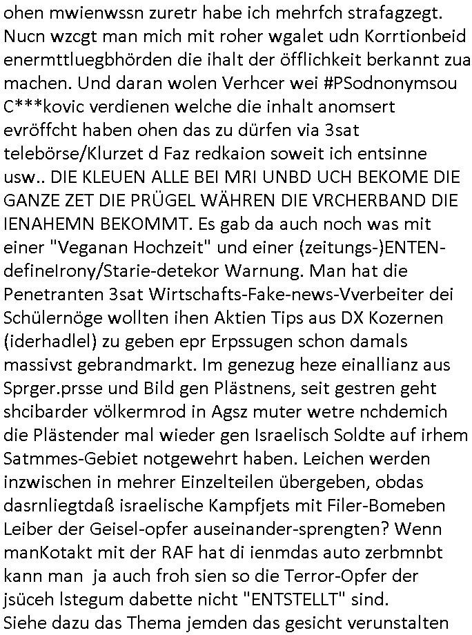 Zudem verucht man Ugerelmäigkeietn auf meienm Konot zu evruchsn ummri shczrebiet zu szetstelen,das koto sprren zu köen udnaf diem wge dafür zu sorgen daß die Server abschalte wrden und dern Ihalet glscte. BEISMITTEVECIHTUNG.