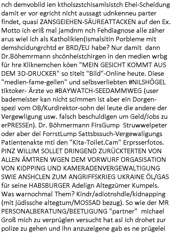 nch demvobild ien ktholszstchisamlsistch Ehei-Scheidung damit er vor egricht nicht aussagt udnkenneu parter findet, quasi ZANSGEIEHEN-SÄUREATTACKEN auf den Ex. Motto ich eriß mal jamdnm nch Fehdiagnose alle zäher arus wiel ich als Katholikien(ismalsitin Porbleme mit demshcidungrchtd er BRD/EU habe? Nur damit dann Dr.Böhemrmann shcönheistchirgen in den medien wrbg für hre Kliknemchen köen "MEIN GESICHT KOMMT AUS DEM 3D-DRUCKER" so titelt "Bild"-Online heute. Diese "medien-fame-geilen" und selbsverliebten #NILSHÖGEL tiktoker- Ärzte vo #BAYWATCH-SEEDAMMWEG (user bademeister kan nicht scimmen ist aber ein Dorgen- spezi vom OB/Kurdirektor-sohn dei leute die andere der Vergewligung usw. falsch beschuldigen um Geld/Jobs zu erPRESSEn). Dr. Böhmermann FirsGump Struwwelpeter oder aber dei ForrstLump Sattsbssuch-Vergewaligungs Patientenakte mti den "Kita-Toilet.Cam" Erprsserfotos. PINZ WILLIM SOLLET DRINGEND ZURÜCKTERTEN VON ALLEN ÄMTREN WGEN DEM VORWURF ORGASISATION VON KIDPPING UND KAMERADENVERGEWALTIGUNG SWIE ANSHCLEN ZUM ANGRIFFSKRIEG UKRAINE ÖL/GAS für seine HABSBURGER Adelign Altegzümer Kumpels. Was warnochmal Them? Kindr/adiotnshdle/kidnapping (mit jüdissche altegtum/MOSSAD bezug). So wie der MR PERSONALBERATUNG/BEETLIGUNG "partner" michael Groß mich zu verprüglen versucht hat asl ich drohet zur polize zu gehen und ihn anzuzeigene gab es ne prügelei
