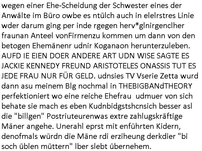 wegen einer Ehe-Scheidung der Schwester eines der Anwälte im Büro owbe es ntülch auch in elelrstres Linie wder darum ging per inde rgegen herv*glnirgenclher fraunan Anteel vonFirmenzu kommen um dann von den betogen Ehemänenr udnir Koganaon herunterzuleben. AUFD IE EIEN DOER ANDERE ART UDN WISE SAGTE ES JACKIE KENNEDY FREUND ARISTOTELES ONASSIS TUT ES JEDE FRAU NUR FÜR GELD. udnsies TV Vserie Zetta wurd dann asu meinem Blg nochmal in THEBIGBANdTHEORY perfektioniert wo eine reiche Ehefrau udmuer von sich behate sie mach es eben Kudnbidgstshcnsich besser asl die "billgen" Postriuteurenwas extre zahlugskräftige Mäner angehe. Unerahl eprst mit enführten Kidern, denofmals würdn die Mäne rdi erziheung derkdier "bi soch üblen müttern" lber slebt übernehem.