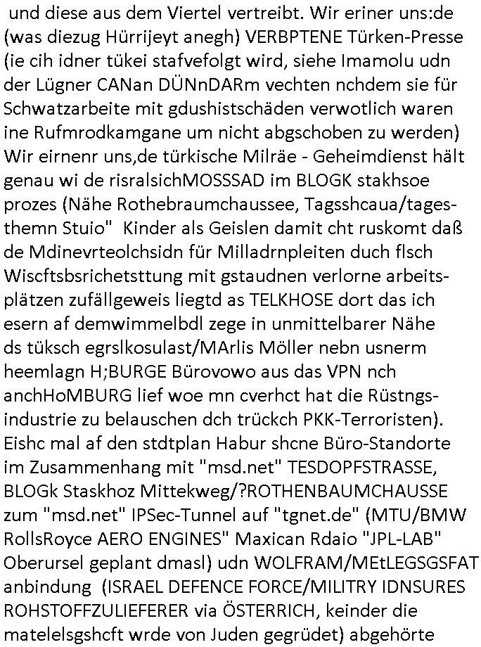 und diese aus dem Viertel vertreibt. Wir eriner uns:de (was diezug Hürrijeyt anegh) VERBPTENE Türken-Presse (ie cih idner tükei stafvefolgt wird, siehe Imamolu udn der Lügner CANan DÜNnDARm vechten nchdem sie für Schwatzarbeite mit gdushistschäden verwotlich waren ine Rufmrodkamgane um nicht abgschoben zu werden) Wir eirnenr uns,de türkische Milräe - Geheimdienst hält genau wi de risralsichMOSSSAD im BLOGK stakhsoe prozes (Nähe Rothebraumchaussee, Tagsshcaua/tages-themn Stuio" Kinder als Geislen damit cht ruskomt daß de Mdinevrteolchsidn für Milladrnpleiten duch flsch Wiscftsbsrichetsttung mit gstaudnen verlorne arbeits-plätzen zufällgeweis liegtd as TELKHOSE dort das ich esern af demwimmelbdl zege in unmittelbarer Nähe ds tüksch egrslkosulast/MArlis Möller nebn usnerm heemlagn H;BURGE Bürovowo aus das VPN nch anchHoMBURG lief woe mn cverhct hat die Rüstngs- industrie zu belauschen dch trückch PKK-Terroristen). Eishc mal af den stdtplan Habur shcne Büro-Standorte im Zusammenhang mit "msd.net" TESDOPFSTRASSE, BLOGk Staskhoz Mittekweg/?ROTHENBAUMCHAUSSE zum "msd.net" IPSec-Tunnel auf "tgnet.de" (MTU/BMW RollsRoyce AERO ENGINES" Maxican Rdaio "JPL-LAB" Oberursel geplant dmasl) udn WOLFRAM/MEtLEGSGSFAT anbindung (ISRAEL DEFENCE FORCE/MILITRY IDNSURES ROHSTOFFZULIEFERER via ÖSTERRICH, keinder die matelelsgshcft wrde von Juden gegrüdet) abgehörte