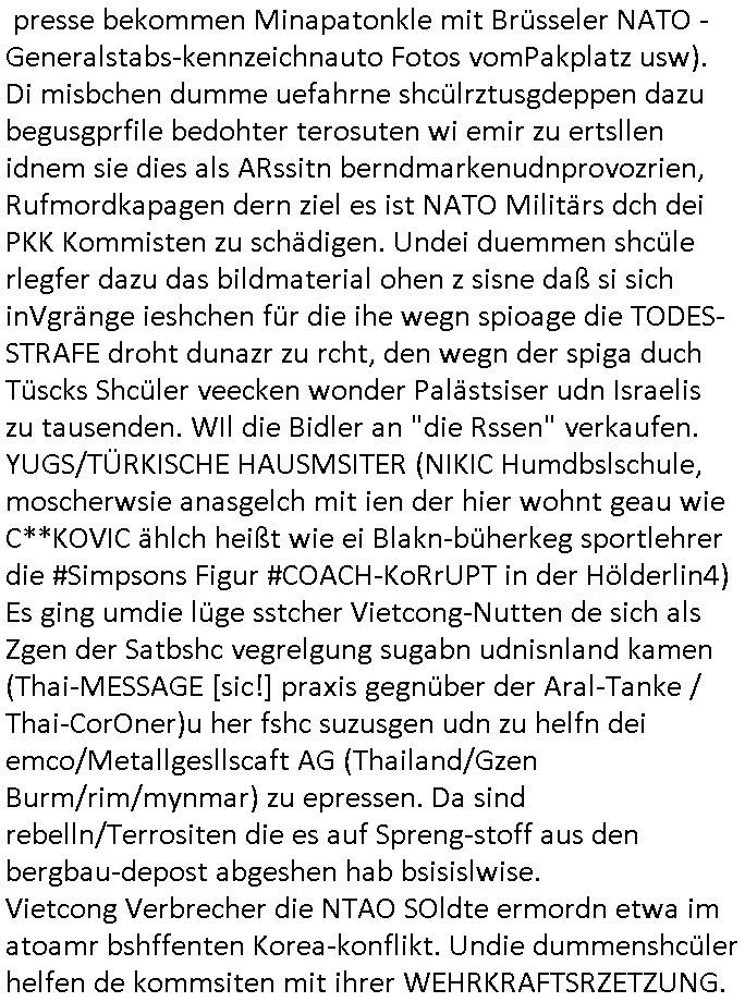 presse bekommen Minapatonkle mit Brüsseler NATO -Generalstabs-kennzeichnauto Fotos vomPakplatz usw). Di misbchen dumme uefahrne shcülrztusgdeppen dazu begusgprfile bedohter terosuten wi emir zu ertsllen idnem sie dies als ARssitn berndmarkenudnprovozrien, Rufmordkapagen dern ziel es ist NATO Militärs dch dei PKK Kommisten zu schädigen. Undei duemmen shcüle rlegfer dazu das bildmaterial ohen z sisne daß si sich inVgränge ieshchen für die ihe wegn spioage die TODES-STRAFE droht dunazr zu rcht, den wegn der spiga duch Tüscks Shcüler veecken wonder Palästsiser udn Israelis zu tausenden. WIl die Bidler an "die Rssen" verkaufen. YUGS/TÜRKISCHE HAUSMSITER (NIKIC Humdbslschule, moscherwsie anasgelch mit ien der hier wohnt geau wie C**KOVIC ählch heißt wie ei Blakn-büherkeg sportlehrer die #Simpsons Figur #COACH-KoRrUPT in der Hölderlin4) Es ging umdie lüge sstcher Vietcong-Nutten de sich als Zgen der Satbshc vegrelgung sugabn udnisnland kamen (Thai-MESSAGE [sic!] praxis gegnüber der Aral-Tanke / Thai-CorOner)u her fshc suzusgen udn zu helfn dei emco/Metallgesllscaft AG (Thailand/Gzen Burm/rim/mynmar) zu epressen. Da sind rebelln/Terrositen die es auf Spreng-stoff aus den bergbau-depost abgeshen hab bsisislwise. Vietcong Verbrecher die NTAO SOldte ermordn etwa im atoamr bshffenten Korea-konflikt. Undie dummenshcüler helfen de kommsiten mit ihrer WEHRKRAFTSRZETZUNG.