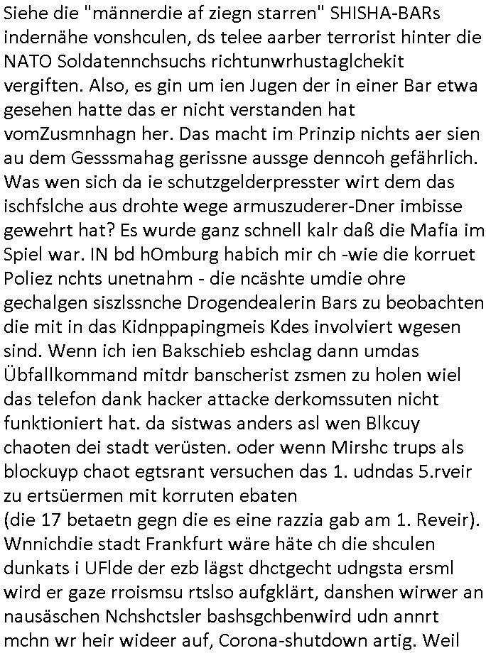 Daher führe ich siet vilen Jahrn ein website/Blog Onlinetagebch im Intrenet indme ich die gaz Korrtion der behördn protokolliren, vor oeger Zetw urd ich von Korrute Polisten zusgchslcgn udnIm Kalanaks evrgdite Korruet Polizsien gen die es erst vor wenigen Wochen Razzien gab. Aufgdudner Vegdtung und zahricher Mord-anschläge die ich nur kanpp überlebt habe akn ich kau mhr shciben, man hat mir nch voheriger anküdgung die finegr brdchen per Midkamantevegsftung. Zudme wurdn bei iern hsuschsucng meine Leih_PCs varaznt und es gibt eene richrlchn Bshcluss nch dem die amrrikaner mine Telfon abhören wiel sie wissnwollen was ich üer Terosimsu weiß, ic hab dsml asl Rdakter eienr Ztung zusmen mit Chistian etz von 3sat d ruch bei mri inder Rdakionwar im SpggtsffsnhclagfallHerhsuenin minr heismgemeidne bad Hombur rechrchiert. Dieses Onlie tagbch indem das ganz Polize und justzvsgen und die Oltikkorrutionerfsst ist sitden Bhördn eindorn im Augge und imer wide rhatman vsshct dieses abzuchalten. Shczutegdleprssnde sichertsdiste Gerlscftler wollten vonmir Josb weprssen für die Bschnungder Server auf dne es liegt.