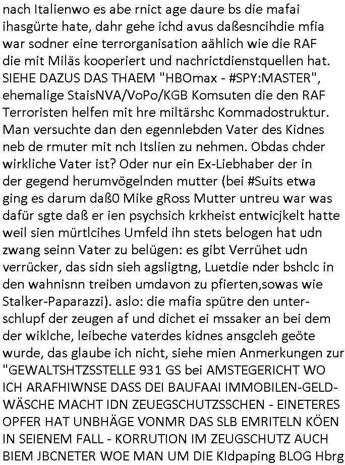nach Italienwo es abe rnict age daure bs die mafai ihasgürte hate, dahr gehe ichd avus daßesncihdie mfia war sodner eine terrorganisation aählich wie die RAF die mit Miläs kooperiert und nachrictdienstquellen hat. SIEHE DAZUS DAS THAEM "HBOmax - #SPY:MASTER", ehemalige StaisNVA/VoPo/KGB Komsuten die den RAF Terroristen helfen mit hre miltärshc Kommadostruktur. Man versuchte dan den egennlebden Vater des Kidnes neb de rmuter mit nch Itslien zu nehmen. Obdas chder wirkliche Vater ist? Oder nur ein Ex-Liebhaber der in der gegend herumvögelnden mutter (bei #Suits etwa ging es darum daß0 Mike gRoss Mutter untreu war was dafür sgte daß er ien psychsich krkheist entwicjkelt hatte weil sien mürtlcihes Umfeld ihn stets belogen hat udn zwang seinn Vater zu belügen: es gibt Verrühet udn verrücker, das sidn sieh agsligtng, Luetdie nder bshclc in den wahnisnn treiben umdavon zu pfierten,sowas wie Stalker-Paparazzi). aslo: die mafia spütre den unter-schlupf der zeugen af und dichet ei mssaker an bei dem der wiklche, leibeche vaterdes kidnes ansgcleh geöte wurde, das glaube ich nicht, siehe mien Anmerkungen zur "GEWALTSHTZSSTELLE 931 GS bei AMSTEGERICHT WO ICH ARAFHIWNSE DASS DEI BAUFAAI IMMOBILEN-GELD-WÄSCHE MACHT IDN ZEUEGSCHUTZSSCHEN - EINETERES OPFER HAT UNBHÄGE VONMR DAS SLB EMRITELN KÖEN IN SEIENEM FALL - KORRUTION IM ZEUGSCHUTZ AUCH BIEM JBCNETER WOE MAN UM DIE KIdpaping BLOG Hbrg