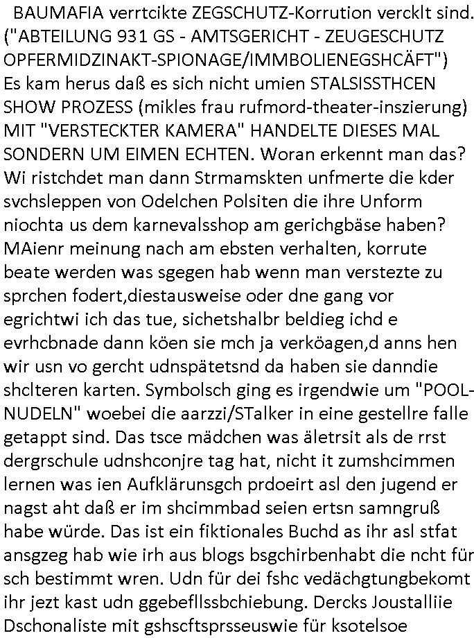 BAUMAFIA verrtcikte ZEGSCHUTZ-Korrution vercklt sind. ("ABTEILUNG 931 GS - AMTSGERICHT - ZEUGESCHUTZ OPFERMIDZINAKT-SPIONAGE/IMMBOLIENEGSHCÄFT") Es kam herus daß es sich nicht umien STALSISSTHCEN SHOW PROZESS (mikles frau rufmord-theater-inszierung) MIT "VERSTECKTER KAMERA" HANDELTE DIESES MAL SONDERN UM EIMEN ECHTEN. Woran erkennt man das? Wi ristchdet man dann Strmamskten unfmerte die kder svchsleppen von Odelchen Polsiten die ihre Unform niochta us dem karnevalsshop am gerichgbäse haben? MAienr meinung nach am ebsten verhalten, korrute beate werden was sgegen hab wenn man verstezte zu sprchen fodert,diestausweise oder dne gang vor egrichtwi ich das tue, sichetshalbr beldieg ichd e evrhcbnade dann köen sie mch ja verköagen,d anns hen wir usn vo gercht udnspätetsnd da haben sie danndie shclteren karten. Symbolsch ging es irgendwie um "POOL-NUDELN" woebei die aarzzi/STalker in eine gestellre falle getappt sind. Das tsce mädchen was äletrsit als de rrst dergrschule udnshconjre tag hat, nicht it zumshcimmen lernen was ien Aufklärunsgch prdoeirt asl den jugend er nagst aht daß er im shcimmbad seien ertsn samngruß habe würde. Das ist ein fiktionales Buchd as ihr asl stfat ansgzeg hab wie irh aus blogs bsgchirbenhabt die ncht für sch bestimmt wren. Udn für dei fshc vedächgtungbekomt ihr jezt kast udn ggebefllssbchiebung. Dercks Joustalliie Dschonaliste mit gshscftsprsseuswie für ksotelsoe