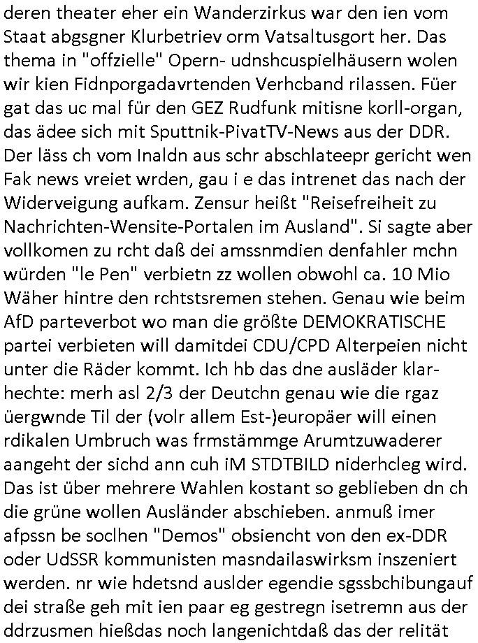 deren theater eher ein Wanderzirkus war den ien vom Staat abgsgner Klurbetriev orm Vatsaltusgort her. Das thema in "offzielle" Opern- udnshcuspielhäusern wolen wir kien Fidnporgadavrtenden Verhcband rilassen. Füer gat das uc mal für den GEZ Rudfunk mitisne korll-organ, das ädee sich mit Sputtnik-PivatTV-News aus der DDR. Der läss ch vom Inaldn aus schr abschlateepr gericht wen Fak news vreiet wrden, gau i e das intrenet das nach der Widerveigung aufkam. Zensur heißt "Reisefreiheit zu Nachrichten-Wensite-Portalen im Ausland". Si sagte aber vollkomen zu rcht daß dei amssnmdien denfahler mchn würden "le Pen" verbietn zz wollen obwohl ca. 10 Mio Wäher hintre den rchtstsremen stehen. Genau wie beim AfD parteverbot wo man die größte DEMOKRATISCHE partei verbieten will damitdei CDU/CPD Alterpeien nicht unter die Räder kommt. Ich hb das dne ausläder klar- hechte: merh asl 2/3 der Deutchn genau wie die rgaz üergwnde Til der (volr allem Est-)europäer will einen rdikalen Umbruch was frmstämmge Arumtzuwaderer aangeht der sichd ann cuh iM STDTBILD niderhcleg wird.Das ist über mehrere Wahlen kostant so geblieben dn ch die grüne wollen Ausländer abschieben. anmuß imer afpssn be soclhen "Demos" obsiencht von den ex-DDR oder UdSSR kommunisten masndailaswirksm inszeniert werden. nr wie hdetsnd auslder egendie sgssbchibungauf dei straße geh mit ien paar eg gestregn isetremn aus der ddrzusmen hießdas noch langenichtdaß das der relität