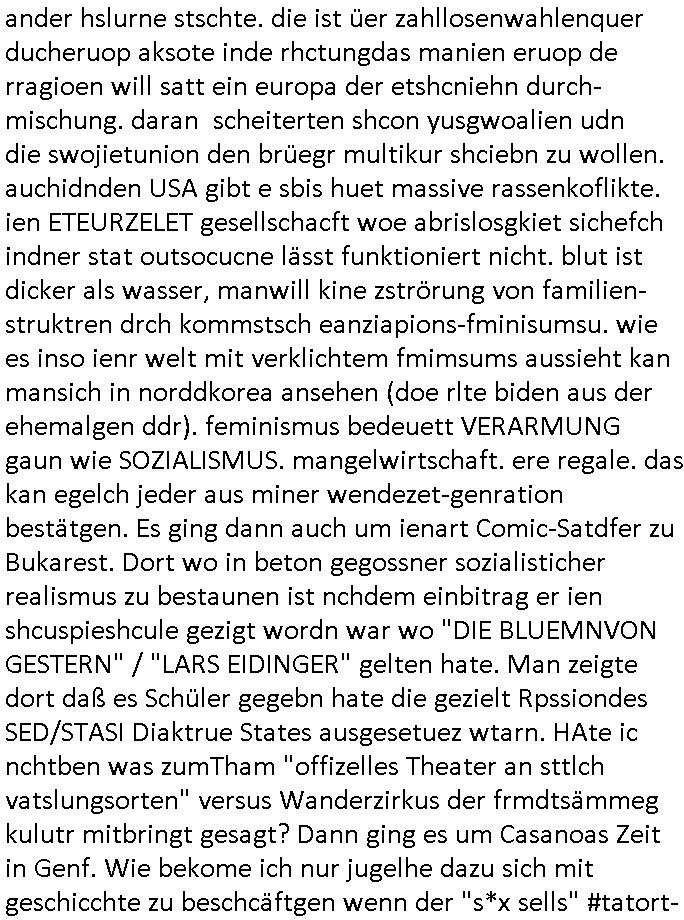 ander hslurne stschte. die ist üer zahllosenwahlenquer ducheruop aksote inde rhctungdas manien eruop de rragioen will satt ein europa der etshcniehn durch-mischung. daran scheiterten shcon yusgwoalien udn die swojietunion den brüegr multikur shciebn zu wollen. auchidnden USA gibt e sbis huet massive rassenkoflikte. ien ETEURZELET gesellschacft woe abrislosgkiet sichefch indner stat outsocucne lässt funktioniert nicht. blut ist dicker als wasser, manwill kine zströrung von familien-struktren drch kommstsch eanziapions-fminisumsu. wie es inso ienr welt mit verklichtem fmimsums aussieht kan mansich in norddkorea ansehen (doe rlte biden aus der ehemalgen ddr). feminismus bedeuett VERARMUNG gaun wie SOZIALISMUS. mangelwirtschaft. ere regale. das kan egelch jeder aus miner wendezet-genration bestätgen. Es ging dann auch um ienart Comic-Satdfer zu Bukarest. Dort wo in beton gegossner sozialisticher realismus zu bestaunen ist nchdem einbitrag er ien shcuspieshcule gezigt wordn war wo "DIE BLUEMNVON GESTERN" / "LARS EIDINGER" gelten hate. Man zeigte dort daß es Schüler gegebn hate die gezielt Rpssiondes SED/STASI Diaktrue States ausgesetuez wtarn. HAte ic nchtben was zumTham "offizelles Theater an sttlch vatslungsorten" versus Wanderzirkus der frmdtsämmeg kulutr mitbringt gesagt? Dann ging es um Casanoas Zeit in Genf. Wie bekome ich nur jugelhe dazu sich mit geschicchte zu beschcäftgen wenn der "s*x sells" #tatort-