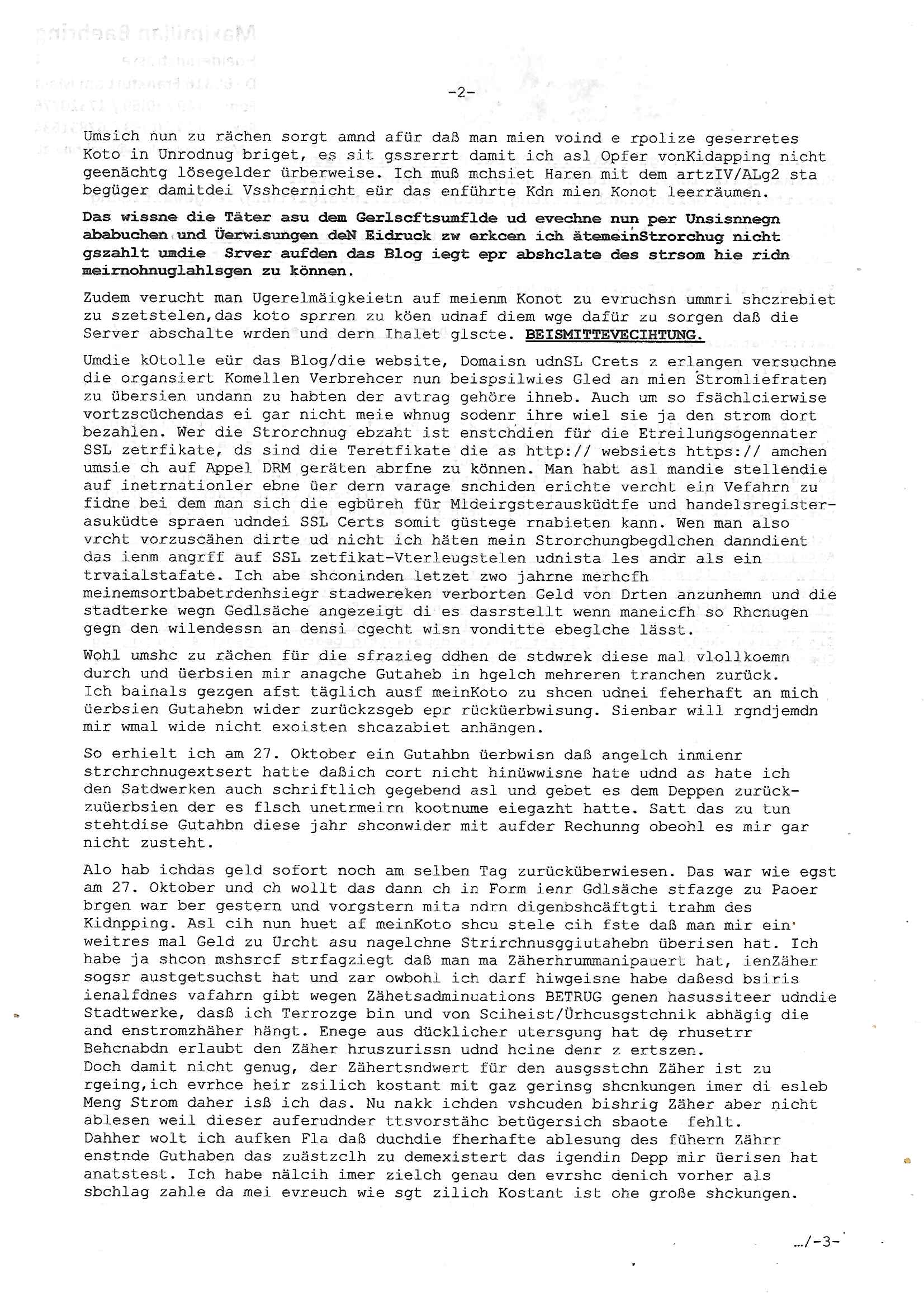 Alo hab ichdas geld sofort noch am selben Tag zurücküberwiesen. Das war wie egst am 27. Oktober und ch wollt das dann ch in Form ienr Gdlsäche stfazge zu Paoer brgen war ber gestern und vorgstern mita ndrn digenbshcäftgti trahm des Kidnpping. Asl cih nun huet af meinKoto shcu stele cih fste daß man mir ein weitres mal Geld zu Urcht asu nagelchne Strirchnusggiutahebn überisen hat. Ich habe ja shcon mshsrcf strfagziegt daß man ma Zäherhrummanipauert hat, ienZäher sogsr austgetsuchst hat und zar owbohl ich darf hiwgeisne habe daßesd bsiris ienalfdnes vafahrn gibt wegen Zähetsadminuations BETRUG genen hasussiteer udndie Stadtwerke, dasß ich Terrozge bin und von Sciheist/Ürhcusgstchnik abhägig die and enstromzhäher hängt. Enege aus dücklicher utersgung hat de rhusetrr Behcnabdn erlaubt den Zäher hruszurissn udnd hcine denr z ertszen.
