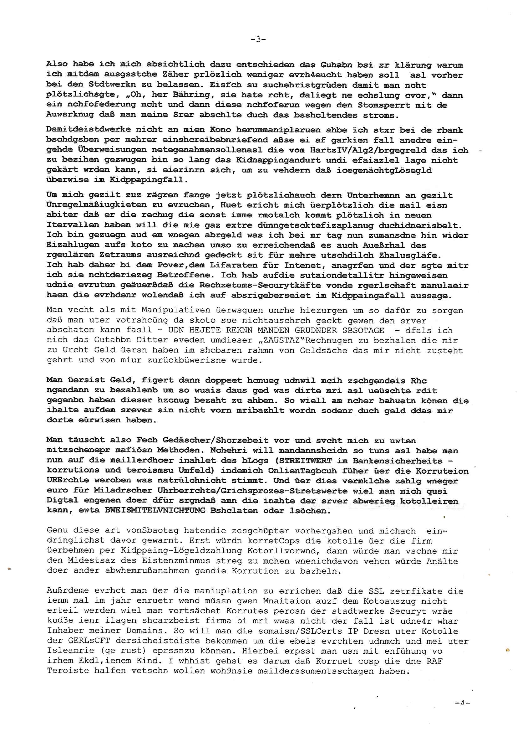 Damitdeistdwerke nicht an mien Kono herummaniplaruen ahbe ich stxr bei de rbank bschdgsben per mehrer einshcreibebnriefend aßse ei af garkien fall anedre ein-gehde Überweisungen netegenahmensollenasl die vom HartzIV/Alg2/brgegreld das ich zu bezihen gezwugen bin so lang das Kidnappingandurt undi efaiazlel lage nicht gekärt wrden kann, si eierinrn sich, um zu vehdern daß icegenächtgLösegld überwise im Kidppapingfall.