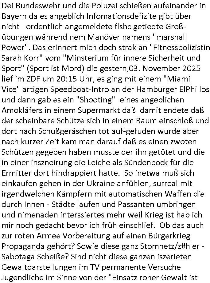 Dei Bundeswehr und die Poluzei schießen aufeinander in Bayern da es angeblich Infomationsdefizite gibt über nicht ordentlich angemeldete flshc getiedte Groß-übungen während nem Manöver namens "marshall Power". Das erinnert mich doch strak an "Fitnesspolizistin Sarah Korr" vom "Minsterium für innere Sicherheit und Sport" (Sport ist Mord) die gestern,03. November 2025 lief im ZDF um 20:15 Uhr, es ging mit einem "Miami Vice" artigen Speedboat-Intro an der Hamburger ElPhi los und dann gab es ein "Shooting" eines angeblichen Amokläfers in einem Supermarkt daß damit endete daß der scheinbare Schütze sich in einem Raum einschloß und dort nach Schußgeräschen tot auf-gefuden wurde aber nach kurzer Zeit kam man darauf daß es einen zwoten Schützen gegeben haben musste der ihn getötet und die in einer inszneirung die Leiche als Sündenbock für die Ermitter dort hindrappiert hatte. So inetwa muß sich einkaufen gehen in der Ukraine anfühlen, surreal mit irgendwelchen Kämpfern mit automatischen Waffen die durch Innen - Städte laufen und Passanten umbringen und nimenaden interssiertes mehr weil Krieg ist hab ich mir noch gedacht bevor ich früh einschlief. Ob das auch zur roten Armee Vorbereitung auf einen Bürgerkrieg Propaganda gehört? Sowie diese ganz Stomnetz/z#hler - Sabotaga Scheiße? Sind nicht diese ganzen iszerieten Gewaltdarstellungen im TV permanente Versuche Jugendliche im Sinne von der "Einsatz roher Gewalt ist