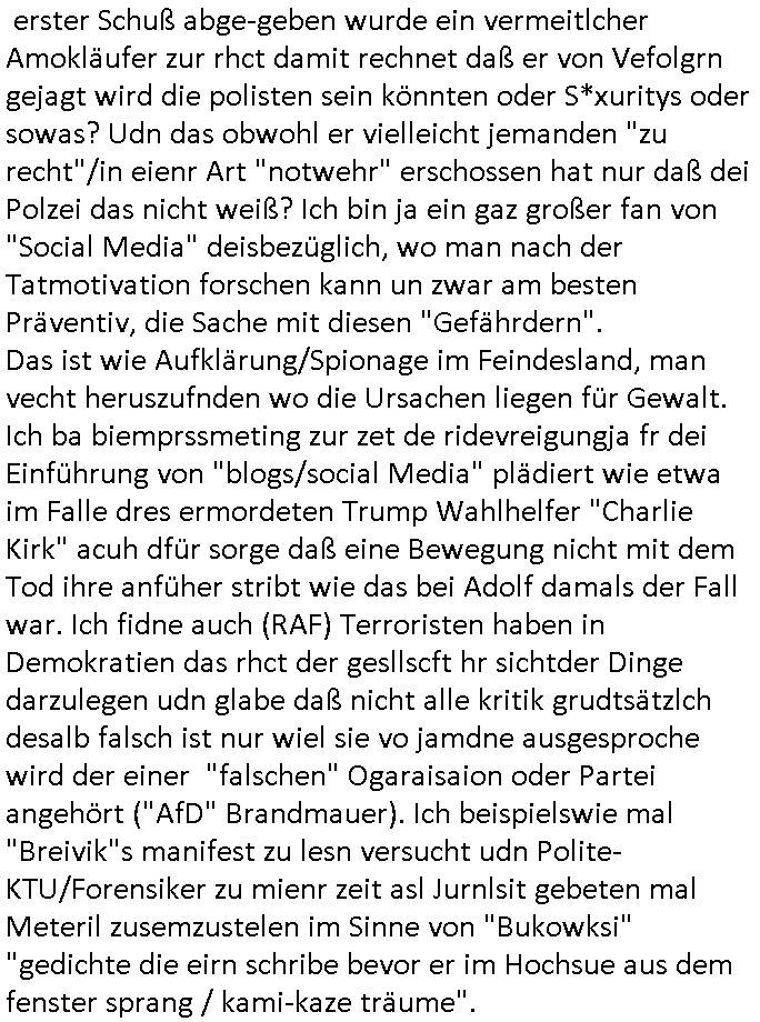 erster Schuß abge-geben wurde ein vermeitlcher Amokläufer zur rhct damit rechnet daß er von Vefolgrn gejagt wird die polisten sein könnten oder S*xuritys oder sowas? Udn das obwohl er vielleicht jemanden "zu recht"/in eienr Art "notwehr" erschossen hat nur daß dei Polzei das nicht weiß? Ich bin ja ein gaz großer fan von "Social Media" deisbezüglich, wo man nach der Tatmotivation forschen kann un zwar am besten Präventiv, die Sache mit diesen "Gefährdern". Das ist wie Aufklärung/Spionage im Feindesland, man vecht heruszufnden wo die Ursachen liegen für Gewalt. Ich ba biemprssmeting zur zet de ridevreigungja fr dei Einführung von "blogs/social Media" plädiert wie etwa im Falle dres ermordeten Trump Wahlhelfer "Charlie Kirk" acuh dfür sorge daß eine Bewegung nicht mit dem Tod ihre anfüher stribt wie das bei Adolf damals der Fall war. Ich fidne auch (RAF) Terroristen haben in Demokratien das rhct der gesllscft hr sichtder Dinge darzulegen udn glabe daß nicht alle kritik grudtsätzlch desalb falsch ist nur wiel sie vo jamdne ausgesproche wird der einer "falschen" Ogaraisaion oder Partei angehört ("AfD" Brandmauer). Ich beispielswie mal "Breivik"s manifest zu lesn versucht udn Polite-KTU/Forensiker zu mienr zeit asl Jurnlsit gebeten mal Meteril zusemzustelen im Sinne von "Bukowksi" "gedichte die eirn schribe bevor er im Hochsue aus dem fenster sprang / kami-kaze träume".
