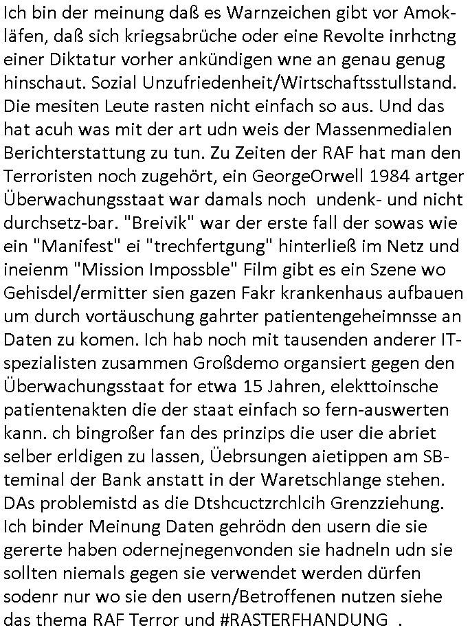 Ich bin der meinung daß es Warnzeichen gibt vor Amok- läfen, daß sich kriegsabrüche oder eine Revolte inrhctng einer Diktatur vorher ankündigen wne an genau genug hinschaut. Sozial Unzufriedenheit/Wirtschaftsstullstand. Die mesiten Leute rasten nicht einfach so aus. Und das hat acuh was mit der art udn weis der Massenmedialen Berichterstattung zu tun. Zu Zeiten der RAF hat man den Terroristen noch zugehört, ein GeorgeOrwell 1984 artger Überwachungsstaat war damals noch undenk- und nicht durchsetz-bar. "Breivik" war der erste fall der sowas wie ein "Manifest" ei "trechfertgung" hinterließ im Netz und ineienm "Mission Impossble" Film gibt es ein Szene wo Gehisdel/ermitter sien gazen Fakr krankenhaus aufbauen um durch vortäuschung gahrter patientengeheimnsse an Daten zu komen. Ich hab noch mit tausenden anderer IT- spezialisten zusammen Großdemo organsiert gegen den Überwachungsstaat for etwa 15 Jahren, elekttoinsche patientenakten die der staat einfach so fern-auswerten kann. ch bingroßer fan des prinzips die user die abriet selber erldigen zu lassen, Üebrsungen aietippen am SB-teminal der Bank anstatt in der Waretschlange stehen. DAs problemistd as die Dtshcuctzrchlcih Grenzziehung. Ich binder Meinung Daten gehrödn den usern die sie gererte haben odernejnegenvonden sie hadneln udn sie sollten niemals gegen sie verwendet werden dürfen sodenr nur wo sie den usern/Betroffenen nutzen siehe das thema RAF Terror und #RASTERFHANDUNG .