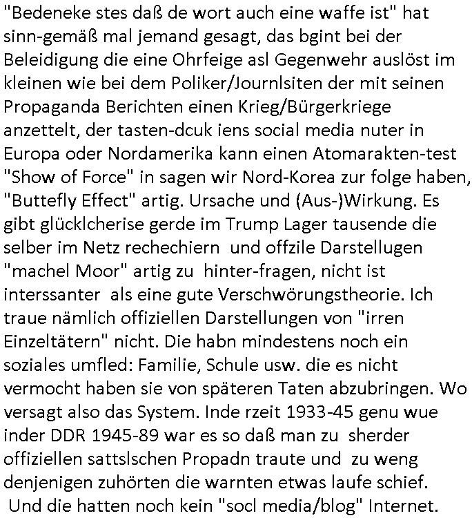 "Bedeneke stes daß de wort auch eine waffe ist" hat sinn-gemäß mal jemand gesagt, das bgint bei der Beleidigung die eine Ohrfeige asl Gegenwehr auslöst im kleinen wie bei dem Poliker/Journlsiten der mit seinen Propaganda Berichten einen Krieg/Bürgerkriege anzettelt, der tasten-dcuk iens social media nuter in Europa oder Nordamerika kann einen Atomarakten-test "Show of Force" in sagen wir Nord-Korea zur folge haben, "Buttefly Effect" artig. Ursache und (Aus-)Wirkung. Es gibt glücklcherise gerde im Trump Lager tausende die selber im Netz rechechiern und offzile Darstellugen "machel Moor" artig zu hinter-fragen, nicht ist interssanter als eine gute Verschwörungstheorie. Ich traue nämlich offiziellen Darstellungen von "irren Einzeltätern" nicht. Die habn mindestens noch ein soziales umfled: Familie, Schule usw. die es nicht vermocht haben sie von späteren Taten abzubringen. Wo versagt also das System. Inde rzeit 1933-45 genu wue inder DDR 1945-89 war es so daß man zu sherder offiziellen sattslschen Propadn traute und zu weng denjenigen zuhörten die warnten etwas laufe schief. Und die hatten noch kein "socl media/blog" Internet.