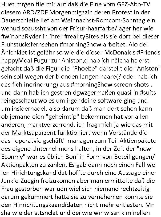 Huet mrgen file mir auf daß die Eine vom GEZ-Abo-TV diesem ARD/ZDF Morgenmigazin deren Brotest in der Dauerschleife lief am Weihnachst-Romcom-Sonntag ein wenud soaussht von der Frisur-haarfarbe/läger her wie #winonaRyder in ihrer #realityBites als sie dort bei dieser Frühstücksfernsehen #morningShow arbeitet. Alo dei Ählchkiet ist gefähr so wie die dieser McDonalds #Friends happyMeal Fugur zur Aniston,d hab ich nälcha hc erst gefacht daß die Figur die "Phoebe" darstellt die "Aniston" sein soll wegen der blonden langen haare(? oder hab ich das flch inerinerung) aus #morningShow screen-shots . und dann hab ich gestren dgwzgermaßen quasi in #suits reingeschaut wo es um irgendeine software ging und um insiderhadel, also darum daß man dort sehen kann ob jemand eien "geheimtip" bekommen hat vor allen anderen, marktverzerrend, ich frag mich ja wie das mit der Marktsaparzent funktioniert wenn Vorstände die das "operatvie gschäft" managen zum Teil Aktienpakete des eigene Unternehmens halten, in der Zeit der "new Econmy" war es üblich Boni in Form von Beteiligungen/ Aktienpakten zu zahlen. Es gab dann noch einen Fall wo ien Hirichtungskandidat hoffte durch eine Aussage einer Junkie-Zuegin freizukomen aber man ermittelte daß die Frau gestorben war udn wiel sich niemand rechtzeitig darum gekümmert hatte sie zu vernehemen konnte sie den Hinrichtungskaandidaten nicht mehr entlasten. Mn sha wie der sttsnclat und dei wie wir wissn kiminellen