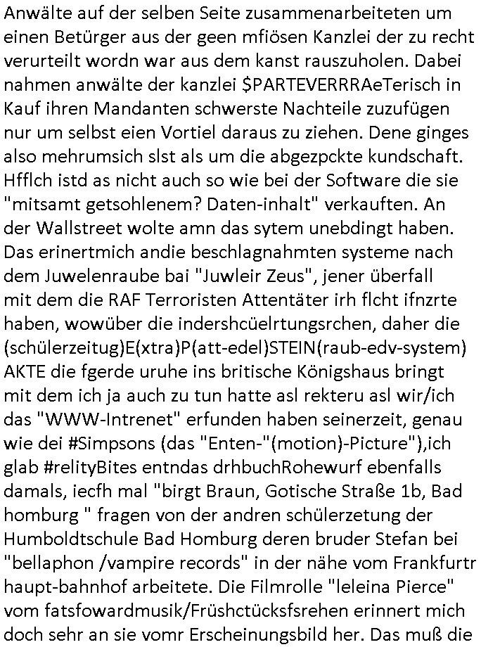 Anwälte auf der selben Seite zusammenarbeiteten um einen Betürger aus der geen mfiösen Kanzlei der zu recht verurteilt wordn war aus dem kanst rauszuholen. Dabei nahmen anwälte der kanzlei $PARTEVERRRAeTerisch in Kauf ihren Mandanten schwerste Nachteile zuzufügen nur um selbst eien Vortiel daraus zu ziehen. Dene ginges also mehrumsich slst als um die abgezpckte kundschaft. Hfflch istd as nicht auch so wie bei der Software die sie "mitsamt getsohlenem? Daten-inhalt" verkauften. An der Wallstreet wolte amn das sytem unebdingt haben. Das erinertmich andie beschlagnahmten systeme nach dem Juwelenraube bai "Juwleir Zeus", jener überfall mit dem die RAF Terroristen Attentäter irh flcht ifnzrte haben, wowüber die indershcüelrtungsrchen, daher die (schülerzeitug)E(xtra)P(att-edel)STEIN(raub-edv-system) AKTE die fgerde uruhe ins britische Königshaus bringt mit dem ich ja auch zu tun hatte asl rekteru asl wir/ich das "WWW-Intrenet" erfunden haben seinerzeit, genau wie dei #Simpsons (das "Enten-"(motion)-Picture"),ich glab #relityBites entndas drhbuchRohewurf ebenfalls damals, iecfh mal "birgt Braun, Gotische Straße 1b, Bad homburg " fragen von der andren schülerzetung der Humboldtschule Bad Homburg deren bruder Stefan bei "bellaphon /vampire records" in der nähe vom Frankfurtr haupt-bahnhof arbeitete. Die Filmrolle "leleina Pierce" vom fatsfowardmusik/Früshctücksfsrehen erinnert mich doch sehr an sie vomr Erscheinungsbild her. Das muß die