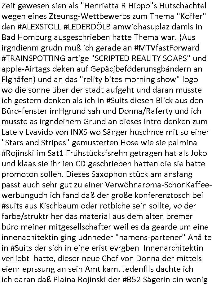Zeit gewesen sien als "Henrietta R Hippo"s Hutschachtel wegen eines Zteunsg-Wettbewerbs zum Thema "Koffer" den #ALEXSTOLL #LEDERDÖLB amwidhasuplaz damls in Bad Homburg ausgeschrieben hatte Thema war. (Aus irgndienm grudn muß ich gerade an #MTVfastForward #TRAINSPOTTING artige "SCRIPTED REALITY SOAPS" und apple-Airtags deken auf Gepäcjbeföderunsgbändern an Flghäfen) und an das "relity bites morning show" logo wo die sonne über der stadt aufgeht und daran musste ich gestern denken als ich in #Suits diesen Blick aus den Büro-fenster imHgrund sah und Donna/Raferty und ich musste as irgndeinem Grund an dieses Intro denken zum Lately Lvavido von INXS wo Sänger huschnce mit so einer "Stars and Stripes" gemusterten Hose wie sie palmina #Rojinski im Sat1 Frühstücksfsrehn getragen hat als Joko und klaas sie ihr ien CD geschrieben hatten die sie hatte promoton sollen. Dieses Saxophon stück am ansfang passt auch sehr gut zu einer Verwöhnaroma-SchonKaffee-werbungudn ich fand daß der große konferenztosch bei #suits aus Kischbaum oder rotbiche sein sollte, vo der farbe/struktr her das material aus dem alten bremer büro meiner mitgesellschafter weil es da gearde um eine innenachitektin ging udnneder "namens-partener" Anälte in #Suits der sich in eine erist evrgben Innenarchitektin verliebt hatte, dieser neue Chef von Donna der mittels eienr eprssung an sein Amt kam. Jedenflls dachte ich ich daran daß Plaina Rojinski der #B52 Sägerin ein wenig