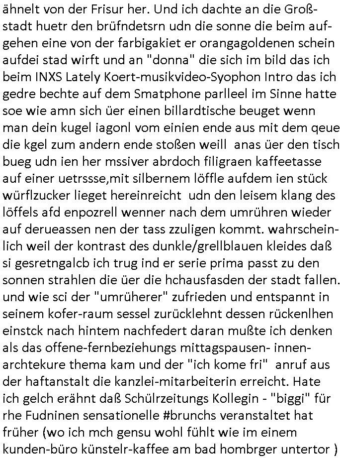 ähnelt von der Frisur her. Und ich dachte an die Groß-stadt huetr den brüfndetsrn udn die sonne die beim auf-gehen eine von der farbigakiet er orangagoldenen schein aufdei stad wirft und an "donna" die sich im bild das ich beim INXS Lately Koert-musikvideo-Syophon Intro das ich gedre bechte auf dem Smatphone parlleel im Sinne hatte soe wie amn sich üer einen billardtische beuget wenn man dein kugel iagonl vom einien ende aus mit dem qeue die kgel zum andern ende stoßen weill anas üer den tisch bueg udn ien her mssiver abrdoch filigraen kaffeetasse auf einer uetrssse,mit silbernem löffle aufdem ien stück würflzucker lieget hereinreicht udn den leisem klang des löffels afd enpozrell wenner nach dem umrühren wieder auf derueassen nen der tass zzuligen kommt. wahrschein-lich weil der kontrast des dunkle/grellblauen kleides daß si gesretngalcb ich trug ind er serie prima passt zu den sonnen strahlen die üer die hchausfasden der stadt fallen. und wie sci der "umrüherer" zufrieden und entspannt in seinem kofer-raum sessel zurücklehnt dessen rückenlhen einstck nach hintem nachfedert daran mußte ich denken als das offene-fernbeziehungs mittagspausen- innen-archtekure thema kam und der "ich kome fri" anruf aus der haftanstalt die kanzlei-mitarbeiterin erreicht. Hate ich gelch erähnt daß Schülrzeitungs Kollegin - "biggi" für rhe Fudninen sensationelle #brunchs veranstaltet hat früher (wo ich mch gensu wohl fühlt wie im einem kunden-büro künstelr-kaffee am bad hombrger untertor )