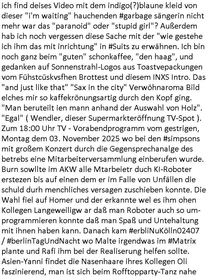 ich find deises Video mit dem indigo(?)blaune kleid von dieser "i'm waiting" hauchenden #garbage sängerin nicht mehr war das "paranoid" oder "stupid girl"? Außerdem hab ich noch vergessen diese Sache mit der "wie gestehe ich ihm das mit inrichtung" in #Suits zu erwähnen. Ich bin noch ganz beim "guten" schonkaffee, "den haag", und gedanken auf Sonnenstrahl-Logos aus Toastvepackungen vom Fühstcüskvsfhen Brottest und diesem INXS Intro. Das "and just like that" "Sax in the city" Verwöhnaroma Bild elches mir so kaffekrönungsartig durch den Kopf ging. "Man beruteilt ien mann anhand der Auswahl von Holz". "Egal" ( Wendler, dieser Supermarkteröffnung TV-Spot ). Zum 18:00 Uhr TV - Vorabendprogramm vom gestrigen, Montag dem 03. November 2025 wo bei den #simpsons mit großem Konzert durch die Gegensprechanalge des betrebs eine Mitarbeiterversammlung einberufen wurde. Burn sowllte im AKW alle Mtarbeietr duch KI-Roboter erstezen bis auf einen dem er im Falle von Unfällen die schuld durh menchliches versagen zuschieben konnte. Die Wahl fiel auf Homer und der erkannte wel es ihm ohen Kollegen Langeweiligw ar daß man Roboter auch so um-programmieren konnte daß man Spaß und Untehaltung mit ihnen haben kann. Danach kam #erbliNuKölln02407 / #berlinTagUndNacht wo Malte irgendwas im #Matrix plante und Rafi ihm bei der Realiserung helfen sollte. Asien-Yanni findet die Nasenhaare ihres Kollegen Oli faszinierend, man ist sich beim Rofftopparty-Tanz nahe