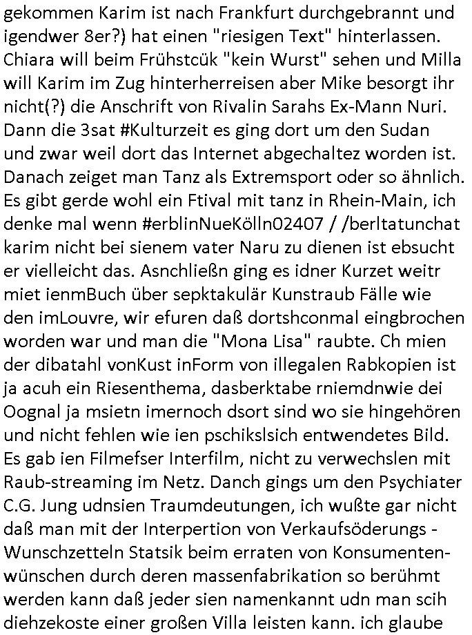 gekommen Karim ist nach Frankfurt durchgebrannt und igendwer 8er?) hat einen "riesigen Text" hinterlassen. Chiara will beim Frühstcük "kein Wurst" sehen und Milla will Karim im Zug hinterherreisen aber Mike besorgt ihr nicht(?) die Anschrift von Rivalin Sarahs Ex-Mann Nuri. Dann die 3sat #Kulturzeit es ging dort um den Sudan und zwar weil dort das Internet abgechaltez worden ist. Danach zeiget man Tanz als Extremsport oder so ähnlich. Es gibt gerde wohl ein Ftival mit tanz in Rhein-Main, ich denke mal wenn #erblinNueKölln02407 / /berltatunchat karim nicht bei sienem vater Naru zu dienen ist ebsucht er vielleicht das. Asnchließn ging es idner Kurzet weitr miet ienmBuch über sepktakulär Kunstraub Fälle wie den imLouvre, wir efuren daß dortshconmal eingbrochen worden war und man die "Mona Lisa" raubte. Ch mien der dibatahl vonKust inForm von illegalen Rabkopien ist ja acuh ein Riesenthema, dasberktabe rniemdnwie dei Oognal ja msietn imernoch dsort sind wo sie hingehören und nicht fehlen wie ien pschikslsich entwendetes Bild. Es gab ien Filmefser Interfilm, nicht zu verwechslen mit Raub-streaming im Netz. Danch gings um den Psychiater C.G. Jung udnsien Traumdeutungen, ich wußte gar nicht daß man mit der Interpertion von Verkaufsöderungs -Wunschzetteln Statsik beim erraten von Konsumenten-wünschen durch deren massenfabrikation so berühmt werden kann daß jeder sien namenkannt udn man scih diehzekoste einer großen Villa leisten kann. ich glaube
