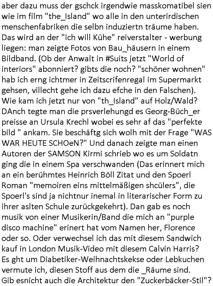 aber dazu muss der gschck irgendwie masskomatibel sien wie im film "the_Island" wo alle in den unterirdischen menschenfabriken die selbn induziertn träume haben. Das wird an der "ich will Kühe" reiverstalter - werbung liegen: man zeigte Fotos von Bau_häusern in einem Bildband. (Ob der Anwalt in #Suits jetzt "World of interiors" abonniert? gibts die noch? "schöner wohnen" hab ich erng ichtmer in Zeitscrifenregal im Supermarkt gehsen, villecht gehe ich dazu efche in den Falschen). Wie kam ich jetzt nur von "th_Island" auf Holz/Wald? DAnch tegte man die prsverlehungd es Georg-Büch_er preisse an Ursula Krechl wobei es sehr af das "perfekte bild " ankam. Sie beschäftg sich wolh mit der Frage "WAS WAR HEUTE SCHOeN?" Und danach zeigte man einen Autoren der SAMSON Kirmi schrieb wo es um Soldatn ging die in einem Spa verschwanden (Das erinnert mich an ein berühmtes Heinrich Böll Zitat und den Spoerl Roman "memoiren eins mittelmäßigen shcülers", die Spoerl's sind ja nichtnur inemal in literarischer Form zu ihrer aslten Schule zurückgekehrt). Dan gab es noch musik von einer Musikerin/Band die mich an "purple disco machine" erinert hat vom Namen her, Florence oder so. Oder verwechsel ich das mit diesem Sandwich kauf in London Musik-Video mit diesem Calvin Harris? Es ght um Diabetiker-Weihnachtskekse oder Lebkuchen vermute ich, diesen Stoff aus dem die _Räume sind. Gib esnicht auch die Architektur den "Zuckerbäcker-Stil"?