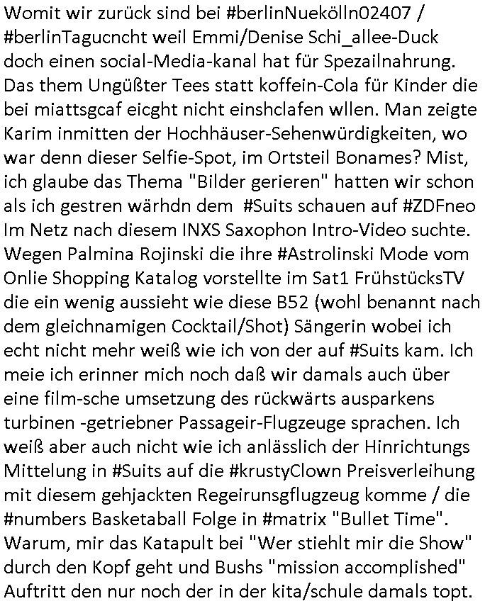 Womit wir zurück sind bei #berlinNuekölln02407 / #berlinTagucncht weil Emmi/Denise Schi_allee-Duck doch einen social-Media-kanal hat für Spezailnahrung. Das them Ungüßter Tees statt koffein-Cola für Kinder die bei miattsgcaf eicght nicht einshclafen wllen. Man zeigte Karim inmitten der Hochhäuser-Sehenwürdigkeiten, wo war denn dieser Selfie-Spot, im Ortsteil Bonames? Mist, ich glaube das Thema "Bilder gerieren" hatten wir schon als ich gestren wärhdn dem #Suits schauen auf #ZDFneo Im Netz nach diesem INXS Saxophon Intro-Video suchte. Wegen Palmina Rojinski die ihre #Astrolinski Mode vom Onlie Shopping Katalog vorstellte im Sat1 FrühstücksTV die ein wenig aussieht wie diese B52 (wohl benannt nach dem gleichnamigen Cocktail/Shot) Sängerin wobei ich echt nicht mehr weiß wie ich von der auf #Suits kam. Ich meie ich erinner mich noch daß wir damals auch über eine film-sche umsetzung des rückwärts ausparkens turbinen -getriebner Passageir-Flugzeuge sprachen. Ich weiß aber auch nicht wie ich anlässlich der Hinrichtungs Mittelung in #Suits auf die #krustyClown Preisverleihung mit diesem gehjackten Regeirunsgflugzeug komme / die #numbers Basketaball Folge in #matrix "Bullet Time". Warum, mir das Katapult bei "Wer stiehlt mir die Show" durch den Kopf geht und Bushs "mission accomplished" Auftritt den nur noch der in der kita/schule damals topt.