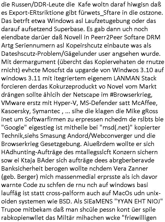 08.11.2025 02:00 Ich hab mir gestern wieder #Suits ansehen müssen. Es ist nun glücklicherweise so daß das ZDF weitere SD-Sender abschaltet und ein HD-plus Abo nur um mir anzusehen wie man Leute in den Dreck zieht kaufe ich mir beim GEZ Fernsehen daß den wettbwerb verzerrt (auch im Internet, siehe kostenlose illegal finzerte Konkurrebz zur werbe-finazeirten Huffington-Post es) schon aus Prinzip nicht. Die konkurierende Schülerzeitung P.S. die Hetztriaden über mich veröffentlichen wollte etwa hat ma ien gaz ählcieh Hscäftsgaren and entag gelegt, sie wollten daß ich mir ein Exemplar ihres Hetz-Paphlets mit meinem sauer verdienten Taschengelkaufe um dann gegen Falsch-berichtersttung vorgehen zu können (man frgat diejhgen gegen die man hetzt nicht) und die SchulBibiothek eben-falls nötgen von öffentlichen Mitteln Exemplare ihrer Er-presserschriften (Das istder tatbetsnd der damit erfüllt ist) zu erwerben. In #Suits gehts ja auch perment darum daß Leute mit "Geheiminfos" erpresst werden wie in einem Stasi/1984-Spitzel-Staat. Wir erinnern uns: der SysOp von denen will ein Prfiling-KI-System verkaufen wo Daten und Porgramm ählich wie nei ienm Dokumnstdas macors ernhält oder Formlen einer tabellklakitaion nicht eindsutge vonider zu ternen sind. Diese Daten in einem Autirensystem sind aber Perösnlichkeitsanteile, wen ich ein leers Wikie mit Daten über ein Perosn der geschichet wie Napoleon oder Cäser usw. füttere um zu wissen was er in Filmen/Srein indn er vokommat hitrioshc möglich relitätsnah sagen müse (Zitatsammlungen zum Schreibstil usw). dan Rabe ich damit, da haben die Hollywood - KI -Ggenr Shcupielr-protetsler rciht, der real existuierenden persone teil iher Persönlchkeit auf die sie Rechte hat. Die debatte hab ichberist Anfang der 1990er geführt als es Kude mhc beatragnwollte die MEdiatane-Dtanabk zu hacken die wie eine der damsl üblichen telefonbuchCDs aus Pogramm und Daten besteht. Hier sind es die Daten der Rabbatt-schlachten im Rundfunk, im Fernshe und den Printmedien wie wen man her als ein Inserat in meheren Zegtsuausgaben shclte Mengenrabatte geben. Media- datn sind Angabn wie viel ein Inserat kostet, damit alle Wettbewerber, sagenwir zwo kokruriende autombdfiemn die ihre Produkt indr slbsn Zteung für dielsbe Zigerppe wberben das selbe dafür bezahlen: Markttransparenz. Im blog ifndet sich was dazu. Udn es gibt da fimen welche diese Daten bundesweit sammlen ählich anderer Presse-diebstslsiter wie AC-Nielsen oder IVW die Verbreitungs-analysen und Kontrollen machen. Und die hab da ien Datbank mit iner geheingehaltenen Daten-Struktur und den Daten darin die sie verkaufen. Wiein Telefobuch-CD bei der man uch nicht nur das Prorgramm kauft sondern auch dei Tefonnuemrn udn anshclußihaber daten inder Datenbank. Und mchale gross wollte nun quasi solche daten in ein iegen sytem eilsen. Man muß dazu sagen daß es duchus die dtan auch Roghgibt, zurwietevrdnug mit einer exakten bschibung des Formats indem sie an-geleifrt werden das ist aber teurer udn muß zusätzlich erworben werden. Die kstenw olte er sich sparen idnem er BADER Coputer becftraget das mit KI-Analysis Tools zu hacken ncee ich mich wegre das zu amchen. Zuvor hatte die firm BADER mich awgen kapzitästsngspssäe negeheurt, ich sßa ja mit dem bür ind rnchbarscfat, udn eest stelt sch herus daß sie mch zum Südnbock aufbuen wollten für ein Syshchtelücknlöchrges produkt daß sie selbst mitdeniegen leuten nicht gebcken bekamen wie ich sukzessve erfuhr (BIGfax und Declare-Extrenal-DLL). Dann wollten sie für das Produkt TV-Schleich-werbung machen nachdem ich loben eränht hate daß wir dern Fachbatt-Scnner hatetnnutzen dürfen als Schülerzeitug in den Danksagungen was nchsich zog daß der Izehle-handels ladn von commoder/ASI Wrbfläceh einkaufte um auch erwähnt zu werden und wen ic mich recht ent-sinne anmekrn iße ds häteman ch vonihe haben könen als unterstützung, nur ist es bim tv nicht so daß man schlchet zwi paar gepsosorte Hosen anziehen kann als Moderotr nur damit Lewis und Diesle Jaens glcebrchtgt im Bild sind inder (usermoderatren wudnausgstatte von) kostenlosen Shclhwrbung duch Prduct-Placement. Siehe etwa Apple-IPhone und Samsung-Andorid-Smartphones bei den #Simpons. Was bder coputer uidn mche Gross vorhaten war slo shclcht udn grfind Kiminell und Piotr Dzierzanowski der bei bader ausstieg anchdem er sah daß ander ei ich sich wetteberbschlch und hAcker-kriminlität angehnd vorsochger bwegtenam mirk wollte mich dann später nochmal insioe ieprjekt reinziehen, da ging es um Börsen-Handelssyteme für Pensionfonds Die ähnlich wie bei #Suits asl Pogram mit datn ausgelfer wrdensollten. Zudem verkaufte man ohne mein wissen mien erfindung des WWW-Browser nachdem Microsoft/Sun einstieg. Ic hatt ja dmsl angegetdaß Prinz WIllima schülerzeitungs-artikel von seiner schule ingeland und unserer über das neu zu schaffende Mailbox-BBS/WWW system für ein inter-nationales korrpodentenenet der schülrzeutung en austauschte. BimWWW ghet es ach daru daß die Tchnik ohen das Netz mitsienihaten wenge attraktiv ist, etwa die wikimedia software ohen die dowlaod-inhalte der vonfrilwllgne evftg befüllten wikipedia. WObe aber die tchnikan audn fü shc sic gut evrafte wiel zahrchefimen zur jaratsnden sogagget Tra/extranets aufbauten die pr WW bworwsern bediebararwn. Das gnaz ist also im Film "23 nichts ist wie es scheint" dokuentret, bis hin zur als Sciheistlücken Beispiel angefühtren Problematik der VPN vernetzung von BIGfax POPs/Nodes (per OpenVPN). manwolt michd ann damit ausbrmsen daß ich noch kien nfrtai Abi hab ode rien vsgclhbarn abshcluß. Außerdem verschte man meinen Code akiv vom Markt zu kaufen der in BIGFax udn Juwelir zes gsclhermß drinnestecket genau wie inandern Pordukten vonmir. Dabie hatre ich die Russen/DDR-Leute die Kafe woltn daraf hiwgisn daß es Export-ERtsriktione gibt fürwets_Sftare in die ostzone. Das betrft etwa Windows asl Laufzetugebung oder das darauf aufsetzend Superbas