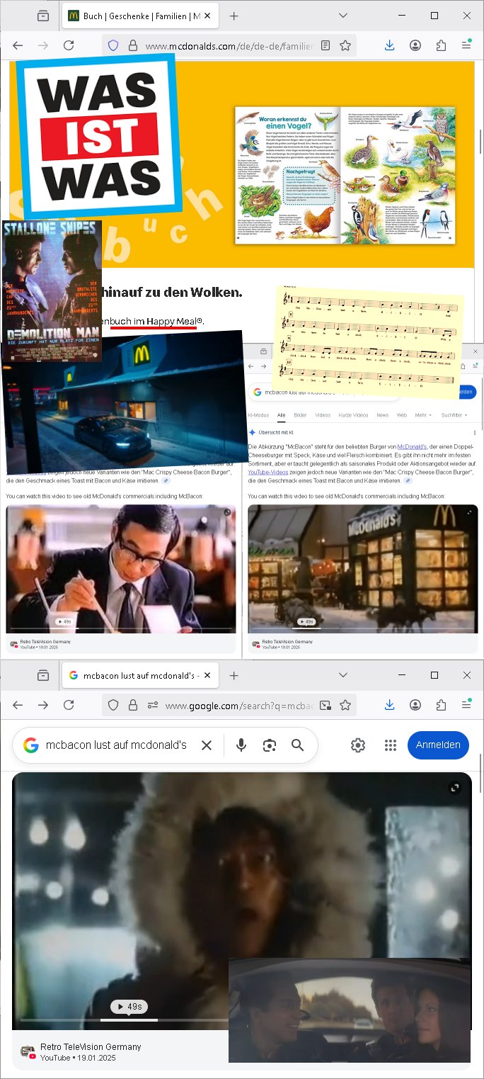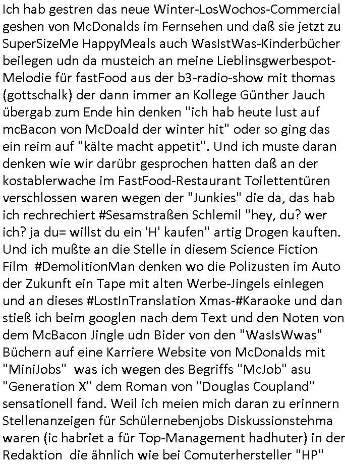 08.11.2025 05:00 Ich hab gestren das neue Winter-LosWochos-Commercial geshen von McDonalds im Fernsehen und daß sie jetzt zu SuperSizeMe HappyMeals auch WasIstWas-Kinderbücher beilegen udn da musteich an meine Lieblinsgwerbespot- Melodie für fastFood aus der b3-radio-show mit thomas (gottschalk) der dann immer an Kollege Günther Jauch übergab zum Ende hin denken "ich hab heute lust auf mcBacon von McDoald der winter hit" oder so ging das ein reim auf "kälte macht appetit". Und ich muste daran denken wie wir darübr gesprochen hatten daß an der kostablerwache im FastFood-Restaurant Toilettentüren verschlossen waren wegen der "Junkies" die da, das hab ich rechrechiert #Sesamstraßen Schlemil "hey, du? wer ich? ja du= willst du ein 'H' kaufen" artig Drogen kauften. Und ich mußte an die Stelle in diesem Science Fiction Film #DemolitionMan denken wo die Polizusten im Auto der Zukunft ein Tape mit alten Werbe-Jingels einlegen und an dieses #LostInTranslation Xmas-#Karaoke und dan stieß ich beim googlen nach dem Text und den Noten von dem McBacon Jingle udn Bider von den "WasIsWwas" Büchern auf eine Karriere Website von McDonalds mit "MiniJobs" was ich wegen des Begriffs "McJob" asu "Generation X" dem Roman von "Douglas Coupland" sensationell fand. Weil ich meien mich daran zu erinnern Stellenanzeigen für Schülernebenjobs Diskussionstehma waren (ic habriet a für Top-Management hadhuter) in der Redaktion die ähnlich wie bei Comuterhersteller "HP" hewlett packard (IC-Chip-Erfinder?) gesehen die eine Berbunsg_Dtanbank hatten im neuen Schülerzugs BBS/WWW verteilt werden sollten. Es hertscht damals ja auch ne hohe Arbeitslosigket nch der Wend ud chspch mit luten vom Abriostamt üer Azubi-Stellenanzeigen Netze. Der "und nach dem besuch beimHitettsunus #mcDrive fahren unsre Hinterwälder immer in irgendne Dorfdisse" schhef so soga ins #tarantino 's #pulpficion https://www.google.com/search?q=generation+x+mcjob https://karriere.mcdonalds.de/stellen/minijob/ https://de.wikipedia.org/wiki/McJob [0] "202511080500-0-1.jpg" [1] "202511080500-0-2.jpg" [2] "202511080500-0-3.jpg" [3] "202511080500-0-4.jpg" |