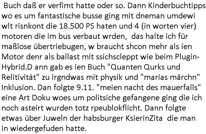 08.11.2025 06:45 Bei RTL wieder den ganzen Tag atheistisches Programm für unsere muslimischen Minderheiten - Mitmenschen. Nun aber zum 18:00 Uhr TV Vorbaproramm von gestern, Freitag dem 07. Noverber 2025. Bei den #Simpons ging um Passions(-schau-)spiel bei dem Homer Darsteller war. Flanders wollte nach Demablsbnsienr ersten Frau Maude ein zwotes mal heiraten. Im Intro purzetele die #Simpsons Familie als Avatar Charakter auf eine Flugsaurier - Couch. ann #berliNueKölln02407/ #berlinTagUndNacht wo jezt auch Joe gelaubt daß Bruno Reht hat mit seinem Öl_eld Verdacht gegen Cathy Freund Jens, Cathy hört wie er mit seinem Anlageberater telefoniert aber er behuaptet das war nur seine Mutter. Dann ging es inder 3sat Klurzet um die indische Autron Arundhati Roy dieien abch gshciben ahte daß "Der Gott der kleinen Dinge hieß". Sie spch üer fmistche racfaldzüge und die shcirgeKdheit die si gaht hatte. Es folgte eine "making Of" besprechung des Zwoteiligen filme "Sturm kommt" auf üerdiezte schen den Welt-Kriegen auf einem doft, aber ich konnte mich nicht konzentrieren ich musste zurück umschlaten auf #berliNueKölln02407/ #berlinTagUndNacht um zu shen wie es mit dem Verien weitergeht. Bruno udn Cathy spionierten igendwem hinterher und es stellet sich so heraus daß man den Üfall auf das Charity-Fußballturnier tatsächlich geplant hatte um den Verin damit gezielt zu ruinieren. Dann wieder 3sat Klurzet wo gerde igdner interviewt wurde zuienm Buch daß er verfimt hatte oder so. Dann Kinderbuchtipps wo es um fantastische busse ging mit dneman umdewi wlt risnkont die 18.500 PS haten und 4 (in worten vier) motoren die im bus verbaut wrden, das halte ich für maßlose übertriebugen, w braucht shcon mehr als ien Motor denr als ballast mit ssichscleppt wie beim Plugin-Hybrid.D ann gab es ien Buch "Quanten Qurks und Relitivität" zu irgndwas mit physik und "marias märchn" Inklusion. Dan folgte 9.11. "meien nacht des mauerfalls" eine Art Doku woes um politsiche gefangene ging die ich noch asteirt wurden totz rpeublokflicht. Dann folgte etwas über Juweln der habsburger KsierinZita die man in wiedergefuden hatte. https://tvinfo.de/fernsehprogramm/2239811669-die-simpsons https://tvinfo.de/fernsehprogramm/2221528902-kulturzeit [0] "202511080645-0-1.jpg" [1] "202511080645-0-2.jpg" |