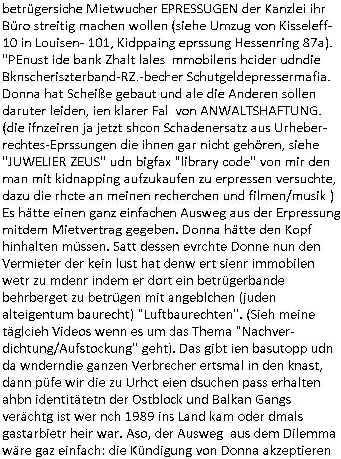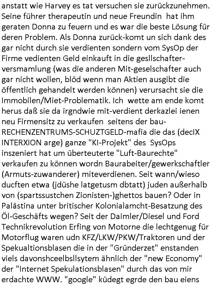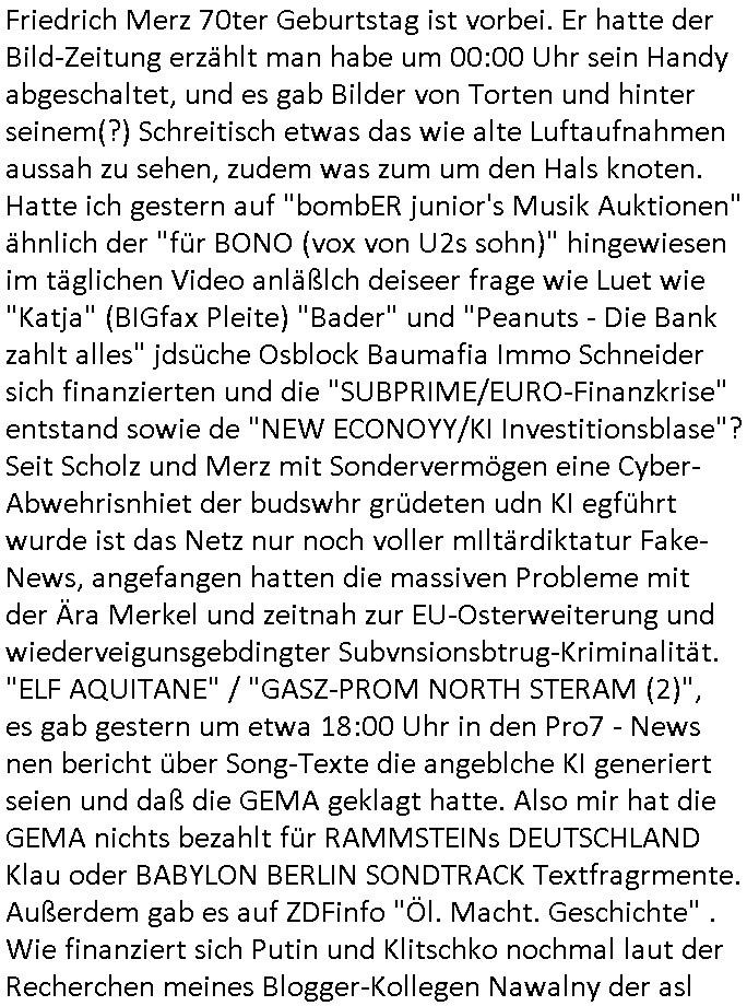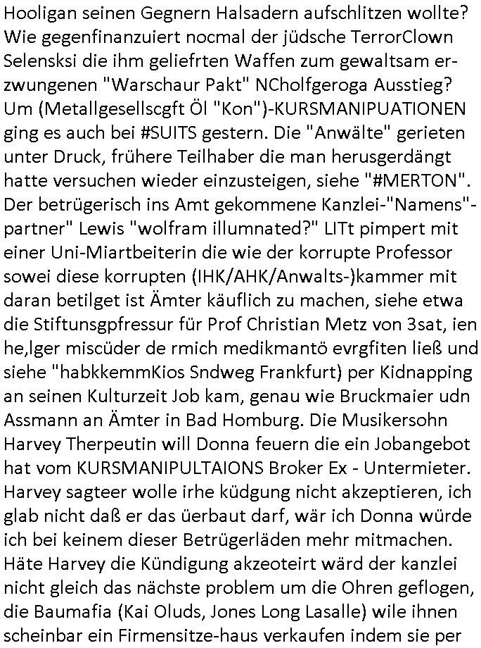 12.11.2025 03:30 Friedrich Merz 70ter Geburtstag ist vorbei. Er hatte der Bild-Zeitung erzählt man habe um 00:00 Uhr sein Handy abgeschaltet, und es gab Bilder von Torten und hinter seinem(?) Schreitisch etwas das wie alte Luftaufnahmen aussah zu sehen, zudem was zum um den Hals knoten. Hatte ich gestern auf "bombER junior's Musik Auktionen" ähnlich der "für BONO (vox von U2s sohn)" hingewiesen im täglichen Video anläßlch deiseer frage wie Luet wie "Katja" (BIGfax Pleite) "Bader" und "Peanuts - Die Bank zahlt alles" jdsüche Osblock Baumafia Immo Schneider sich finanzierten und die "SUBPRIME/EURO-Finanzkrise" entstand sowie de "NEW ECONOYY/KI Investitionsblase"? Seit Scholz und Merz mit Sondervermögen eine Cyber- Abwehrisnhiet der budswhr grüdeten udn KI egführt wurde ist das Netz nur noch voller mIltärdiktatur Fake- News, angefangen hatten die massiven Probleme mit der Ära Merkel und zeitnah zur EU-Osterweiterung und wiederveigunsgebdingter Subvnsionsbtrug-Kriminalität. "ELF AQUITANE" / "GASZ-PROM NORTH STERAM (2)", es gab gestern um etwa 18:00 Uhr in den Pro7 - News nen bericht über Song-Texte die angeblche KI generiert seien und daß die GEMA geklagt hatte. Also mir hat die GEMA nichts bezahlt für RAMMSTEINs DEUTSCHLAND Klau oder BABYLON BERLIN SONDTRACK Textfragrmente. Außerdem gab es auf ZDFinfo "Öl. Macht. Geschichte" . Wie finanziert sich Putin und Klitschko nochmal laut der Recherchen meines Blogger-Kollegen Nawalny der asl Hooligan seinen Gegnern Halsadern aufschlitzen wollte? Wie gegenfinanzuiert nocmal der jüdsche TerrorClown Selensksi die ihm geliefrten Waffen zum gewaltsam er-zwungenen "Warschaur Pakt" NCholfgeroga Ausstieg? Um (Metallgesellscgft Öl "Kon")-KURSMANIPUATIONEN ging es auch bei #SUITS gestern. Die "Anwälte" gerieten unter Druck, frühere Teilhaber die man herusgerdängt hatte versuchen wieder einzusteigen, siehe "#MERTON". Der betrügerisch ins Amt gekommene Kanzlei-"Namens"-partner" Lewis "wolfram illumnated?" LITt pimpert mit einer Uni-Miartbeiterin die wie der korrupte Professor sowei diese korrupten (IHK/AHK/Anwalts-)kammer mit daran betilget ist Ämter käuflich zu machen, siehe etwa die Stiftunsgpfressur für Prof Christian Metz von 3sat, ien he,lger miscüder de rmich medikmantö evrgfiten ließ und siehe "habkkemmKios Sndweg Frankfurt) per Kidnapping an seinen Kulturzeit Job kam, genau wie Bruckmaier udn Assmann an Ämter in Bad Homburg. Die Musikersohn Harvey Therpeutin will Donna feuern die ein Jobangebot hat vom KURSMANIPULTAIONS Broker Ex - Untermieter. Harvey sagteer wolle irhe küdgung nicht akzeptieren, ich glab nicht daß er das üerbaut darf, wär ich Donna würde ich bei keinem dieser Betrügerläden mehr mitmachen. Häte Harvey die Kündigung akzeoteirt wärd der kanzlei nicht gleich das nächste problem um die Ohren geflogen, die Baumafia (Kai Oluds, Jones Long Lasalle) wile ihnen scheinbar ein Firmensitze-haus verkaufen indem sie per betrügersiche Mietwucher EPRESSUGEN der Kanzlei ihr Büro streitig machen wollen (siehe Umzug von Kisseleff- 10 in Louisen- 101, Kidppaing eprssung Hessenring 87a). "PEnust ide bank Zhalt lales Immobilens hcider udndie Bknscheriszterband-RZ.-becher Schutgeldepressermafia. Donna hat Scheiße gebaut und ale die Anderen sollen daruter leiden, ien klarer Fall von ANWALTSHAFTUNG. (die ifnzeiren ja jetzt shcon Schadenersatz aus Urheber-rechtes-Eprssungen die ihnen gar nicht gehören, siehe "JUWELIER ZEUS" udn bigfax "library code" von mir den man mit kidnapping aufzukaufen zu erpressen versuchte, dazu die rhcte an meinen recherchen und filmen/musik ) Es hätte einen ganz einfachen Ausweg aus der Erpressung mitdem Mietvertrag gegeben. Donna hätte den Kopf hinhalten müssen. Satt dessen evrchte Donne nun den Vermieter der kein lust hat denw ert sienr immobilen wetr zu mdenr indem er dort ein betrügerbande behrberget zu betrügen mit angeblchen (juden alteigentum baurecht) "Luftbaurechten". (Sieh meine täglcieh Videos wenn es um das Thema "Nachver-dichtung/Aufstockung" geht). Das gibt ien basutopp udn da wnderndie ganzen Verbrecher ertsmal in den knast, dann püfe wir die zu Urhct eien dsuchen pass erhalten ahbn identitätetn der Ostblock und Balkan Gangs verächtg ist wer nch 1989 ins Land kam oder dmals gastarbietr heir war. Aso, der Ausweg aus dem Dilemma wäre gaz einfach: die Kündigung von Donna akzeptieren anstatt wie Harvey es tat versuchen sie zurückzunehmen. Seine führer therapeutin und neue Freundin hat ihm geraten Donna zu feuern und es war die beste Lösung für deren Problem. Als Donna zurück-komt un sich dank des gar nicht durch sie verdienten sondern vom SysOp der Firme vedienten Geld einkauft in die gesllschafter-versmamlung (was die anderen Mit-geselschafter auch gar nicht wollen, blöd wenn man Aktien ausgibt die öffentlich gehandelt werden können) verursacht sie die Immobilen/Miet-Problematik. Ich wette am ende komt herus daß sie da irgndwie mit-verdient derkazlei ienen neu Firmensitz zu verkaufen seitens der bau-RECHENZENTRUMS-SCHUZTGELD-mafia die das (decIX INTERXION arge) ganze "KI-Projekt" des SysOps inszeniert hat um überteuterte "Luft-Baurechte" verkaufen zu können wordn Baurabeiter/gewerkschaftler (Armuts-zuwanderer) miteverdienen. Seit wann/wieso ducften etwa (jdüshe latgetusm dbtatt) juden außerhalb von (spartssustchen Zionisten-)ghettos bauen? Oder in Palästina unter britischer Kolonialamcht-Besatzung des Öl-Geschäfts wegen? Seit der Daimler/Diesel und Ford Technikrevolution Erfing von Motorne die lechtgenug für Motorflug waren udn KFZ/LKW/PKW/Traktoren und der Spekualtionsblasen die in der "Gründerzet" enstanden viels davonshceelbsllsytem ähnlich der "new Economy" der "Internet Spekulationsblasen" durch das von mir erdachte WWW. "google" küdegt egrde den bau eiens nuen KI Rhczetrums an, ich willdie Dtschutzs-Skandal- Firma "google" hgeir beoswnegs iehenwie "facebook"/ "tiktok", "apple ITunes DRM" und Co. Bill Gates wollte in RlP beenflls Rchztzrenbau 