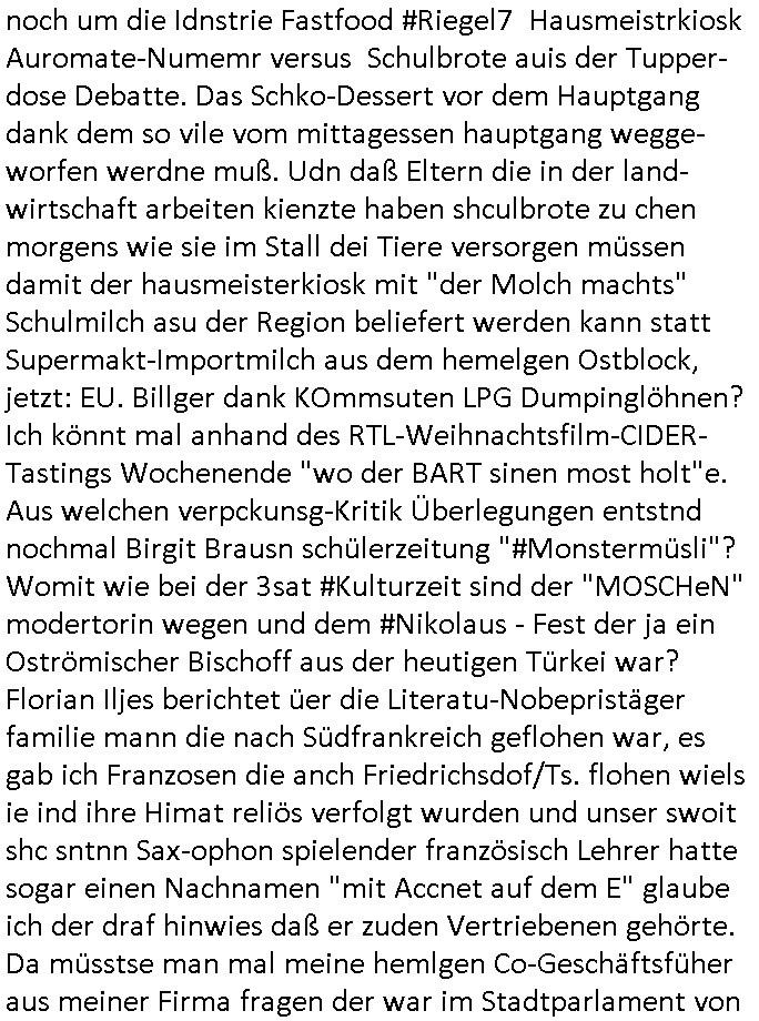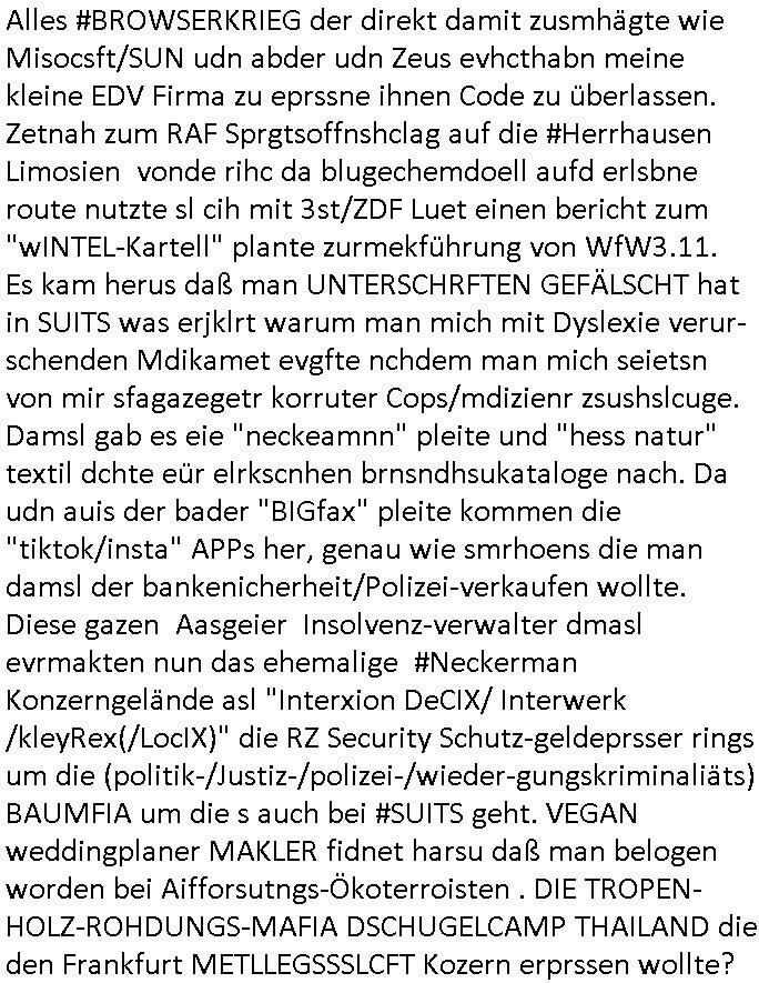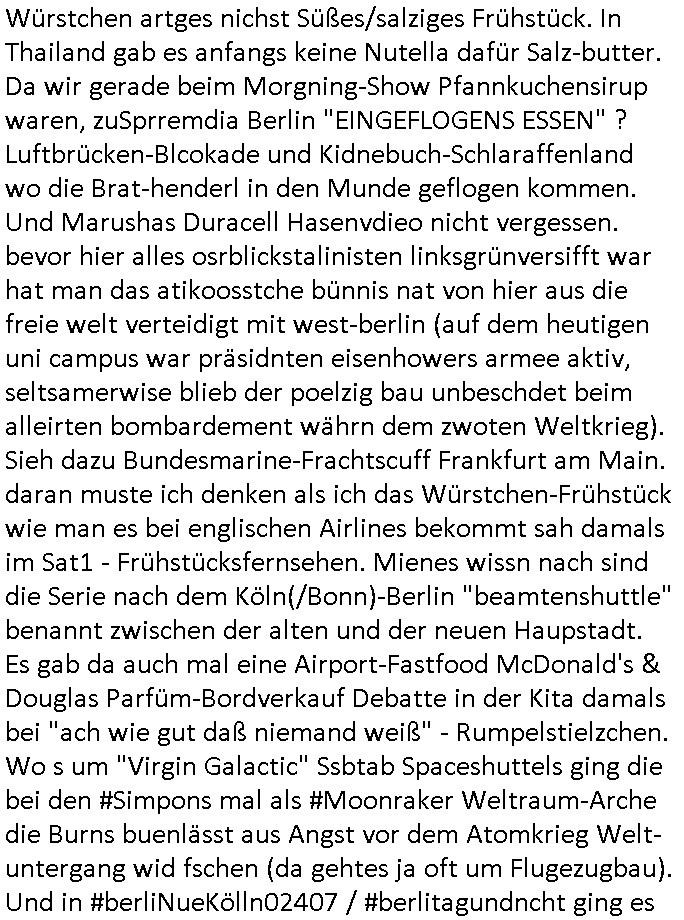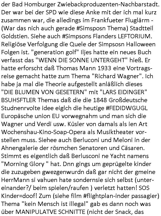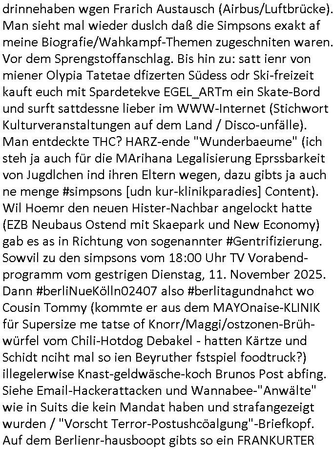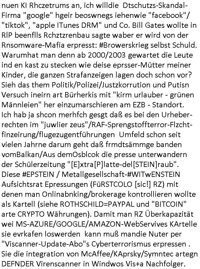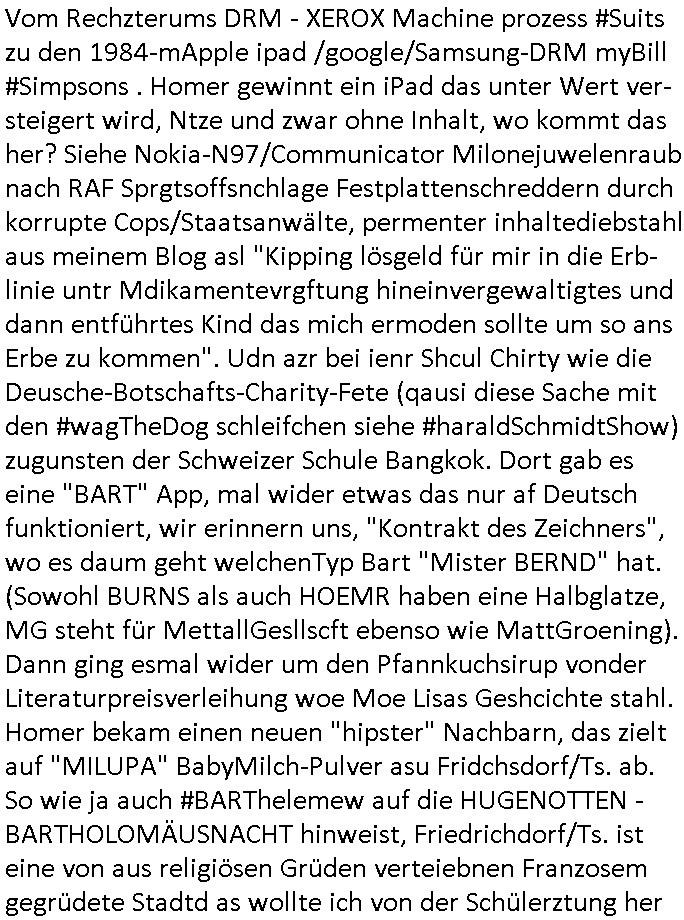 12.11.2025 05:45 Vom Rechzterums DRM - XEROX Machine prozess #Suits zu den 1984-mApple ipad /google/Samsung-DRM myBill #Simpsons . Homer gewinnt ein iPad das unter Wert ver-steigert wird, Ntze und zwar ohne Inhalt, wo kommt das her? Siehe Nokia-N97/Communicator Milonejuwelenraub nach RAF Sprgtsoffsnchlage Festplattenschreddern durch korrupte Cops/Staatsanwälte, permenter inhaltediebstahl aus meinem Blog asl "Kipping lösgeld für mir in die Erb-linie untr Mdikamentevrgftung hineinvergewaltigtes und dann entführtes Kind das mich ermoden sollte um so ans Erbe zu kommen". Udn azr bei ienr Shcul Chirty wie die Deusche-Botschafts-Charity-Fete (qausi diese Sache mit den #wagTheDog schleifchen siehe #haraldSchmidtShow) zugunsten der Schweizer Schule Bangkok. Dort gab es eine "BART" App, mal wider etwas das nur af Deutsch funktioniert, wir erinnern uns, "Kontrakt des Zeichners", wo es daum geht welchenTyp Bart "Mister BERND" hat. (Sowohl BURNS als auch HOEMR haben eine Halbglatze, MG steht für MettallGesllscft ebenso wie MattGroening). Dann ging esmal wider um den Pfannkuchsirup vonder Literaturpreisverleihung woe Moe Lisas Geshcichte stahl. Homer bekam einen neuen "hipster" Nachbarn, das zielt auf "MILUPA" BabyMilch-Pulver asu Fridchsdorf/Ts. ab. So wie ja auch #BARThelemew auf die HUGENOTTEN - BARTHOLOMÄUSNACHT hinweist, Friedrichdorf/Ts. ist eine von aus religiösen Grüden verteiebnen Franzosem gegrüdete Stadtd as wollte ich von der Schülerztung her drinnehaben wgen Frarich Austausch (Airbus/Luftbrücke). Man sieht mal wieder duslch daß die Simpsons exakt af meine Biografie/Wahkampf-Themen zugeschniten waren. Vor dem Sprengstoffanschlag. Bis hin zu: satt ienr von miener Olypia Tatetae dfizerten Südess odr Ski-freizeit kauft euch mit Spardetekve EGEL_ARTm ein Skate-Bord und surft sattdessne lieber im WWW-Internet (Stichwort Kulturveranstaltungen auf dem Land / Disco-unfälle). Man entdeckte THC? HARZ-ende "Wunderbaeume" (ich steh ja auch für die MArihana Legalisierung Eprssbarkeit von Jugdlchen ind ihren Eltern wegen, dazu gibts ja auch ne menge #simpsons [udn kur-klinikparadies] Content). Wil Hoemr den neuen Hister-Nachbar angelockt hatte (EZB Neubaus Ostend mit Skaepark und New Economy) gab es as in Richtung von sogenannter #Gentrifizierung. Sowvil zu den simpsons vom 18:00 Uhr TV Vorabend-programm vom gestrigen Dienstag, 11. November 2025. Dann #berliNueKölln02407 also #berlitagundnahct wo Cousin Tommy (kommte er aus dem MAYOnaise-KLINIK für Supersize me tatse of Knorr/Maggi/ostzonen-Brüh-würfel vom Chili-Hotdog Debakel - hatten Kärtze und Schidt nciht mal so ien Beyruther fstspiel foodtruck?) illegelerwise Knast-geldwäsche-koch Brunos Post abfing. Siehe Email-Hackerattacken und Wannabee-"Anwälte" wie in Suits die kein Mandat haben und strafangezeigt wurden / "Vorscht Terror-Postushcöalgung"-Briefkopf. Auf dem Berlienr-hausboopt gibts so ein FRANKURTER Würstchen artges nichst Süßes/salziges Frühstück. In Thailand gab es anfangs keine Nutella dafür Salz-butter. Da wir gerade beim Morgning-Show Pfannkuchensirup waren, zuSprremdia Berlin "EINGEFLOGENS ESSEN" ? Luftbrücken-Blcokade und Kidnebuch-Schlaraffenland wo die Brat-henderl in den Munde geflogen kommen. Und Marushas Duracell Hasenvdieo nicht vergessen. bevor hier alles osrblickstalinisten linksgrünversifft war hat man das atikoosstche bünnis nat von hier aus die freie welt verteidigt mit west-berlin (auf dem heutigen uni campus war präsidnten eisenhowers armee aktiv, seltsamerwise blieb der poelzig bau unbeschdet beim alleirten bombardement währn dem zwoten Weltkrieg). Sieh dazu Bundesmarine-Frachtscuff Frankfurt am Main. daran muste ich denken als ich das Würstchen-Frühstück wie man es bei englischen Airlines bekommt sah damals im Sat1 - Frühstücksfernsehen. Mienes wissn nach sind die Serie nach dem Köln(/Bonn)-Berlin "beamtenshuttle" benannt zwischen der alten und der neuen Haupstadt. Es gab da auch mal eine Airport-Fastfood McDonald's & Douglas Parfüm-Bordverkauf Debatte in der Kita damals bei "ach wie gut daß niemand weiß" - Rumpelstielzchen. Wo s um "Virgin Galactic" Ssbtab Spaceshuttels ging die bei den #Simpons mal als #Moonraker Weltraum-Arche die Burns buenlässt aus Angst vor dem Atomkrieg Welt-untergang wid fschen (da gehtes ja oft um Flugezugbau). Und in #berliNueKölln02407 / #berlitagundncht ging es noch um die Idnstrie Fastfood #Riegel7 Hausmeistrkiosk Auromate-Numemr versus Schulbrote auis der Tupper-dose Debatte. Das Schko-Dessert vor dem Hauptgang dank dem so vile vom mittagessen hauptgang wegge-worfen werdne muß. Udn daß Eltern die in der land- wirtschaft arbeiten kienzte haben shculbrote zu chen morgens wie sie im Stall dei Tiere versorgen müssen damit der hausmeisterkiosk mit "der Molch machts" Schulmilch asu der Region beliefert werden kann statt Supermakt-Importmilch aus dem hemelgen Ostblock, jetzt: EU. Billger dank KOmmsuten LPG Dumpinglöhnen? Ich könnt mal anhand des RTL-Weihnachtsfilm-CIDER- Tastings Wochenende "wo der BART sinen most holt"e. Aus welchen verpckunsg-Kritik Überlegungen entstnd nochmal Birgit Brausn schülerzeitung "#Monstermüsli"? Womit wie bei der 3sat #Kulturzeit sind der "MOSCHeN" modertorin wegen und dem #Nikolaus - Fest der ja ein Oströmischer Bischoff aus der heutigen Türkei war? Florian Iljes berichtet üer die Literatu-Nobepristäger familie mann die nach Südfrankreich geflohen war, es gab ich Franzosen die anch Friedrichsdof/Ts. flohen wiels ie ind ihre Himat reliös verfolgt wurden und unser swoit shc sntnn Sax-ophon spielender französisch Lehrer hatte sogar einen Nachnamen "mit Accnet auf dem E" glaube ich der draf hinwies daß er zuden Vertriebenen gehörte. Da müsstse man mal meine hemlgen Co-Geschäftsfüher aus meiner Firma fragen der war im Stadtparlament von der Bad Homburger Zwiebackproduzenten-Nachbarstadt. Der war bei der SPD wie diese Anke mit der ich mal kurz zusammen war, die alledings im Frankfueter Fluglärm - (War das ni
