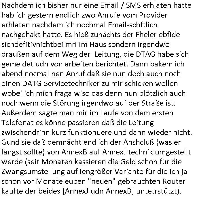 20.11.2025 12:00 -------- Nachricht -------- Betreff: Re: Anschluss **** gestört whsrclich durch erneute Sabotage [***] Datum: Tue, 18 Nov 2025 15:57:20 +0100 Von: *** Support <support@***> An: Maximilian Baehring <maximilian.baehring@***> Guten Tag Maximilian Bähring, wir haben eine Zischenmeldung erhalten. Das PTI ("Bautrupp") der Telekom wurde mit der Behebung der Störung beauftragt. Unser Carrier steht diesbezüglich im engen Kontakt mit der Telekom. Diese hat jedoch noch kein genaues Datum mitgeteilt. Wir bedauern die Ihnen entstandenen Unannehmlichkeiten und bitten Sie noch um etwas Geduld. Sobald uns neue Details bekannt werden, informieren wir Sie umgehend. Mit freundlichen Grüßen *** ****-Kundenservice PS: Bitte benutzen Sie stets die *Antwort-Funktion* in Ihrer E-Mail-Anwendung. So ist sichergestellt, dass immer der vollständige Schriftverkehr übermittelt wird. *Wir sind für Sie da:* support@*** +49 30 8095 1000 Mo-Fr, 8-20 Uhr | Sa 9-18 Uhr Und rund um die Uhr: Der ***-Hilfebereich < https://www.***/hilfe/ > mit Anleitungen und Lösungen für bekannte Probleme. Bleiben Sie auf dem Laufenden und folgen Sie uns auf Social Media: LinkedIn < https://www.linkedin.com/company/***/ >, Facebook < https://www.facebook.com/*** > *** *** *** Handelsregister: *** ... [0] "202511201200-0-1.jpg" |