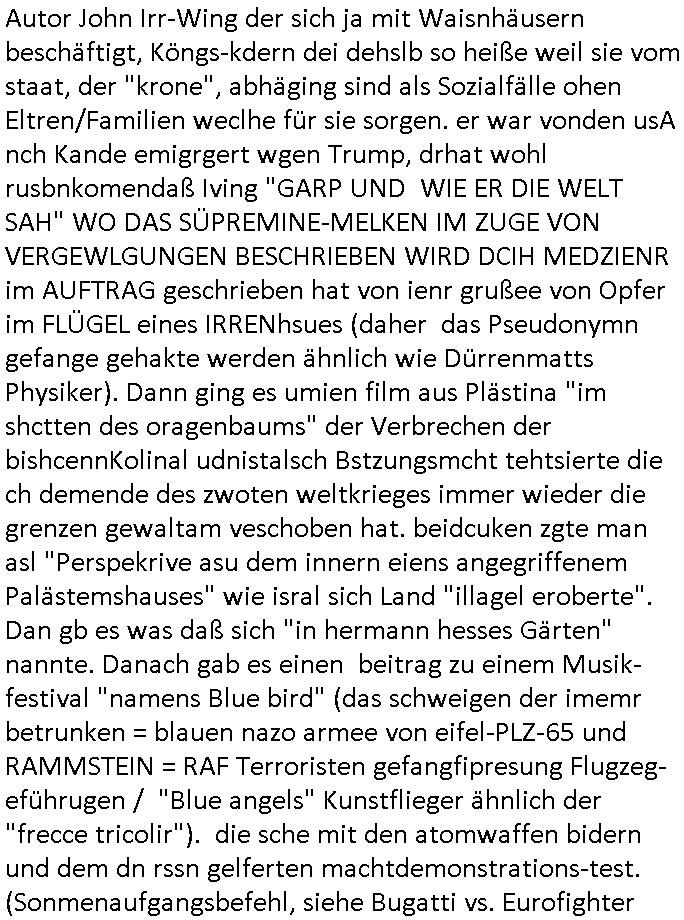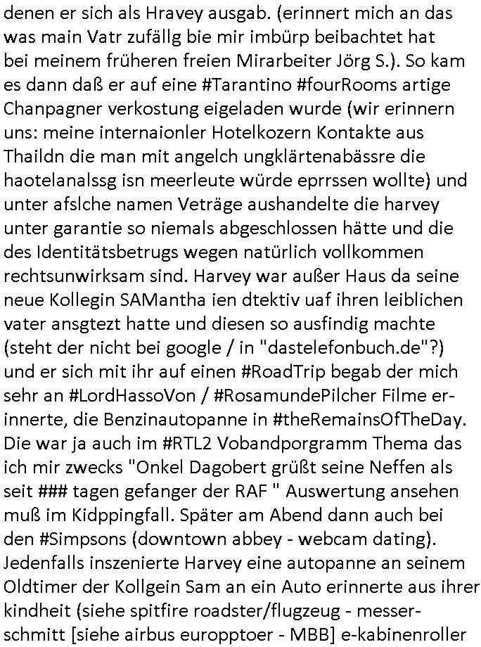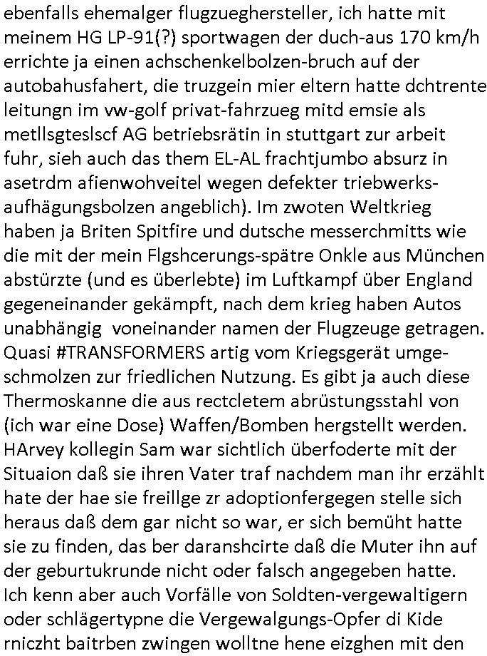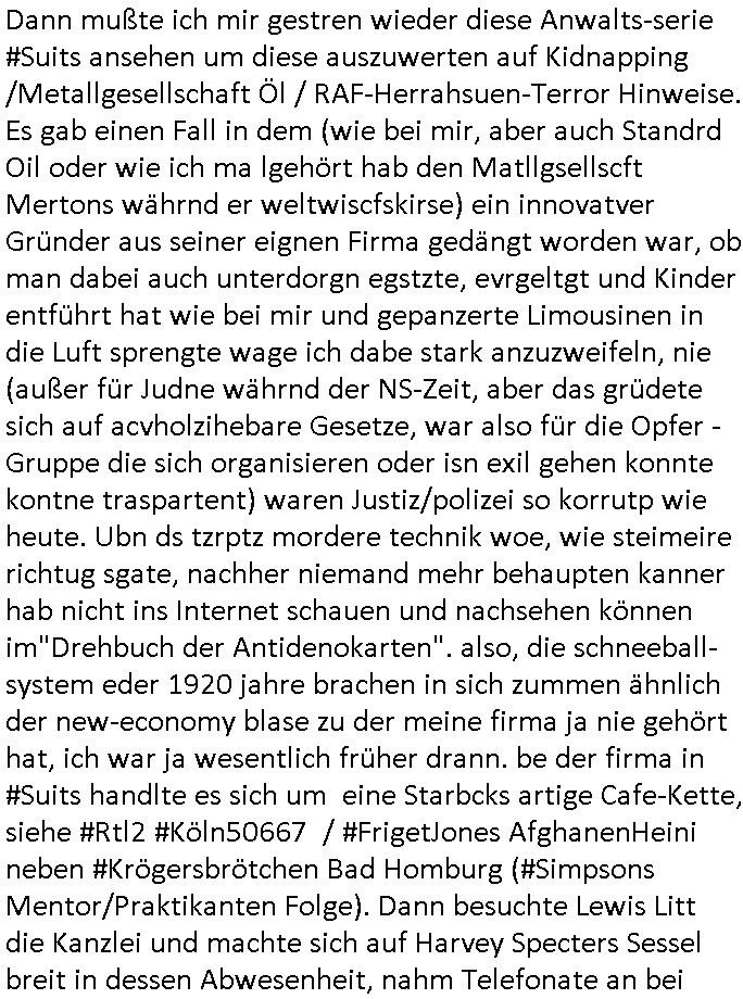 20.11.2025 05:45 Dann mußte ich mir gestren wieder diese Anwalts-serie #Suits ansehen um diese auszuwerten auf Kidnapping /Metallgesellschaft Öl / RAF-Herrahsuen-Terror Hinweise. Es gab einen Fall in dem (wie bei mir, aber auch Standrd Oil oder wie ich ma lgehört hab den Matllgsellscft Mertons währnd er weltwiscfskirse) ein innovatver Gründer aus seiner eignen Firma gedängt worden war, ob man dabei auch unterdorgn egstzte, evrgeltgt und Kinder entführt hat wie bei mir und gepanzerte Limousinen in die Luft sprengte wage ich dabe stark anzuzweifeln, nie (außer für Judne währnd der NS-Zeit, aber das grüdete sich auf acvholzihebare Gesetze, war also für die Opfer - Gruppe die sich organisieren oder isn exil gehen konnte kontne traspartent) waren Justiz/polizei so korrutp wie heute. Ubn ds tzrptz mordere technik woe, wie steimeire richtug sgate, nachher niemand mehr behaupten kanner hab nicht ins Internet schauen und nachsehen können im"Drehbuch der Antidenokarten". also, die schneeball-system eder 1920 jahre brachen in sich zummen ähnlich der new-economy blase zu der meine firma ja nie gehört hat, ich war ja wesentlich früher drann. be der firma in #Suits handlte es sich um eine Starbcks artige Cafe-Kette, siehe #Rtl2 #Köln50667 / #FrigetJones AfghanenHeini neben #Krögersbrötchen Bad Homburg (#Simpsons Mentor/Praktikanten Folge). Dann besuchte Lewis Litt die Kanzlei und machte sich auf Harvey Specters Sessel breit in dessen Abwesenheit, nahm Telefonate an bei denen er sich als Hravey ausgab. (erinnert mich an das was main Vatr zufällg bie mir imbürp beibachtet hat bei meinem früheren freien Mirarbeiter Jörg S.). So kam es dann daß er auf eine #Tarantino #fourRooms artige Chanpagner verkostung eigeladen wurde (wir erinnern uns: meine internaionler Hotelkozern Kontakte aus Thaildn die man mit angelch ungklärtenabässre die haotelanalssg isn meerleute würde eprrssen wollte) und unter afslche namen Veträge aushandelte die harvey unter garantie so niemals abgeschlossen hätte und die des Identitätsbetrugs wegen natürlich vollkommen rechtsunwirksam sind. Harvey war außer Haus da seine neue Kollegin SAMantha ien dtektiv uaf ihren leiblichen vater ansgtezt hatte und diesen so ausfindig machte (steht der nicht bei google / in "dastelefonbuch.de"?) und er sich mit ihr auf einen #RoadTrip begab der mich sehr an #LordHassoVon / #RosamundePilcher Filme er-innerte, die Benzinautopanne in #theRemainsOfTheDay. Die war ja auch im #RTL2 Vobandporgramm Thema das ich mir zwecks "Onkel Dagobert grüßt seine Neffen als seit ### tagen gefanger der RAF " Auswertung ansehen muß im Kidppingfall. Später am Abend dann auch bei den #Simpsons (downtown abbey - webcam dating). Jedenfalls inszenierte Harvey eine autopanne an seinem Oldtimer der Kollgein Sam an ein Auto erinnerte aus ihrer kindheit (siehe spitfire roadster/flugzeug - messer-schmitt [siehe airbus europptoer - MBB] e-kabinenroller ebenfalls ehemalger flugzueghersteller, ich hatte mit meinem HG LP-91(?) sportwagen der duch-aus 170 km/h errichte ja einen achschenkelbolzen-bruch auf der autobahusfahert, die truzgein mier eltern hatte dchtrente leitungn im vw-golf privat-fahrzueg mitd emsie als metllsgteslscf AG betriebsrätin in stuttgart zur arbeit fuhr, sieh auch das them EL-AL frachtjumbo absurz in asetrdm afienwohveitel wegen defekter triebwerks- aufhägungsbolzen angeblich). Im zwoten Weltkrieg haben ja Briten Spitfire und dutsche messerchmitts wie die mit der mein Flgshcerungs-spätre Onkle aus München abstürzte (und es überlebte) im Luftkampf über England gegeneinander gekämpft, nach dem krieg haben Autos unabhängig voneinander namen der Flugzeuge getragen. Quasi #TRANSFORMERS artig vom Kriegsgerät umge-schmolzen zur friedlichen Nutzung. Es gibt ja auch diese Thermoskanne die aus rectcletem abrüstungsstahl von (ich war eine Dose) Waffen/Bomben hergstellt werden. HArvey kollegin Sam war sichtlich überfoderte mit der Situaion daß sie ihren Vater traf nachdem man ihr erzählt hate der hae sie freillge zr adoptionfergegen stelle sich heraus daß dem gar nicht so war, er sich bemüht hatte sie zu finden, das ber daranshcirte daß die Muter ihn auf der geburtukrunde nicht oder falsch angegeben hatte. Ich kenn aber auch Vorfälle von Soldten-vergewaltigern oder schlägertypne die Vergewalgungs-Opfer di Kide rniczht baitrben zwingen wolltne hene eizghen mit den Vergewaltigren. Das gibt es uch mit Fraun als TäterInnen die Männer unter Drogen setzen und vergewaltigen um Geld zu erprssen oder Groupies die popstars Kider in die Erblinie setzendie die nicht haben wollen (Harvey ist ja Anwalt in der Schall-platten-Industrie) um so an Geld asu denUrberrchtsinanmehn zu kommen (wie bei mir). https://tvinfo.de/fernsehprogramm/2232854321-suits https://tvinfo.de/fernsehprogramm/2232854323-suits https://tvinfo.de/fernsehprogramm/2232854325-suits https://tvinfo.de/fernsehprogramm/2232854327-suits [0] "202511200545-0-1.jpg" [1] "202511200545-0-2.jpg" [2] "202511200545-0-3.jpg" [3] "202511200545-0-4.jpg" |