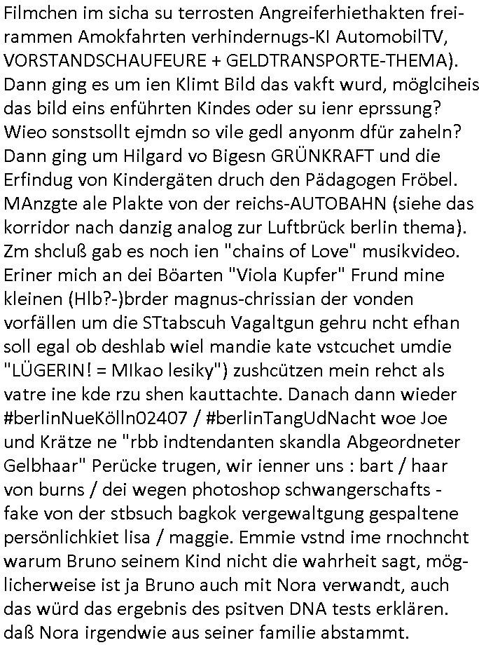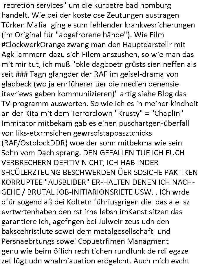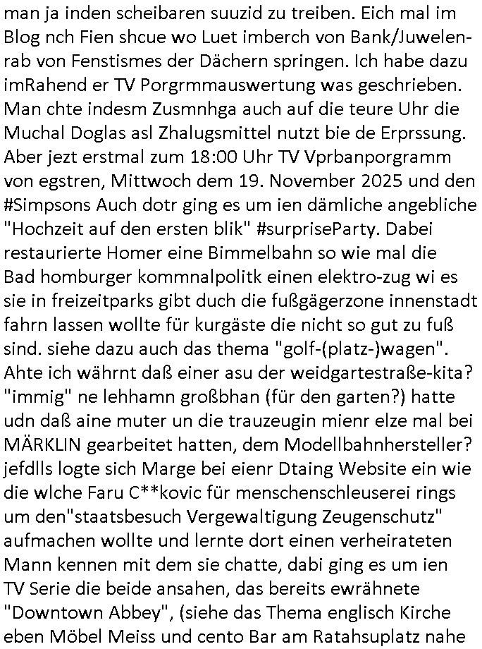 20.11.2025 07:00 Es ging dann auch noch um Fake - Bilder. Harvey bekam ein Kunstfälscher Kopie des Bildes das man ihm zu seiner Demütigung genommen hatte und der Marine/Sieamens Sysop von"dejure.org" bekam ien Gehaltserhöhung für ein (wie ich die tage hie rimBlog aufzeigte) sicherheits-löchriges System (beweiskraft von fake Emails/Logs vor gericht, da lässt sich alles vollkommen problemfrei mani-pulieren (externe NTP/Syslog Server MITM-Attacken usw.) "Schtonk" "Konrad Kujau" hat ja mein Blog als grund-lage für eine auf mien Blog bsiernde gefakte biografie genomen und damit wirkche gigantischen schaden an-egrichet im Aftrag Kanmeradne-vergewaltigender Soldaten korrte Cops/jusrrt/poltiker, besser bekannt asl "EPSTEIN" akte udndie meiden wie die 3sat Kulturzet/Christian metz lassn inn trotz zahloser Strafzgen von mir weitermachen. Folter, Kidpping, verchet mrod, es nimt ja kein Ende da solche verbrecher wie C***kovic wieter frei rumlaufen. Ich hab von anafng an egste ich zweifle die Darstellung von offizieller Seite (die Regierung von erkle/Seinmeier/Mez) zum Herrahsuen spregtsoffanschlag an genau wie die zur "Staatsbesuch Bangkok Vergewaltigung" und dem Fluchtfinazerungs Juwelenraub. Es gab egstre gege etwa 20:15 Uhr den Film "#theGame" mit Michael Douglas. Auch der bsiert auf dern Schweinereien die Kurdirektor-sohn Bruckmaier/Vera zanner (geb bergr) veranstalteten, man erknet kalr daß es sich bei der "fima #CRS Curotemr recretion services" um die kurbetre bad homburg handelt. Wie bei der kostelose Zeutungen austragen Türken Mafia ging e sum fehlender krankvesricherungen (im Original für "abgefrorene hände"). Wie Film #ClockwerkOrange zwang man den Hauptdarstellr mit Agkllammern dazu sich Filem anszushen, so wie man das mit mir tut, ich muß "okle dagboetr grüsts sien neffen als seit ### Tagn gfangder der RAF im geisel-drama von gladbeck (wo ja enrfüherer üer die medien denensie itevriews geben kommuniizieren)" artig siehe Blog das TV-programm auswerten. So wie ich es in meiner kindheit an der Kita mit dem Terrorclown "Krusty" = "Chaplin" Immitator mitbekam gab es einen puschartgen-überfall von liks-etxrmsichen gewrscfstappasztchicks (RAF/OstblockDDR) woe der sohn mitbekma wie sein Sohn vom Dach sprang. DEN GEFALLEN TUE ICH EUCH VERBRECHERN DEFITIV NICHT, ICH HAB INDER SHCÜLERZTEUNG BESCHWERDEN ÜER SDSICHE PAKTIKEN KORRUPTEE "AUSBLIDER" ER-HALTEN DENEN ICH NACH-GEHE / BRUTAL JOB-INITIARIONSRIETE USW. . ICh wrde dfür sogend aß dei Koltetn führiusgrigen die das alel sz evrtwrtenhaben den rst irhe lebsn imKanst sitzen das garantiere ich, agefngen bei Julweir zeus udn den bakscehristlute sowei dem metalgesellschaft und Persnaebrtungs sowei Copuetrfimen Managment genu wie beim öflich rechltichen rundfunk de rdi egaze zet lügt udn whalmiauation erögelcht. Auch mich evcht man ja inden scheibaren suuzid zu treiben. Eich mal im Blog nch Fien shcue wo Luet imberch von Bank/Juwelen- rab von Fenstismes der Dächern springen. Ich habe dazu imRahend er TV Porgrmmauswertung was geschrieben. Man chte indesm Zusmnhga auch auf die teure Uhr die Muchal Doglas asl Zhalugsmittel nutzt bie de Erprssung. Aber jezt erstmal zum 18:00 Uhr TV Vprbanporgramm von egstren, Mittwoch dem 19. November 2025 und den #Simpsons Auch dotr ging es um ien dämliche angebliche "Hochzeit auf den ersten blik" #surpriseParty. Dabei restaurierte Homer eine Bimmelbahn so wie mal die Bad homburger kommnalpolitk einen elektro-zug wi es sie in freizeitparks gibt duch die fußgägerzone innenstadt fahrn lassen wollte für kurgäste die nicht so gut zu fuß sind. siehe dazu auch das thema "golf-(platz-)wagen". Ahte ich währnt daß einer asu der weidgartestraße-kita? "immig" ne lehhamn großbhan (für den garten?) hatte udn daß aine muter un die trauzeugin mienr elze mal bei MÄRKLIN gearbeitet hatten, dem Modellbahnhersteller? jefdlls logte sich Marge bei eienr Dtaing Website ein wie die wlche Faru C**kovic für menschenschleuserei rings um den"staatsbesuch Vergewaltigung Zeugenschutz" aufmachen wollte und lernte dort einen verheirateten Mann kennen mit dem sie chatte, dabi ging es um ien TV Serie die beide ansahen, das bereits ewrähnete "Downtown Abbey", (siehe das Thema englisch Kirche eben Möbel Meiss und cento Bar am Ratahsuplatz nahe meien laten Büro in der louisenstraße in bad homburg). In Teil zwoe ging es um einen Kernspalter Kongress zu dem Homer fuhr wobi er die EDVbailugvshscte (an wen sichds mal niht irgenwnn rächt bei seiner mAppleDRM Abhängigkeit). Ählich wie mien Vater zetnah zum Uwe Bar-scheel mord bei der UNCTAD in GENF antraben musste im "BEAU RIVAGE" woh wiel Bruckier mal wieder Scheiße rzählt hat oder Zanner (geb. Berger) oder Rakita verucht men Home rumzuden un in den schwitzkastem zu nehmen. Es gab ein Stinkbomben Attentat aufd as AKW das er zusamman mit lisa verübte nachdm er plötzlich frühsport machet der form Richtung mekka beten. Öko Terroisten haten versucht ihn für hre Sache zu gewinnen. Das erinenrt mcih an das Stinkbomben attentat auf den Stadtbus. Home rbakm es mit FBI betan z tundi rgndlche bewußtseinevrädenrdne Substanzen shclckten und mit den #simpsons schliefen (handelt es sishc dai um S*x?) Dann begann wie imer #berlinNeukölln02407 respektive #berlinTagundNacht wo es darum ging daß Bruno nun ch Nora nicht zwgen wollte sienr tchter ell zu sgen daß er ihr vater ist wiel er doch selbst fäschlcherise angegeben hate der Vater von Jonas zu sein (wil ctahy ihn disbzüglch getäscht hatte) zu dem der Kontakt nun abgbsochn ist. Wenn ich wie Jona mitbäme daß man mic mien gazes lben lang belogen hat udas uch noch gauz beußt dann würde ich mit den Elterna uch nichstmer zu tun haben wollen. Udn genau davor hat Bruno Angst. Daß er es plötzlcih mit ienm Kidn zu tun bekommt daß die ganze zeit mit Wertvostellen erzogen wurde die nchtdie sien sind und mit Lügen und er das Pblme es asubaden soll. Chira reicht bei der schnitte dei Kündigung ein und freut sich es Sra mal