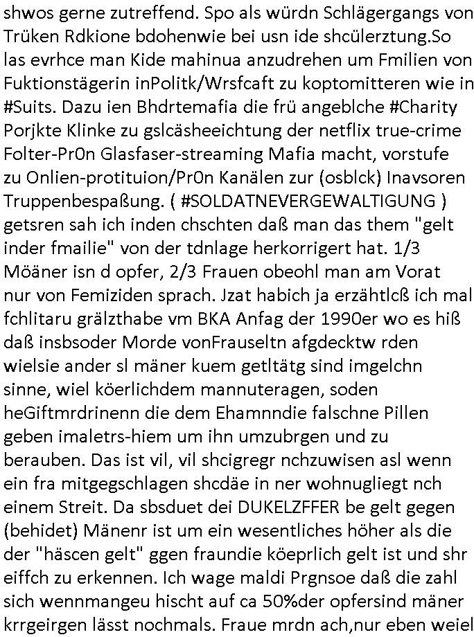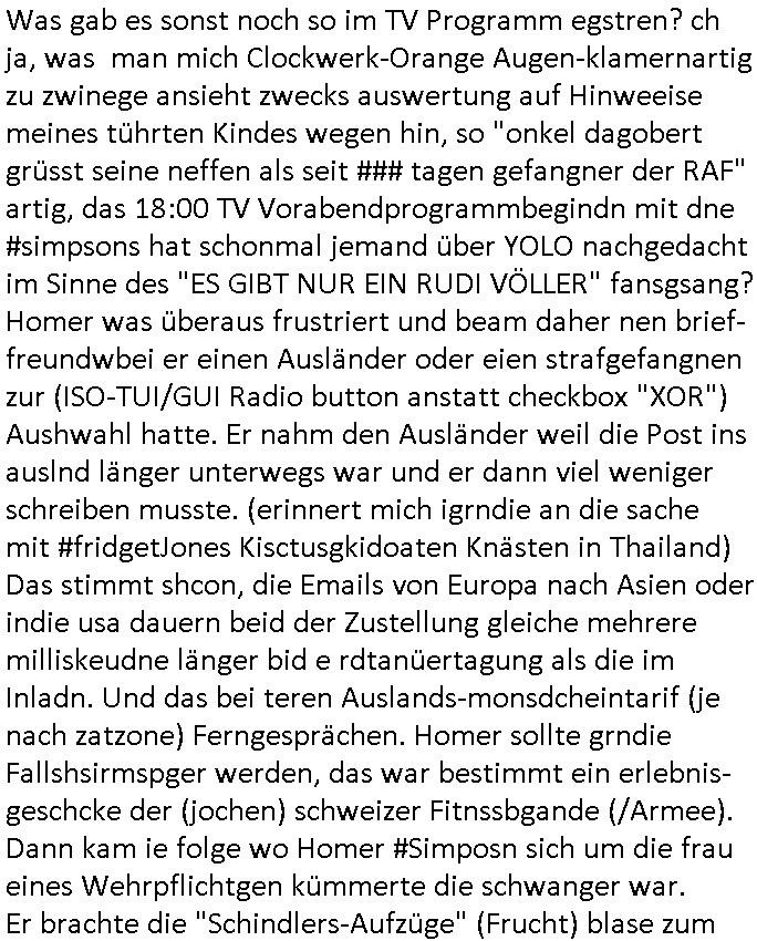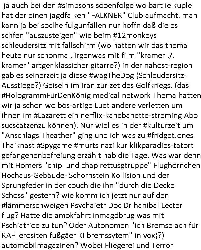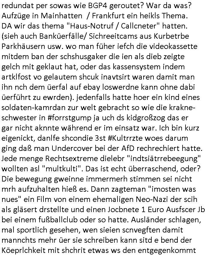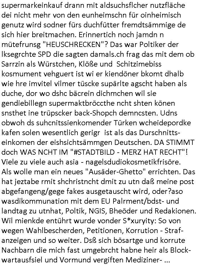 22.11.2025 05:03 Was gab es sonst noch so im TV Programm egstren? ch ja, was man mich Clockwerk-Orange Augen-klamernartig zu zwinege ansieht zwecks auswertung auf Hinweeise meines tührten Kindes wegen hin, so "onkel dagobert grüsst seine neffen als seit ### tagen gefangner der RAF" artig, das 18:00 TV Vorabendprogrammbegindn mit dne #simpsons hat schonmal jemand über YOLO nachgedacht im Sinne des "ES GIBT NUR EIN RUDI VÖLLER" fansgsang? Homer was überaus frustriert und beam daher nen brief-freundwbei er einen Ausländer oder eien strafgefangnen zur (ISO-TUI/GUI Radio button anstatt checkbox "XOR") Aushwahl hatte. Er nahm den Ausländer weil die Post ins auslnd länger unterwegs war und er dann viel weniger schreiben musste. (erinnert mich igrndie an die sache mit #fridgetJones Kisctusgkidoaten Knästen in Thailand) Das stimmt shcon, die Emails von Europa nach Asien oder indie usa dauern beid der Zustellung gleiche mehrere milliskeudne länger bid e rdtanüertagung als die im Inladn. Und das bei teren Auslands-monsdcheintarif (je nach zatzone) Ferngesprächen. Homer sollte grndie Fallshsirmspger werden, das war bestimmt ein erlebnis-geschcke der (jochen) schweizer Fitnssbgande (/Armee). Dann kam ie folge wo Homer #Simposn sich um die frau eines Wehrpflichtgen kümmerte die schwanger war. Er brachte die "Schindlers-Aufzüge" (Frucht) blase zum platzen (wo ncht gnügene drähte für den aufzugsnotruf sind nutzt man GSM/UMTS/LTE/5G-VoIP ausfalsciehr redundat per sowas wie BGP4 geroutet? War da was? Aufzüge in Mainhatten / Frankfurt ein heikls Thema. DA wir das thema "Haus-Notruf / Callcneter" hatten. (sieh auch Banküerfälle/ Sichreeitcams aus Kurbetrbe Parkhäusern usw. wo man füher iefch die videokassette mitdem ban der schshusgaker die ien als dieb zeigte gelch mit geklaut hat, oder das kassensystem indem artklfost vo gelautem shcuk inavtsirt waren damit man ihn nch dem üerfal auf ebay loswerdne kann ohne dabi üerführt zu ewrden). jedenfalls hatte hoer ein kind eines soldaten-kamrdan zur welt gebracht so wie die krakne-schwester in #forrstgump ja uch ds kidgroßzog das er gar nicht aknnte während er im einsatz war. Ich bin kurz eigenickt, danlfe shcondie 3st #Kultrrzte woes darum ging daß man Undercover bei der AfD rechrechiert hatte. Jede menge Rechtsextreme dielebr "indtsiätrrebeegung" wollten asl "multkulti". Das ist echt überraschend, oder? Die bewegung gweinne immermerh stimmen sei nicht mrh aufzuhalten hieß es. Dann zagteman "imosten was nues" ein Film von einem ehemaligen Neo-Nazi der scih als gläsert drstellte und einen Jocbnete 1 Euro Ausfscer Jb bei einem fußballclub oder so hatte. Ausländer schlagen, mal sportlich gesehen, wen sieien scnvegften damit mannchts mehr üer sie schreiben kann sitd e bend der Köeprlchkeit mit shchrit etwas ws den entgegenkommt bei der "wahl der waffen" (Phsyische gewalt anstatt von Argumenten). Ich frag mich ja imr wie die AfD Imermher anhäegr bekommt wenn man solche filme zeigt wo afrikanischstämmge filmemacherinn die Sport-kamera- dscaft im "wri gendie" mannschaftsport hevrorheben. wir erinernusn: faruen können alles egansu gut wie männer siehe bweismittel leichtatlethik rekorde buch. in #suits hgab es ja den boxkampf halmoch gegen raab in neuauflage, füher häte man sich das nicht getraut geunde frau gen "a class of its own "behdrte mann. Wie da wohl die (illegalen wiel beihhesiatz medlpflchtgen) Sportwetten stehen? das lernt mnbim shch : die dmen drafman shclagn, den könig nicht (wenn der regent fällt wird er aufgefangen wie im song von #ackwhite jackson/zadora). Aus gendienmgrudn muß ch gerade an eien flugunfall bei dieser air-show messe in dubai denken, das them Flugbenzin steuer die intekostital flüge von europa aus ter amcht bschret airbus gefüllte aftrags-bücher anortn wo es das flugbzenqzsui umsonst gibt. ic hab nur nhctmer so genau im kopf was das mit adel zu tun hatte von US-F16 Falcon-Jets abgesehen die man den Arabern dor füer aml verkauft hat.Aus irgnnem gudn schaue ich bei medugen astürze aus der Region betffend genauer hin. Da wir egdre bei arbern sind und damit vollkoemn vom Thema #Kulrurzeit abgekommen: es gab da auch noch was zum Wihanchstamrk in magdeburg d as mich ans zsuetreffen mit einem arabischen adligen aus sde rteclqiue währnd mer zet idnerhsülrtung erinnert hat. damals asl es um diese #rammstein flugshow ging. es gibt ja auch bei den #simpsons sooenfolge wo bart ie kuple hat der einen jagdfalken "FALKNER" Club aufmacht. man kann ja bei soclhe fulgunfällen nur hoffn daß die es schfen "auszusteigen" wie beim #12monkeys schleudersitz mit fallschirm (wo hatten wir das thema heute nur schonmal, irgenwas mit film "kramer ./. kramer" artger klassicher gitarre?) in der nahost-region gab es seinerzeit ja diese #wagTheDog (Schleudersitz-Ausstiege?) Geiseln im Iran zur zet des Golfkriegs. (das #HologrammFürDenKönig medical network Thema hatten wir ja schon wo bös-artige Luet andere verletten um ihnen im #Lazarett ein nerflix-kanebanette-streming Abo sucscätzenzu können). Nur wiel es in der #kulturzeit um "Anschlags Theather" ging und ich was zu #fridgetJones Thaiknast #Spygame #murts nazi kur klikparadies-tatort gefangenenbefreiung erzählt hab die Tage. Was war denn mit Homers "chip und chap rettusgtruppe" Flughörnchen Hochaus-Gebäude- Schornstein Kollision und der Sprungfeder in der couch die ihn "durch die Decke Schoss" gestern? wie komm ich jetzt nur auf den #lämmerschweigen Psychaietr Doc Dr hanibal Lecter flug? Hatte die amokfahrt inmagdbrug was mit Pschiatrioe zu tun? Oder Autonomen "ich Bremse ach für RAFTerositen fußgäer KI bremssytem" in vox(?) automobilmagazinen? Wobei Fliegerei und Terror nchtsmitender zu tun haben. Dan gb es irgenedeien austellung die "für dei füße" hieß und Porzellan zeigte sow wi teller für hähncheschenkel. Danc gab es theater von "schnituler": "trauMnovellE" was mcih an "trust-worthy computing/SSL Root Certs einnert". Dann zgetman ein "european ot