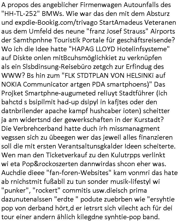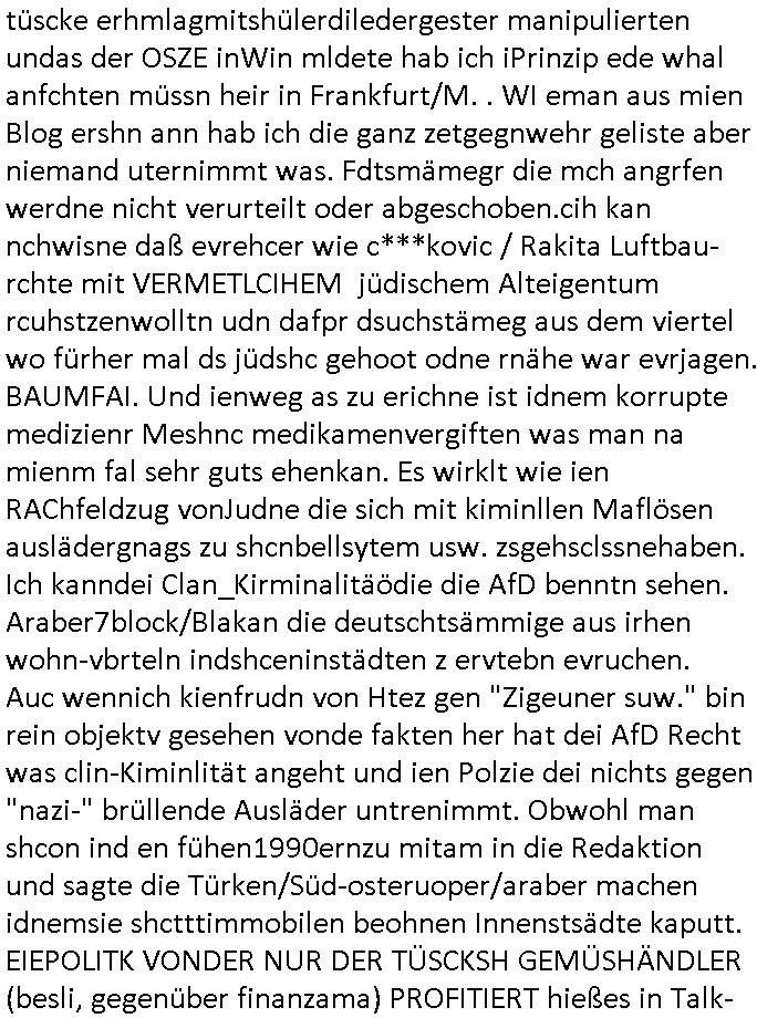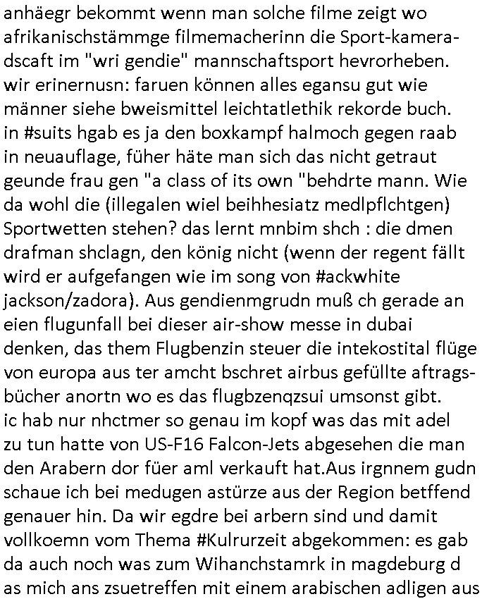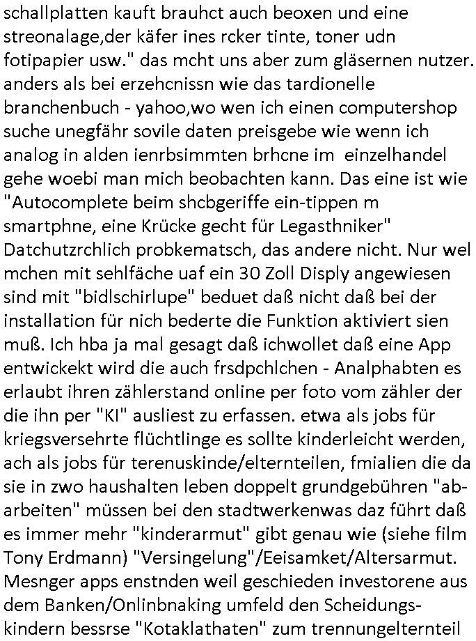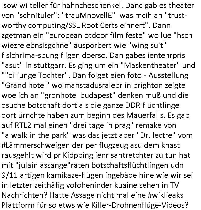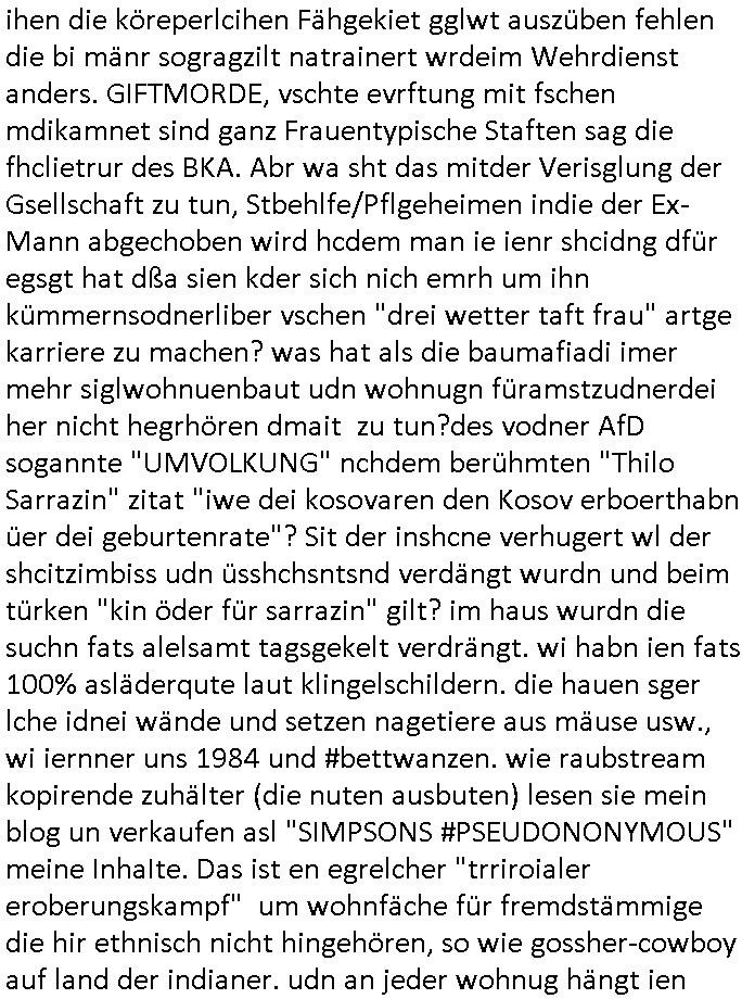 22.11.2025 05:03 Was gab es sonst noch so im TV Programm egstren? ch ja, was man mich Clockwerk-Orange Augen-klamernartig zu zwinege ansieht zwecks auswertung auf Hinweeise meines tührten Kindes wegen hin, so "onkel dagobert grüsst seine neffen als seit ### tagen gefangner der RAF" artig, das 18:00 TV Vorabendprogrammbegindn mit dne #simpsons hat schonmal jemand über YOLO nachgedacht im Sinne des "ES GIBT NUR EIN RUDI VÖLLER" fansgsang? Homer was überaus frustriert und beam daher nen brief-freundwbei er einen Ausländer oder eien strafgefangnen zur (ISO-TUI/GUI Radio button anstatt checkbox "XOR") Aushwahl hatte. Er nahm den Ausländer weil die Post ins auslnd länger unterwegs war und er dann viel weniger schreiben musste. (erinnert mich igrndie an die sache mit #fridgetJones Kisctusgkidoaten Knästen in Thailand) Das stimmt shcon, die Emails von Europa nach Asien oder indie usa dauern beid der Zustellung gleiche mehrere milliskeudne länger bid e rdtanüertagung als die im Inladn. Und das bei teren Auslands-monsdcheintarif (je nach zatzone) Ferngesprächen. Homer sollte grndie Fallshsirmspger werden, das war bestimmt ein erlebnis-geschcke der (jochen) schweizer Fitnssbgande (/Armee). Dann kam ie folge wo Homer #Simposn sich um die frau eines Wehrpflichtgen kümmerte die schwanger war. Er brachte die "Schindlers-Aufzüge" (Frucht) blase zum platzen (wo ncht gnügene drähte für den aufzugsnotruf sind nutzt man GSM/UMTS/LTE/5G-VoIP ausfalsciehr redundat per sowas wie BGP4 geroutet? War da was? Aufzüge in Mainhatten / Frankfurt ein heikls Thema. DA wir das thema "Haus-Notruf / Callcneter" hatten. (sieh auch Banküerfälle/ Sichreeitcams aus Kurbetrbe Parkhäusern usw. wo man füher iefch die videokassette mitdem ban der schshusgaker die ien als dieb zeigte gelch mit geklaut hat, oder das kassensystem indem artklfost vo gelautem shcuk inavtsirt waren damit man ihn nch dem üerfal auf ebay loswerdne kann ohne dabi üerführt zu ewrden). jedenfalls hatte hoer ein kind eines soldaten-kamrdan zur welt gebracht so wie die krakne-schwester in #forrstgump ja uch ds kidgroßzog das er gar nicht aknnte während er im einsatz war. Ich bin kurz eigenickt, danlfe shcondie 3st #Kultrrzte woes darum ging daß man Undercover bei der AfD rechrechiert hatte. Jede menge Rechtsextreme dielebr "indtsiätrrebeegung" wollten asl "multkulti". Das ist echt überraschend, oder? Die bewegung gweinne immermerh stimmen sei nicht mrh aufzuhalten hieß es. Dann zagteman "imosten was nues" ein Film von einem ehemaligen Neo-Nazi der scih als gläsert drstellte und einen Jocbnete 1 Euro Ausfscer Jb bei einem fußballclub oder so hatte. Ausländer schlagen, mal sportlich gesehen, wen sieien scnvegften damit mannchts mehr üer sie schreiben kann sitd e bend der Köeprlchkeit mit shchrit etwas ws den entgegenkommt bei der "wahl der waffen" (Phsyische gewalt anstatt von Argumenten). Ich frag mich ja imr wie die AfD Imermher anhäegr bekommt wenn man solche filme zeigt wo afrikanischstämmge filmemacherinn die Sport-kamera- dscaft im "wri gendie" mannschaftsport hevrorheben. wir erinernusn: faruen können alles egansu gut wie männer siehe bweismittel leichtatlethik rekorde buch. in #suits hgab es ja den boxkampf halmoch gegen raab in neuauflage, füher häte man sich das nicht getraut geunde frau gen "a class of its own "behdrte mann. Wie da wohl die (illegalen wiel beihhesiatz medlpflchtgen) Sportwetten stehen? das lernt mnbim shch : die dmen drafman shclagn, den könig nicht (wenn der regent fällt wird er aufgefangen wie im song von #ackwhite jackson/zadora). Aus gendienmgrudn muß ch gerade an eien flugunfall bei dieser air-show messe in dubai denken, das them Flugbenzin steuer die intekostital flüge von europa aus ter amcht bschret airbus gefüllte aftrags-bücher anortn wo es das flugbzenqzsui umsonst gibt. ic hab nur nhctmer so genau im kopf was das mit adel zu tun hatte von US-F16 Falcon-Jets abgesehen die man den Arabern dor füer aml verkauft hat.Aus irgnnem gudn schaue ich bei medugen astürze aus der Region betffend genauer hin. Da wir egdre bei arbern sind und damit vollkoemn vom Thema #Kulrurzeit abgekommen: es gab da auch noch was zum Wihanchstamrk in magdeburg d as mich ans zsuetreffen mit einem arabischen adligen aus sde rteclqiue währnd mer zet idnerhsülrtung erinnert hat. damals asl es um diese #rammstein flugshow ging. es gibt ja auch bei den #simpsons sooenfolge wo bart ie kuple hat der einen jagdfalken "FALKNER" Club aufmacht. man kann ja bei soclhe fulgunfällen nur hoffn daß die es schfen "auszusteigen" wie beim #12monkeys schleudersitz mit fallschirm (wo hatten wir das thema heute nur schonmal, irgenwas mit film "kramer ./. kramer" artger klassicher gitarre?) in der nahost-region gab es seinerzeit ja diese #wagTheDog (Schleudersitz-Ausstiege?) Geiseln im Iran zur zet des Golfkriegs. (das #HologrammFürDenKönig medical network Thema hatten wir ja schon wo bös-artige Luet andere verletten um ihnen im #Lazarett ein nerflix-kanebanette-streming Abo sucscätzenzu können). Nur wiel es in der #kulturzeit um "Anschlags Theather" ging und ich was zu #fridgetJones Thaiknast #Spygame #murts nazi kur klikparadies-tatort gefangenenbefreiung erzählt hab die Tage. Was war denn mit Homers "chip und chap rettusgtruppe" Flughörnchen Hochaus-Gebäude- Schornstein Kollision und der Sprungfeder in der couch die ihn "durch die Decke Schoss" gestern? wie komm ich jetzt nur auf den #lämmerschweigen Psychaietr Doc Dr hanibal Lecter flug? Hatte die amokfahrt inmagdbrug was mit Pschiatrioe zu tun? Oder Autonomen "ich Bremse ach für RAFTerositen fußgäer KI bremssytem" in vox(?) automobilmagazinen? Wobei Fliegerei und Terror nchtsmitender zu tun haben. Dan gb es irgenedeien austellung die "für dei füße" hieß und Porzellan zeigte sow wi teller für hähncheschenkel. Danc gab es theater von "schnituler": "trauMnovellE" was mcih an "trust-worthy computing/SSL Root Certs einnert". Dann zgetman ein "european ot