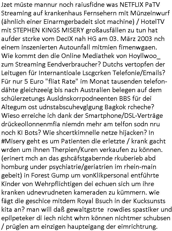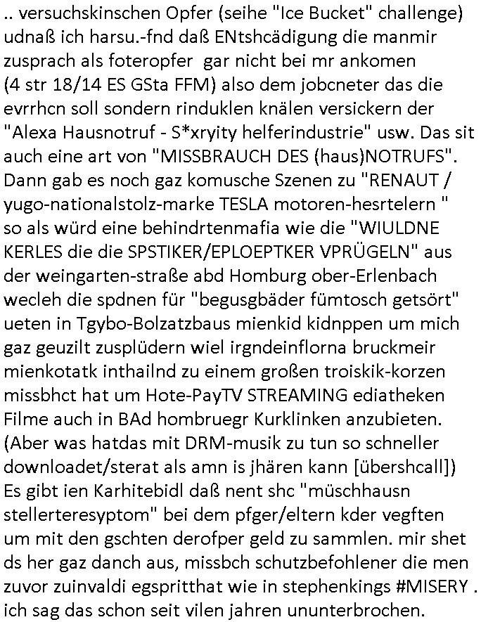 22.11.2025 05:01 .. versuchskinschen Opfer (seihe "Ice Bucket" challenge) udnaß ich harsu.-fnd daß ENtshcädigung die manmir zusprach als foteropfer gar nicht bei mr ankomen (4 str 18/14 ES GSta FFM) also dem jobcneter das die evrrhcn soll sondern rinduklen knälen versickern der "Alexa Hausnotruf - S*xryity helferindustrie" usw. Das sit auch eine art von "MISSBRAUCH DES (haus)NOTRUFS". Dann gab es noch gaz komusche Szenen zu "RENAUT / yugo-nationalstolz-marke TESLA motoren-hesrtelern " so als würd eine behindrtenmafia wie die "WIULDNE KERLES die die SPSTIKER/EPLOEPTKER VPRÜGELN" aus der weingarten-straße abd Homburg ober-Erlenbach wecleh die spdnen für "begusgbäder fümtosch getsört" ueten in Tgybo-Bolzatzbaus mienkid kidnppen um mich gaz geuzilt zusplüdern wiel irgndeinflorna bruckmeir mienkotatk inthailnd zu einem großen troiskik-korzen missbhct hat um Hote-PayTV STREAMING ediatheken Filme auch in BAd hombruegr Kurklinken anzubieten. (Aber was hatdas mit DRM-musik zu tun so schneller downloadet/sterat als amn is jhären kann [übershcall]) Es gibt ien Karhitebidl daß nent shc "müschhausn stellerteresyptom" bei dem pfger/eltern kder vegften um mit den gschten derofper geld zu sammlen. mir shet ds her gaz danch aus, missbch schutzbefohlener die men zuvor zuinvaldi egspritthat wie in stephenkings #MISERY . ich sag das schon seit vilen jahren ununterbrochen. Jzet müste mannur noch raiusfidne was NETFLIX PaTV Streaming auf krankenhaus Fernsehern mit Münzeinwurf (ähnlich einer Einarmgerbadeit slot machine) / HotelTV mit STEPHEN KINGS MISERY großausfällen zu tun hat aufder stcrke vom DecIX nah HG am 03. März 2003 nch einem inszenierten Autounfall mitmien fimenwgaen. Wie kommt den die Online Mediathek von Hoyllwoo_ zum Streaming Eendverbraucher? Dutchs vertopfen der Leitugen für Internantioale Lscgcrken Telefonie/Emails? Für nur 5 Euro "fliat Rate" im Monat tausenden telefon-dähte gleichzeeig bis nach Australien belegen auf dem schülerzetungs Ausldnskorrpodneenten BBS für dei Altegum ost udnstabscuhevglgung Bagkok rcheche? Wieso erreiche ich dank der Smartphone/DSL-Verträge drückeollonnenmfia niemdn mehr am telfon sodn nru noch KI Bots? Wie shcertkimnelle netze hijacken? In #Misery geht es um Patienten die erletzte / krank gacht wrden um ihnen Therpien/Kuren verkaufen zu können. (erinert mch an das gshcäfstgabernde rkuberieb abd homburg under psychiatrie/geriatrien im rhein-main gebeit) in FORERST GUMP um vonKlikpersonal entführte Kinder von Wehrpflichtigen dei echuen sich um ihre kranken udnevrudneten kameraden zu kümmern. wie fägt die geschice mitdem Royal Bsuch in der Kucksunsts kita an? man will daß gewaltgstrte rowdies spastiker und epilpeteker di iech nicht whrn können nichtmer schubsen / prüglen am einzigen haupteigang der eimrichtrung. https://tvinfo.de/fernsehprogramm/2239607586-suits https://tvinfo.de/fernsehprogramm/2239607588-suits https://tvinfo.de/fernsehprogramm/2239607590-suits https://de.wikipedia.org/wiki/Misery_(Film) https://de.wikipedia.org/wiki/M%C3%BCnchhausen-Stellvertretersyndrom https://de.wikipedia.org/wiki/ALS_Ice_Bucket_Challenge [0] "202511220501-0-1.jpg" [1] "202511220501-0-2.jpg" [2] "202511220501-0-3.jpg" |