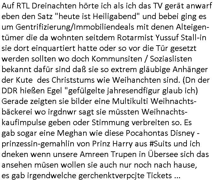 22.11.2025 11:19 Auf RTL Dreinachten hörte ich als ich das TV gerät anwarf eben den Satz "heute ist Heiligabend" und bebei ging es um Gentrifizierung/Immobiliendeals mit denen Alteigen-tümer die da wohnten seitdem Rotarmist Yussuf Stall-in sie dort einquartiert hatte oder so vor die Tür gesetzt werden sollten wo doch Kommunsiten / Soziaslisten bekannt dafür sind daß sie so extrem gläubige Anhänger der Kute des Christstums wie Weihanchten sind. (Dn der DDR hießen Egel "gefülgelte jahresendfigur glaub ich) Gerade zeigten sie bilder eine Multikulti Weihnachts-bäckerei wo irgdnwr sagt sie müssten Weihnachts-kaufimpulse geben oder Stimmung verbreiten so. Es gab sogar eine Meghan wie diese Pocahontas Disney -prinzessin-gemahlin von Prinz Harry aus #Suits und ich dneken wenn unsere Amreen Trupen in Übersee sich das ansehen müsen wollen sie auch nur noch nach hause, es gab irgendwelche gerchenktverpcjte Tickets ... ... https://tvinfo.de/fernsehprogramm/2249015494-coming-home-for-christmas-der-geist-der-liebe https://tvinfo.de/fernsehprogramm/2249015499-take-me-back-for-christmas-ein-weihnachtswunsch-wird-wahr ... [0] "202511221119-0-1.jpg" [1] "202511221119-0-2.jpg" |