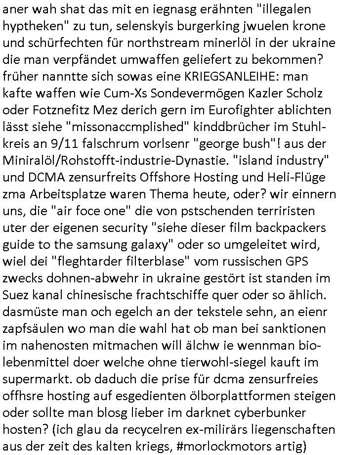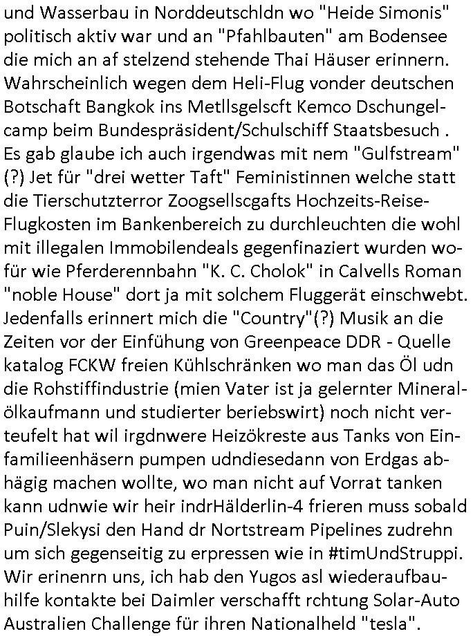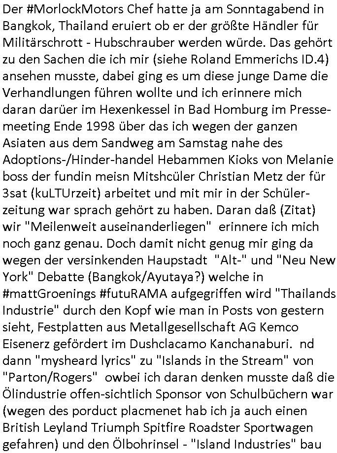 25.11.2025 04:45 Der #MorlockMotors Chef hatte ja am Sonntagabend in Bangkok, Thailand eruiert ob er der größte Händler für Militärschrott - Hubschrauber werden würde. Das gehört zu den Sachen die ich mir (siehe Roland Emmerichs ID.4) ansehen musste, dabei ging es um diese junge Dame die Verhandlungen führen wollte und ich erinnere mich daran darüer im Hexenkessel in Bad Homburg im Presse-meeting Ende 1998 über das ich wegen der ganzen Asiaten aus dem Sandweg am Samstag nahe des Adoptions-/Hinder-handel Hebammen Kioks von Melanie boss der fundin meisn Mitshcüler Christian Metz der für 3sat (kuLTUrzeit) arbeitet und mit mir in der Schüler-zeitung war sprach gehört zu haben. Daran daß (Zitat) wir "Meilenweit auseinanderliegen" erinnere ich mich noch ganz genau. Doch damit nicht genug mir ging da wegen der versinkenden Haupstadt "Alt-" und "Neu New York" Debatte (Bangkok/Ayutaya?) welche in #mattGroenings #futuRAMA aufgegriffen wird "Thailands Industrie" durch den Kopf wie man in Posts von gestern sieht, Festplatten aus Metallgesellschaft AG Kemco Eisenerz gefördert im Dushclacamo Kanchanaburi. nd dann "mysheard lyrics" zu "Islands in the Stream" von "Parton/Rogers" owbei ich daran denken musste daß die Ölindustrie offen-sichtlich Sponsor von Schulbüchern war (wegen des porduct placmenet hab ich ja auch einen British Leyland Triumph Spitfire Roadster Sportwagen gefahren) und den Ölbohrinsel - "Island Industries" bau und Wasserbau in Norddeutschldn wo "Heide Simonis" politisch aktiv war und an "Pfahlbauten" am Bodensee die mich an af stelzend stehende Thai Häuser erinnern. Wahrscheinlich wegen dem Heli-Flug vonder deutschen Botschaft Bangkok ins Metllsgelscft Kemco Dschungel-camp beim Bundespräsident/Schulschiff Staatsbesuch . Es gab glaube ich auch irgendwas mit nem "Gulfstream" (?) Jet für "drei wetter Taft" Feministinnen welche statt die Tierschutzterror Zoogsellscgafts Hochzeits-Reise-Flugkosten im Bankenbereich zu durchleuchten die wohl mit illegalen Immobilendeals gegenfinaziert wurden wo-für wie Pferderennbahn "K. C. Cholok" in Calvells Roman "noble House" dort ja mit solchem Fluggerät einschwebt. Jedenfalls erinnert mich die "Country"(?) Musik an die Zeiten vor der Einfühung von Greenpeace DDR - Quelle katalog FCKW freien Kühlschränken wo man das Öl udn die Rohstiffindustrie (mien Vater ist ja gelernter Mineral-ölkaufmann und studierter beriebswirt) noch nicht ver- teufelt hat wil irgdnwere Heizökreste aus Tanks von Ein-familieenhäsern pumpen udndiesedann von Erdgas ab-hägig machen wollte, wo man nicht auf Vorrat tanken kann udnwie wir heir indrHälderlin-4 frieren muss sobald Puin/Slekysi den Hand dr Nortstream Pipelines zudrehn um sich gegenseitig zu erpressen wie in #timUndStruppi. Wir erinenrn uns, ich hab den Yugos asl wiederaufbau-hilfe kontakte bei Daimler verschafft rchtung Solar-Auto Australien Challenge für ihren Nationalheld "tesla". https://tvinfo.de/fernsehprogramm/2252830517-morlock-motors-big-deals-im-westerwald https://www.news.de/tv-aktuell/858523765/morlock-motors-big-deals-im-westerwald-verpasst-wiederholung-online-in-der-kabel-eins-mediathek-kabel-eins-sendung-vom-20-11-2025-in-mediathek-nachschauen/1/ https://futurama.fandom.com/wiki/Old_New_York https://en.wikipedia.org/wiki/Noble_House_(novel) ( https://www.bild.de/politik/ausland-und-internationales/britische-zeitung-vermutet-wurde-der-friedensplan-in-moskau-verfasst-6922c248b524e0ce7f1c555f ) [0] "202511250445-0-1.jpg" [1] "202511250445-0-2.jpg" [2] "202511250445-0-3.jpg" |