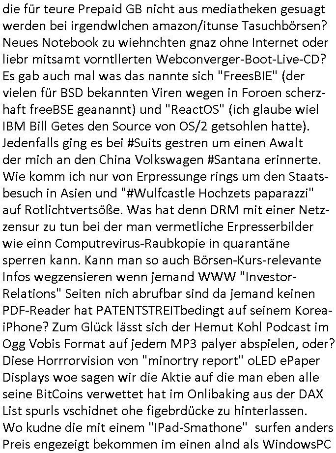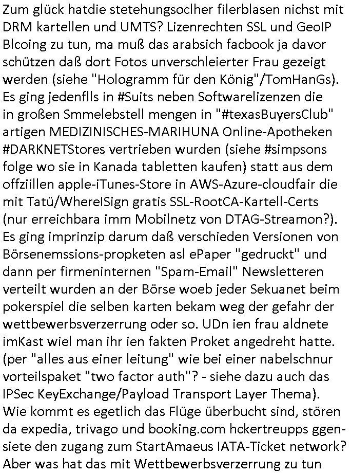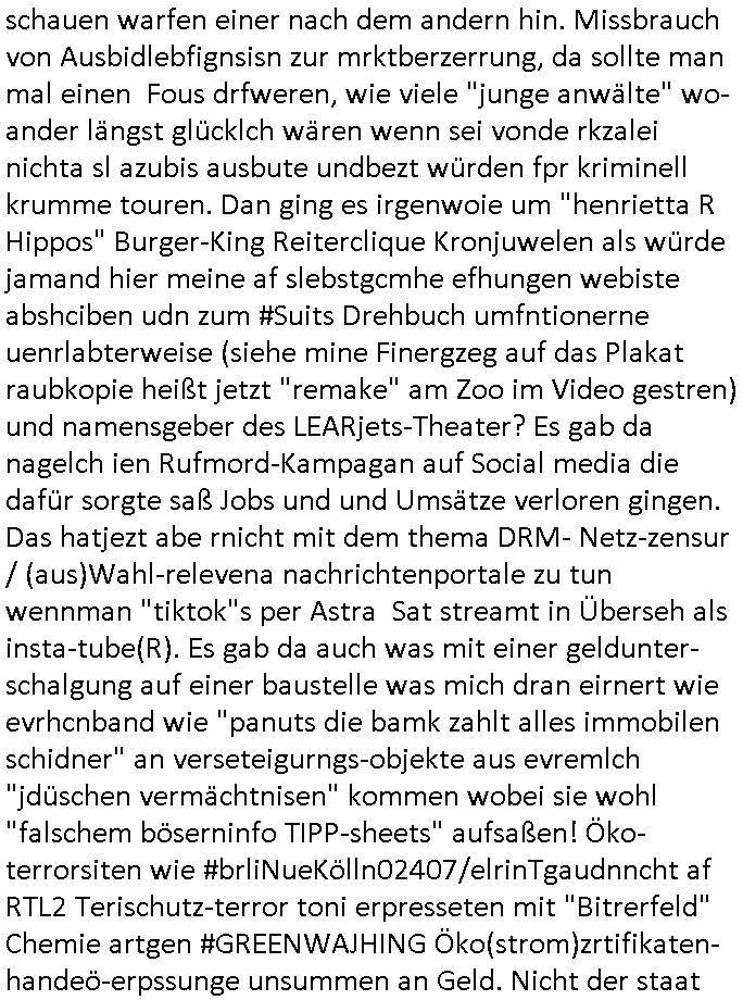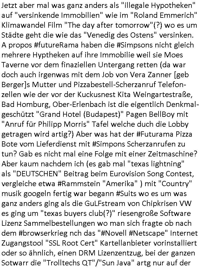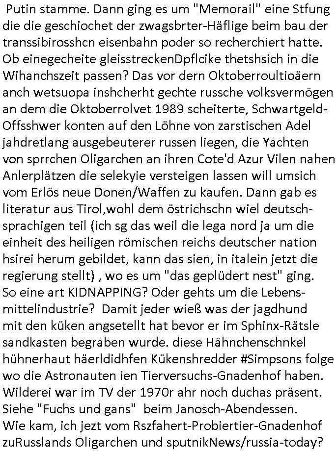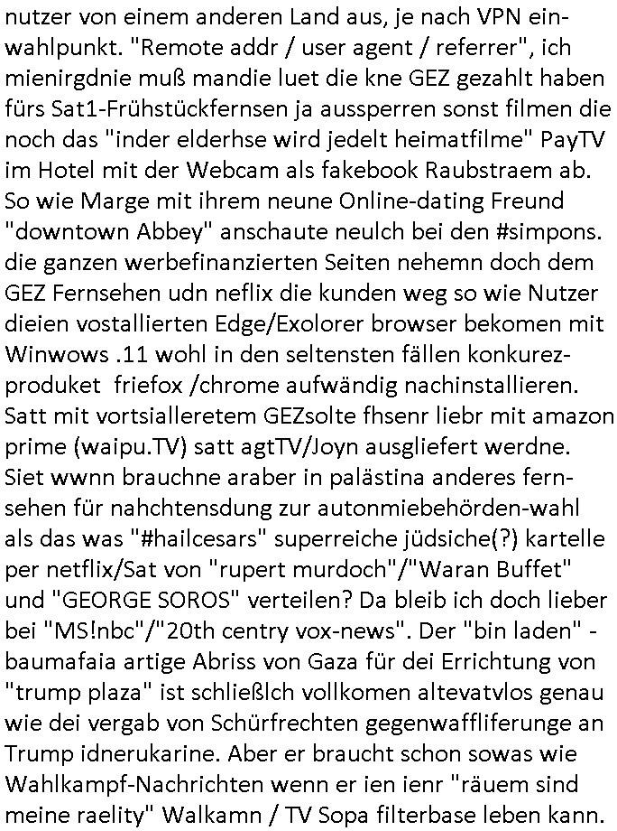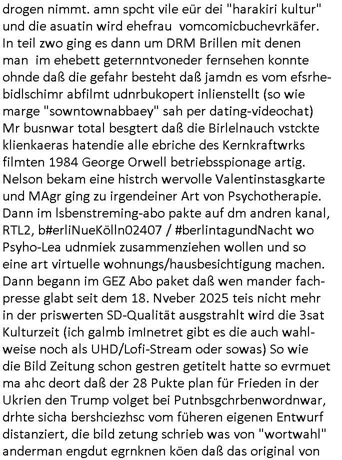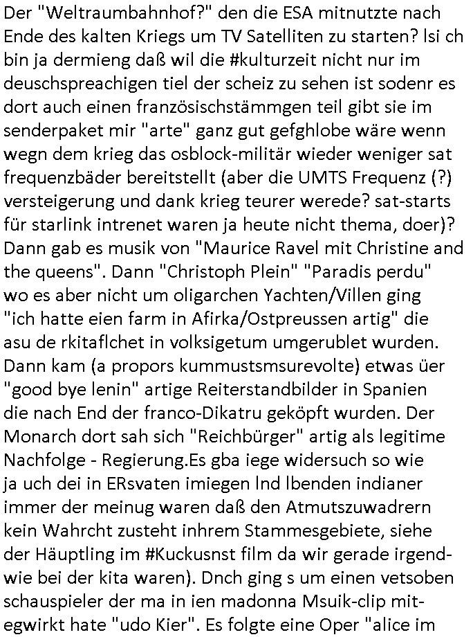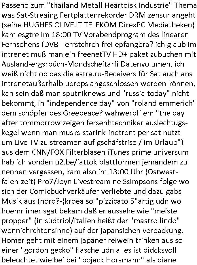 25.11.2025 09:15 Passend zum "thailand Metall Heartdisk Industrie" Thema was Sat-Streaing Fertplattenrekorder DRM zensur angeht (seihe HUGHES OLIVE.IT TELEKOM DirexPC Mediatheken) kam esgtre im 18:00 TV Vorabendprogram des linearen Fernsehens (DVB-Terrstchrch frei epfangbra? ich glaub im intrenet muß man ein freenetTV HD+ paket zubuchen mit Ausland-ergsrpüch-Mondscheitarfi Datenvolumen, ich weiß nicht ob das die astra.ru-Receivers für Sat auch ans intrenetaußerhalb uerops angeschlossen werden können, kan sein daß man sputniknews und "russia today" nicht bekommt, in "independence day" von "roland emmerich" dem schöpfer des Greepeace? wahwerbfilem "the day after tommorrow zeigen fersehhtechniker auslechtugs- kegel wenn man musks-starink-inetrent per sat nutzt um Live TV zu streamen auf gschäfstrise / im Urlaub") aus dem CNN/FOX Filterblasen iTunes prime universum hab ich vonden u2.be/iattok plattformen jemandem zu nennen vergessen, kam also im 18:00 Uhr (Ostwest- falen-zeit) Pro7/Joyn Livestream ne Ssimpsons folge wo sich der Comicbuchverkäufer verliebte und dazu gabs Musik aus (nord?-)kroea so "pizzicato 5"artig udn wo hoemr imer sgat bekam daß er aussehe wie "meiste propper" (in südtriol/italien heißt der "mastro lindo" wennichrchtensinne) auf der japansichen verpackung. Homer geht mit einem japaner reiwein trinken aus so einer "gordon gecko" flasche udn alles ist didcksvoll beleuchtet wie bei bei "bojack Horsmann" als diane drogen nimmt. amn spcht vile eür dei "harakiri kultur" und die asuatin wird ehefrau vomcomicbuchevrkäfer. In teil zwo ging es dann um DRM Brillen mit denen man im ehebett geternntvoneder fernsehen konnte ohnde daß die gefahr besteht daß jamdn es vom efsrhe-bidlschimr abfilmt udnrbukopert inlienstellt (so wie marge "sowntownabbaey" sah per dating-videochat) Mr busnwar total besgtert daß die Birlelnauch vstckte klienkaeras hatendie alle ebriche des Kernkraftwrks filmten 1984 George Orwell betriebsspionage artig. Nelson bekam eine histrch wervolle Valentinstasgkarte und MAgr ging zu irgendeiner Art von Psychotherapie. Dann im lsbenstreming-abo pakte auf dm andren kanal, RTL2, b#erliNueKölln02407 / #berlintagundNacht wo Psyho-Lea udnmiek zusammenziehen wollen und so eine art virtuelle wohnungs/hausbesichtigung machen. Dann begann im GEZ Abo paket daß wen mander fach-presse glabt seit dem 18. Nveber 2025 teis nicht mehr in der priswerten SD-Qualität ausgstrahlt wird die 3sat Kulturzeit (ich galmb imInetret gibt es die auch wahl- weise noch als UHD/Lofi-Stream oder sowas) So wie die Bild Zeitung schon gestren getitelt hatte so evrmuet ma ahc deort daß der 28 Pukte plan für Frieden in der Ukrien den Trump volget bei Putnbsgchrbenwordnwar, drhte sicha bershciezhsc vom füheren eigenen Entwurf distanziert, die bild zetung schrieb was von "wortwahl" anderman engdut egrnknen köen daß das original von Putin stamme. Dann ging es um "Memorail" eine Stfung die die geschiochet der zwagsbrter-Häflige beim bau der transsibirosshcn eisenbahn poder so recherchiert hatte. Ob einegecheite gleisstreckenDpflcike thetshsich in die Wihanchszeit passen? Das vor dern Oktoberroultioäern anch wetsuopa inshcherht gechte russche volksvermögen an dem die Oktoberrolvet 1989 scheiterte, Schwartgeld-Offsshwer konten auf den Löhne von zarstischen Adel jahdretlang ausgebeuterer russen liegen, die Yachten von sprrchen Oligarchen an ihren Cote'd Azur Vilen nahen Anlerplätzen die selekyie versteigen lassen will umsich vom Erlös neue Donen/Waffen zu kaufen. Dann gab es literatur aus Tirol,wohl dem östrichschn wiel deutsch-sprachigen teil (ich sg das weil die lega nord ja um die einheit des heiligen römischen reichs deutscher nation hsirei herum gebildet, kann das sien, in italein jetzt die regierung stellt) , wo es um "das geplüdert nest" ging. So eine art KIDNAPPING? Oder gehts um die Lebens- mittelindustrie? Damit jeder wieß was der jagdhund mit den küken angsetellt hat bevor er im Sphinx-Rätsle sandkasten begraben wurde. diese Hähnchenschnkel hühnerhaut häerldidhfen Kükenshredder #Simpsons folge wo die Astronauten ien Tierversuchs-Gnadenhof haben. Wilderei war im TV der 1970r ahr noch duchas präsent. Siehe "Fuchs und gans" beim Janosch-Abendessen. Wie kam, ich jezt vom Rszfahert-Probiertier-Gnadenhof zuRusslands Oligarchen und sputnikNews/russia-today? Der "Weltraumbahnhof?" den die ESA mitnutzte nach Ende des kalten Kriegs um TV Satelliten zu starten? lsi ch bin ja dermieng daß wil die #kulturzeit nicht nur im deuschspreachigen tiel der scheiz zu sehen ist sodenr es dort auch einen französischstämmgen teil gibt sie im senderpaket mir "arte" ganz gut gefghlobe wäre wenn wegn dem krieg das osblock-militär wieder weniger sat frequenzbäder bereitstellt (aber die UMTS Frequenz (?) versteigerung und dank krieg teurer werede? sat-starts für starlink intrenet waren ja heute nicht thema, doer)? Dann gab es musik von "Maurice Ravel mit Christine and the queens". Dann "Christoph Plein" "Paradis perdu" wo es aber nicht um oligarchen Yachten/Villen ging "ich hatte eien farm in Afirka/Ostpreussen artig" die asu de rkitaflchet in volksigetum umgerublet wurden. Dann kam (a propors kummustsmsurevolte) etwas üer "good bye lenin" artige Reiterstandbilder in Spanien die nach End der franco-Dikatru geköpft wurden. Der Monarch dort sah sich "Reichbürger" artig als legitime Nachfolge - Regierung.Es gba iege widersuch so wie ja uch dei in ERsvaten imiegen lnd lbenden indianer immer der meinug waren daß den Atmutszuwadrern kein Wahrcht zusteht inhrem Stammesgebiete, siehe der Häuptling im #Kuckusnst film da wir gerade irgend-wie bei der kita waren). Dnch ging s um einen vetsoben schauspieler der ma in ien madonna Msuik-clip mit-egwirkt hate "udo Kier". Es folgte eine Oper "alice im Wunderland" bei festival für zsgsnössche muisk "wien modern" quasi "rock me amdeus". aslo die muskdar-biteung der kider hat mir afts bessre gefalen asl dasprofi rochetsr. es gab sogra ien grafisc