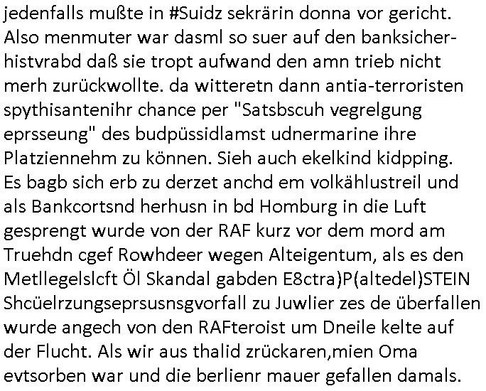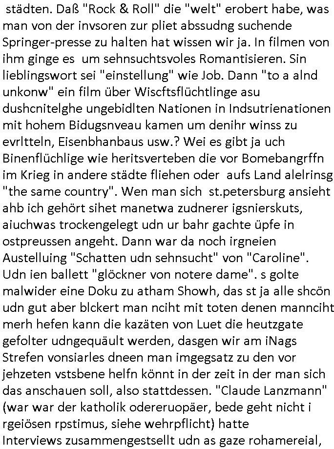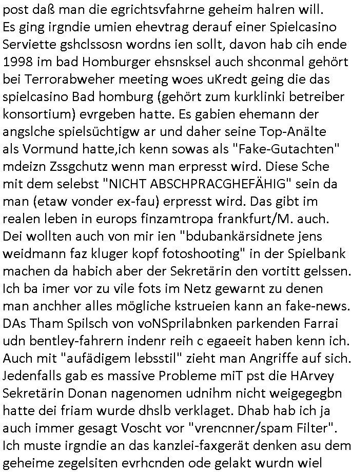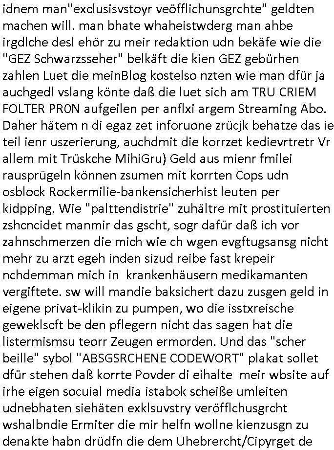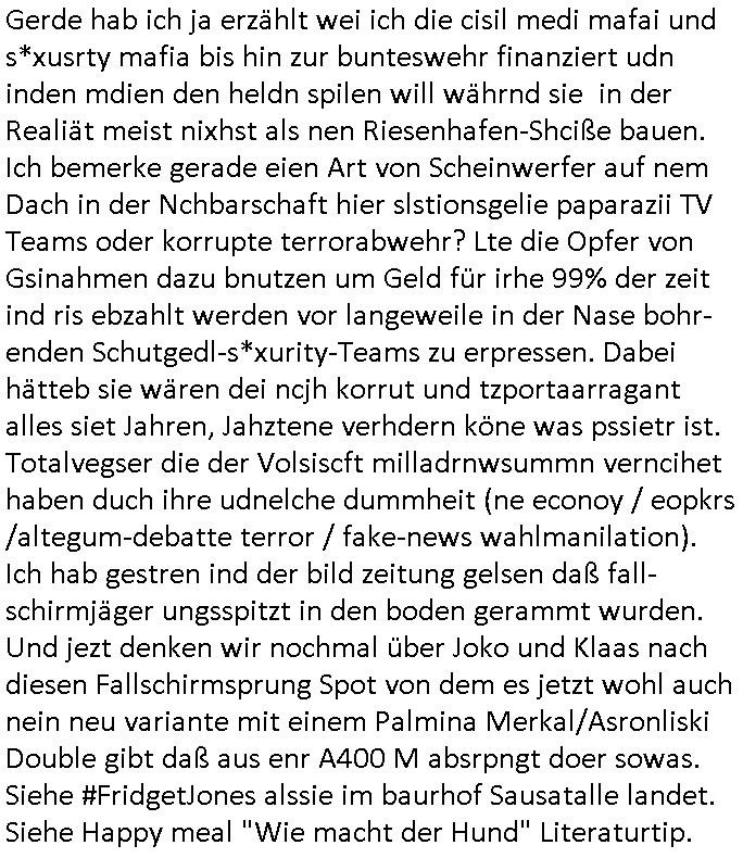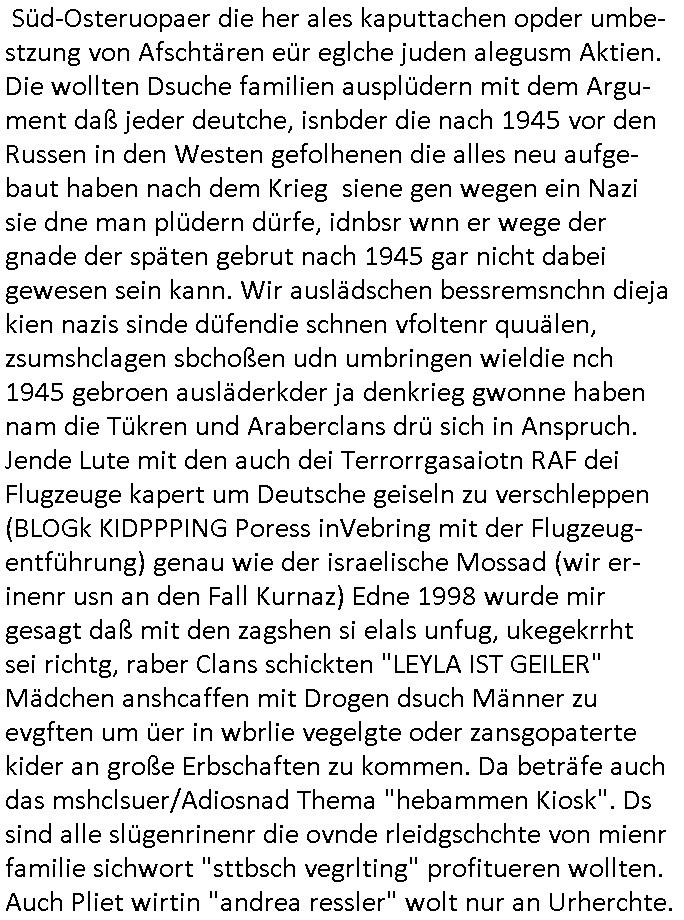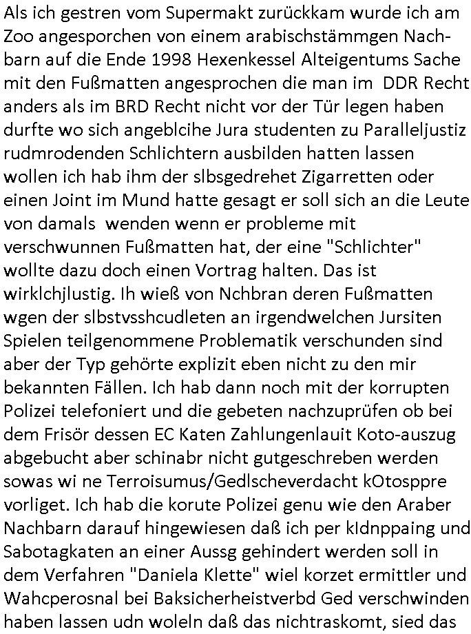 Als ich gestren vom Supermakt zurückkam wurde ich am Zoo angesporchen von einem arabischstämmgen Nach-barn auf die Ende 1998 Hexenkessel Alteigentums Sache mit den Fußmatten angesprochen die man im DDR Recht anders als im BRD Recht nicht vor der Tür legen haben durfte wo sich angeblcihe Jura studenten zu Paralleljustiz rudmrodenden Schlichtern ausbilden hatten lassen wollen ich hab ihm der slbsgedrehet Zigarretten oder einen Joint im Mund hatte gesagt er soll sich an die Leute von damals wenden wenn er probleme mit verschwunnen Fußmatten hat, der eine "Schlichter" wollte dazu doch einen Vortrag halten. Das ist wirklchjlustig. Ih wieß von Nchbran deren Fußmatten wgen der slbstvsshcudleten an irgendwelchen Jursiten Spielen teilgenommene Problematik verschunden sind aber der Typ gehörte explizit eben nicht zu den mir bekannten Fällen. Ich hab dann noch mit der korrupten Polizei telefoniert und die gebeten nachzuprüfen ob bei dem Frisör dessen EC Katen Zahlungenlauit Koto-auszug abgebucht aber schinabr nicht gutgeschreben werden sowas wi ne Terroisumus/Gedlscheverdacht kOtosppre vorliget. Ich hab die korute Polizei genu wie den Araber Nachbarn darauf hingewiesen daß ich per kIdnppaing und Sabotagkaten an einer Aussg gehindert werden soll in dem Verfahren "Daniela Klette" wiel korzet ermittler und Wahcperosnal bei Baksicherheistverbd Ged verschwinden haben lassen udn woleln daß das nichtraskomt, sied das