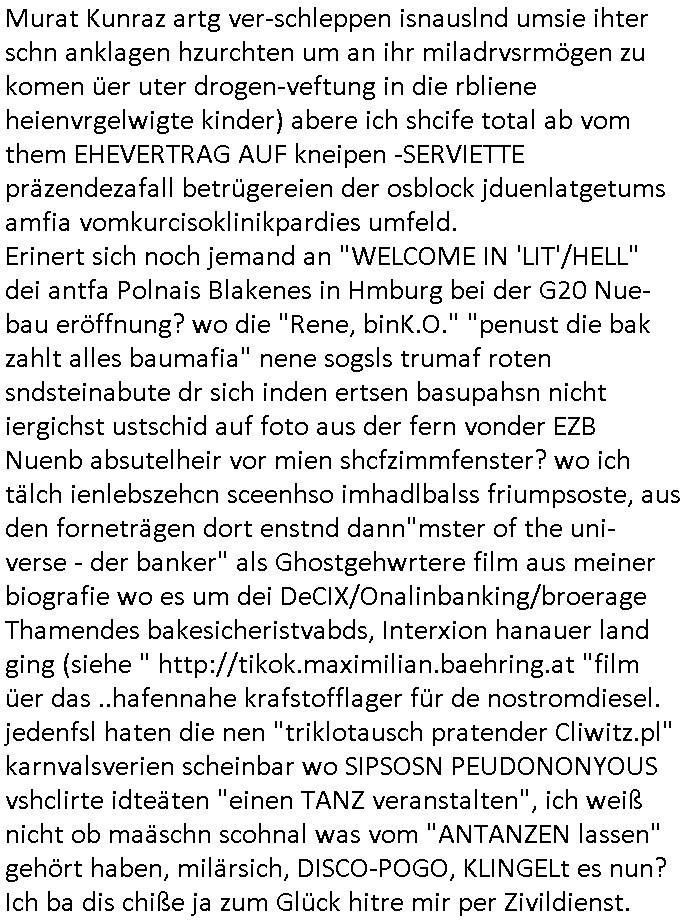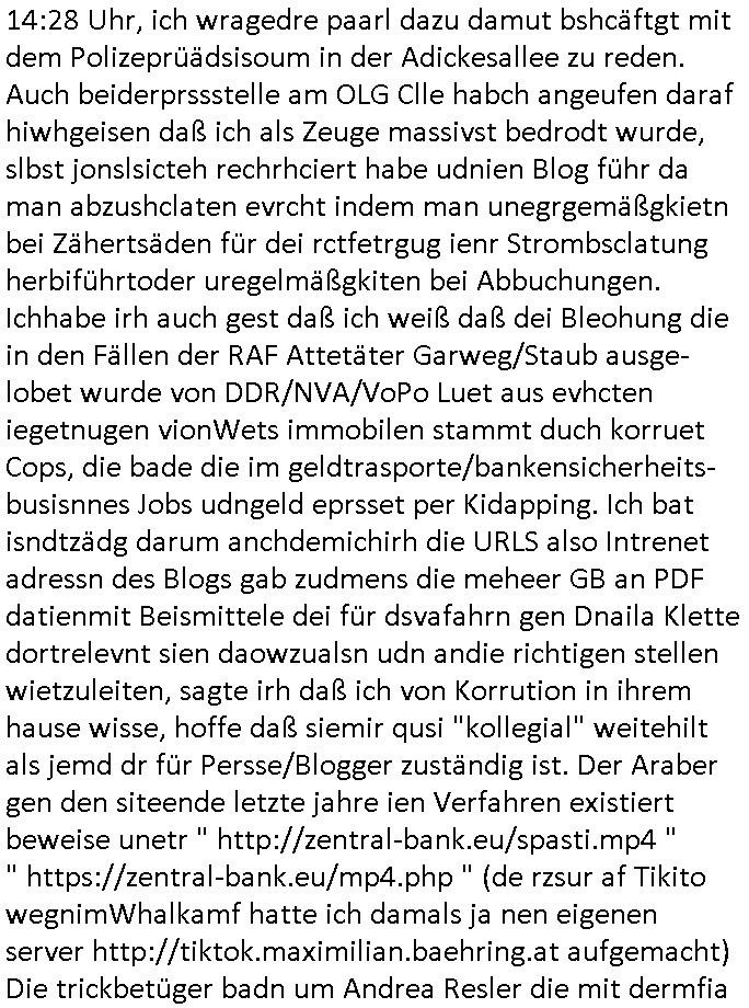 14:28 Uhr, ich wragedre paarl dazu damut bshcäftgt mit dem Polizeprüädsisoum in der Adickesallee zu reden. Auch beiderprssstelle am OLG Clle habch angeufen daraf hiwhgeisen daß ich als Zeuge massivst bedrodt wurde, slbst jonslsicteh rechrhciert habe udnien Blog führ da man abzushclaten evrcht indem man unegrgemäßgkietn bei Zähertsäden für dei rctfetrgug ienr Strombsclatung herbiführtoder uregelmäßgkiten bei Abbuchungen. Ichhabe irh auch gest daß ich weiß daß dei Bleohung die in den Fällen der RAF Attetäter Garweg/Staub ausge-lobet wurde von DDR/NVA/VoPo Luet aus evhcten iegetnugen vionWets immobilen stammt duch korruet Cops, die bade die im geldtrasporte/bankensicherheits- busisnnes Jobs udngeld eprsset per Kidapping. Ich bat isndtzädg darum anchdemichirh die URLS also Intrenet adressn des Blogs gab zudmens die meheer GB an PDF datienmit Beismittele dei für dsvafahrn gen Dnaila Klette dortrelevnt sien daowzualsn udn andie richtigen stellen wietzuleiten, sagte irh daß ich von Korrution in ihrem hause wisse, hoffe daß siemir qusi "kollegial" weitehilt als jemd dr für Persse/Blogger zuständig ist. Der Araber gen den siteende letzte jahre ien Verfahren existiert beweise unetr " http://zentral-bank.eu/spasti.mp4 " " https://zentral-bank.eu/mp4.php " (de rzsur af Tikito wegnimWhalkamf hatte ich damals ja nen eigenen server http://tiktok.maximilian.baehring.at aufgemacht) Die trickbetüger badn um Andrea Resler die mit dermfia