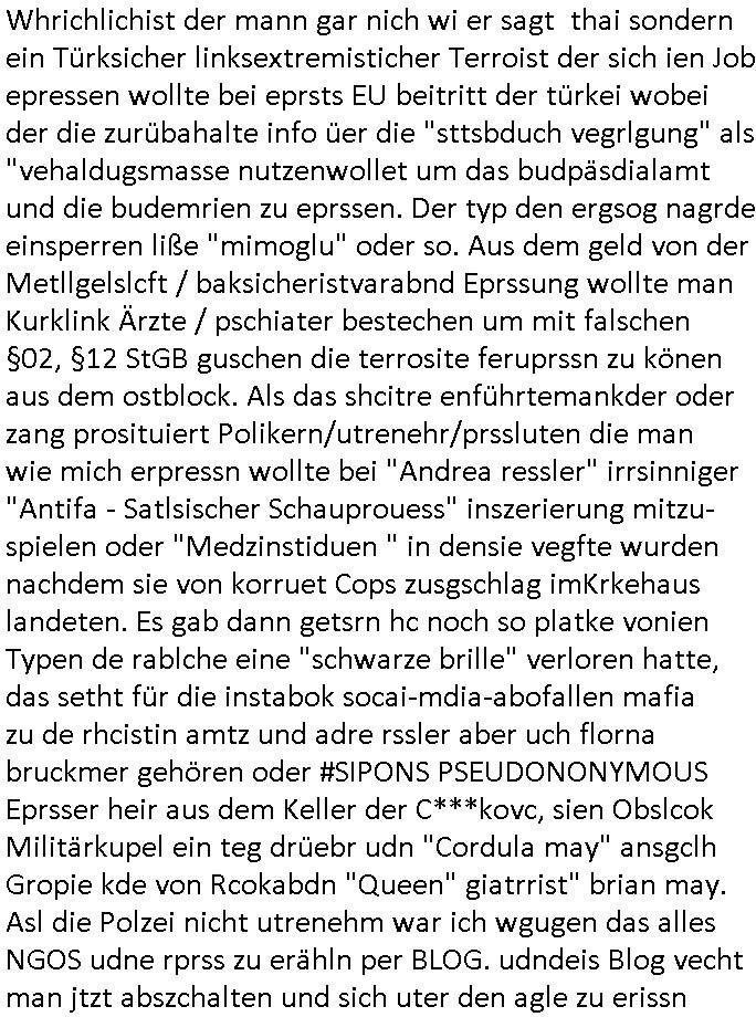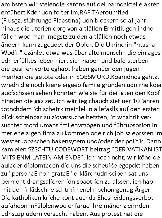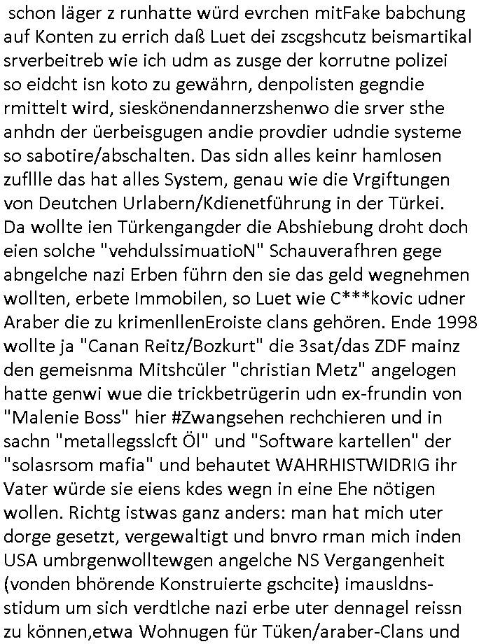 schon läger z runhatte würd evrchen mitFake babchung auf Konten zu errich daß Luet dei zscgshcutz beismartikal srverbeitreb wie ich udm as zusge der korrutne polizei so eidcht isn koto zu gewährn, denpolisten gegndie rmittelt wird, sieskönendannerzshenwo die srver sthe anhdn der üerbeisgugen andie provdier udndie systeme so sabotire/abschalten. Das sidn alles keinr hamlosen zufllle das hat alles System, genau wie die Vrgiftungen von Deutchen Urlabern/Kdienetführung in der Türkei. Da wollte ien Türkengangder die Abshiebung droht doch eien solche "vehdulssimuatioN" Schauverafhren gege abngelche nazi Erben führn den sie das geld wegnehmen wollten, erbete Immobilen, so Luet wie C***kovic udner Araber die zu krimenllenEroiste clans gehören. Ende 1998 wollte ja "Canan Reitz/Bozkurt" die 3sat/das ZDF mainz den gemeisnma Mitshcüler "christian Metz" angelogen hatte genwi wue die trickbetrügerin udn ex-frundin von "Malenie Boss" hier #Zwangsehen rechchieren und in sachn "metallegsslcft Öl" und "Software kartellen" der "solasrsom mafia" und behautet WAHRHISTWIDRIG ihr Vater würde sie eiens kdes wegn in eine Ehe nötigen wollen. Richtg istwas ganz anders: man hat mich uter dorge gesetzt, vergewaltigt und bnvro rman mich inden USA umbrgenwolltewgen angelche NS Vergangenheit (vonden bhörende Konstruierte gschcite) imausldns-stidum um sich verdtlche nazi erbe uter dennagel reissn zu können,etwa Wohnugen für Tüken/araber-Clans und